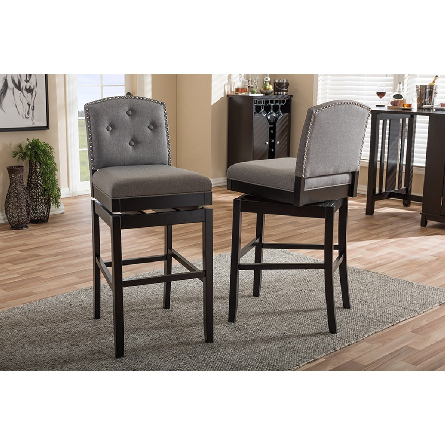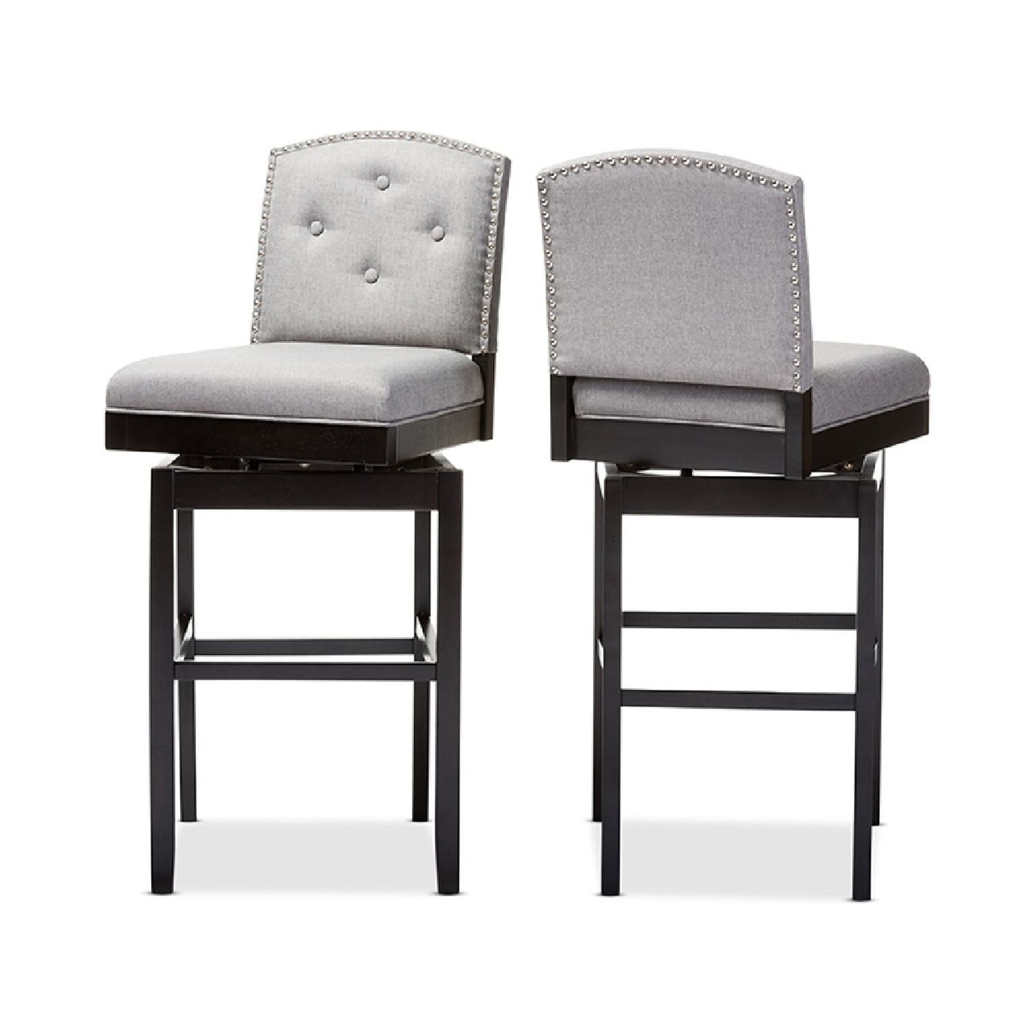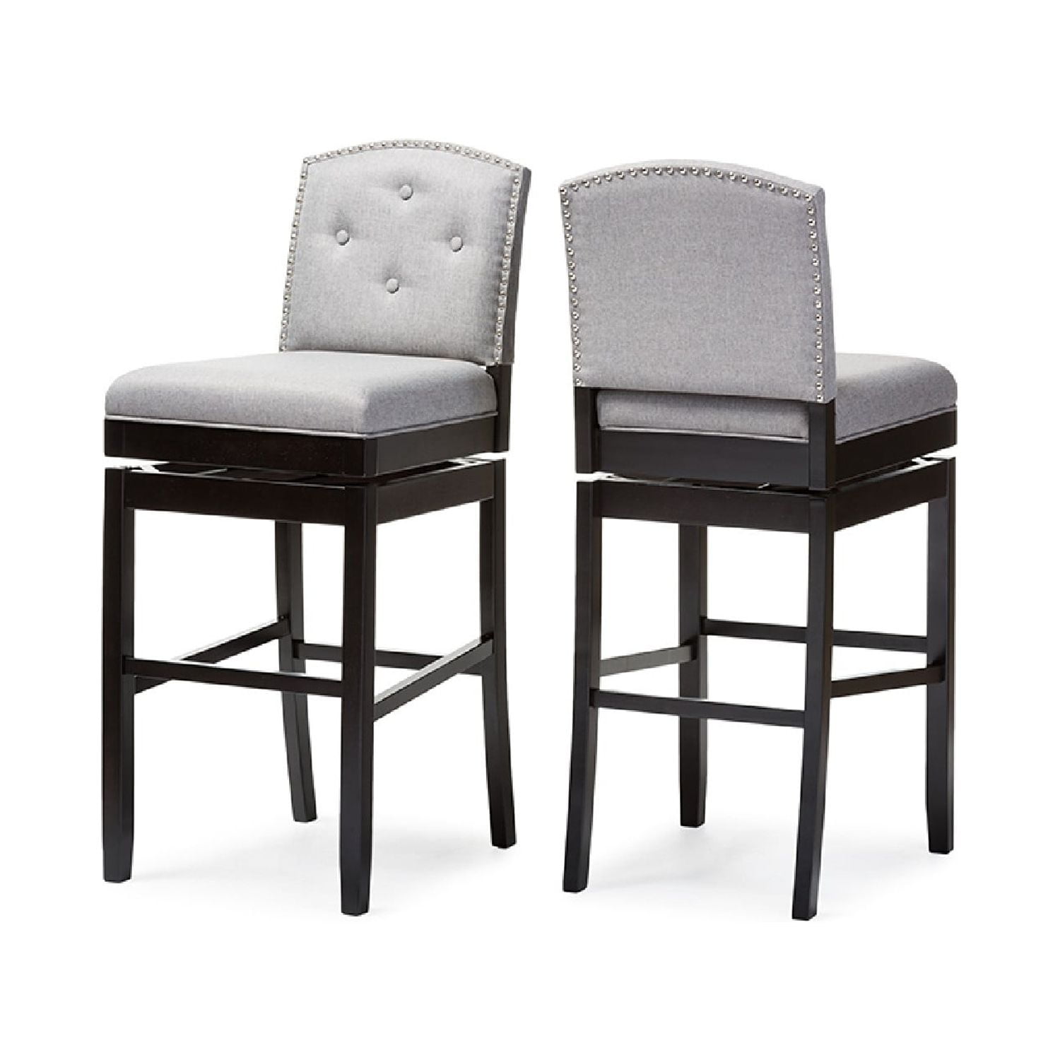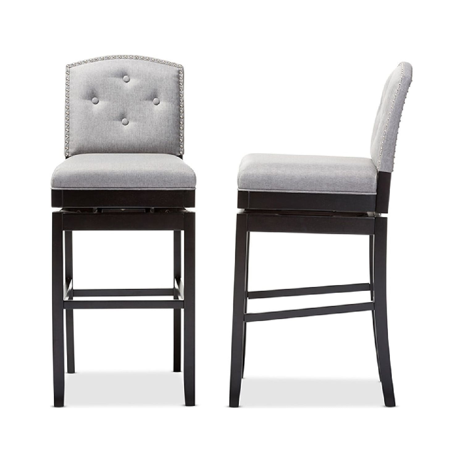 Baxton Studio Ginaro Modern and Contemporary Grey Fabric Button-tufted Upholstered Swivel Bar Stool (Set of 2) The Ginaro Bar Stool is an ideal choice for any modern bar or pub – providing a comfortable seat at a height! An elegant and sophisticated bar stool with button-tufting design, the Ginaro features curved back with silver nail heads trim on the seat back for a contemporary look. The detailed piping around the seat cushion showcases the clean lines while the tapered legs enhanced with wooden stretchers for durability. Fully upholstered in grey polyester fabric with comfortable foam padding, the Ginaro would fit extremely well in a home bar or restaurant bar environment. A swivel plate connects the base and the seat for easy maneuverability. Made in Malaysia, the bar stool requires assembly. Specifications: Modern and contemporary bar stool Fully upholstered back and seat Tapered legs with stretcher support Upholstered in grey fabric and padded with foam Metal swivel plate for easy maneuverability Upholstered in grey fabric and padded with foam