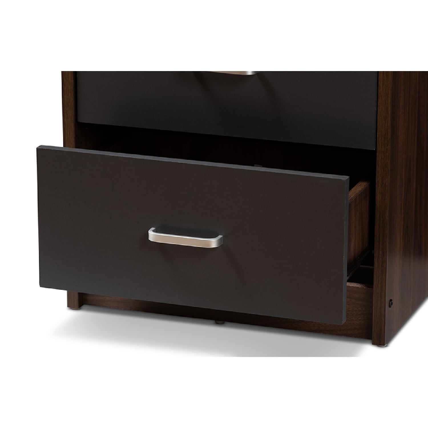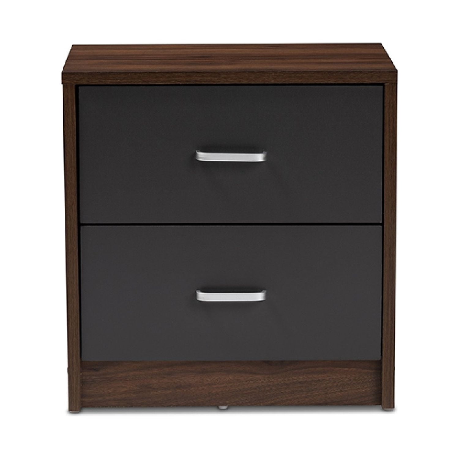 Modern and contemporary nightstand Brown and dark grey two-tone finished engineered wood Two drawers Square silhouette Silver, powder-coated handles Assembly required Made in Malaysia