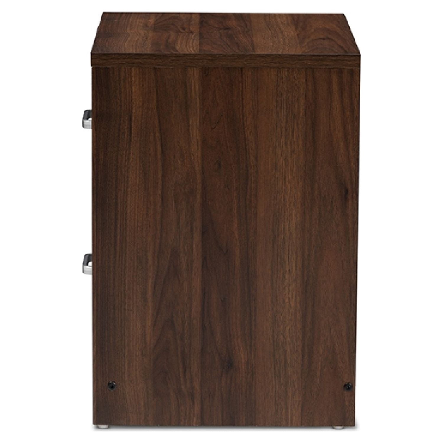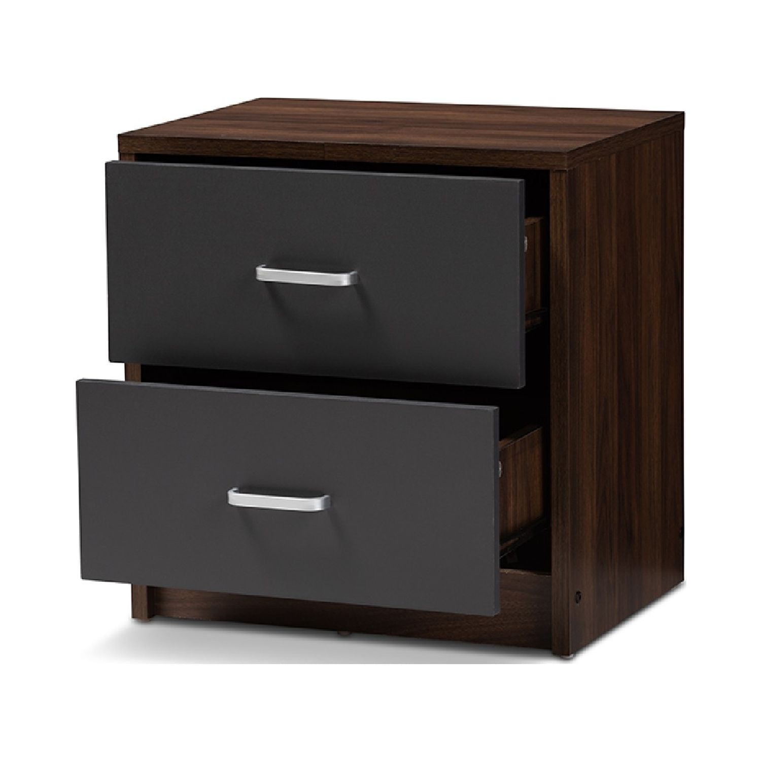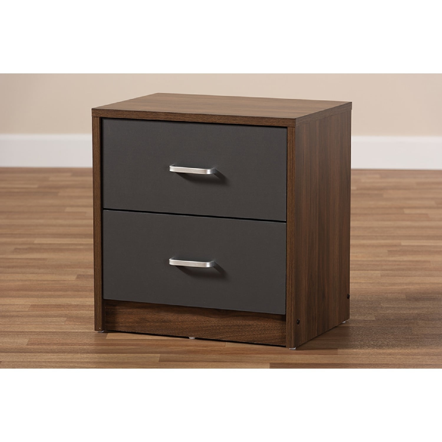 Baxton Studio Hansel Modern and Contemporary 2-Drawer Dark Brown and Dark Grey Finished Nightstand The handsome, minimalist Hansel 2-drawer nightstand will bring a striking presence to your bedside. The smooth, square silhouette is indicative of its modern and contemporary-inspired design. The Hansels engineered wood frame is finished in a dark brown, with the face of its drawer finished in dark grey for a two-tone look. The nightstand features two pull-out drawers for convenient bedside storage. The silver, powder-coated finished drawer handles sharply complement the brown and grey finish of the Hansel. Add a smart, executive vibe to your bedroom or guest room with this nightstand. Made in Malaysia, the Hansel requires assembly. Specifications: Modern and contemporary nightstand Brown and dark grey two-tone finished engineered wood Two drawers Square silhouette Silver, powder-coated handles Assembly required Made in Malaysia