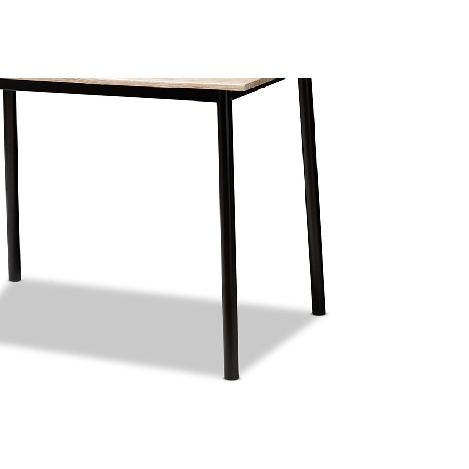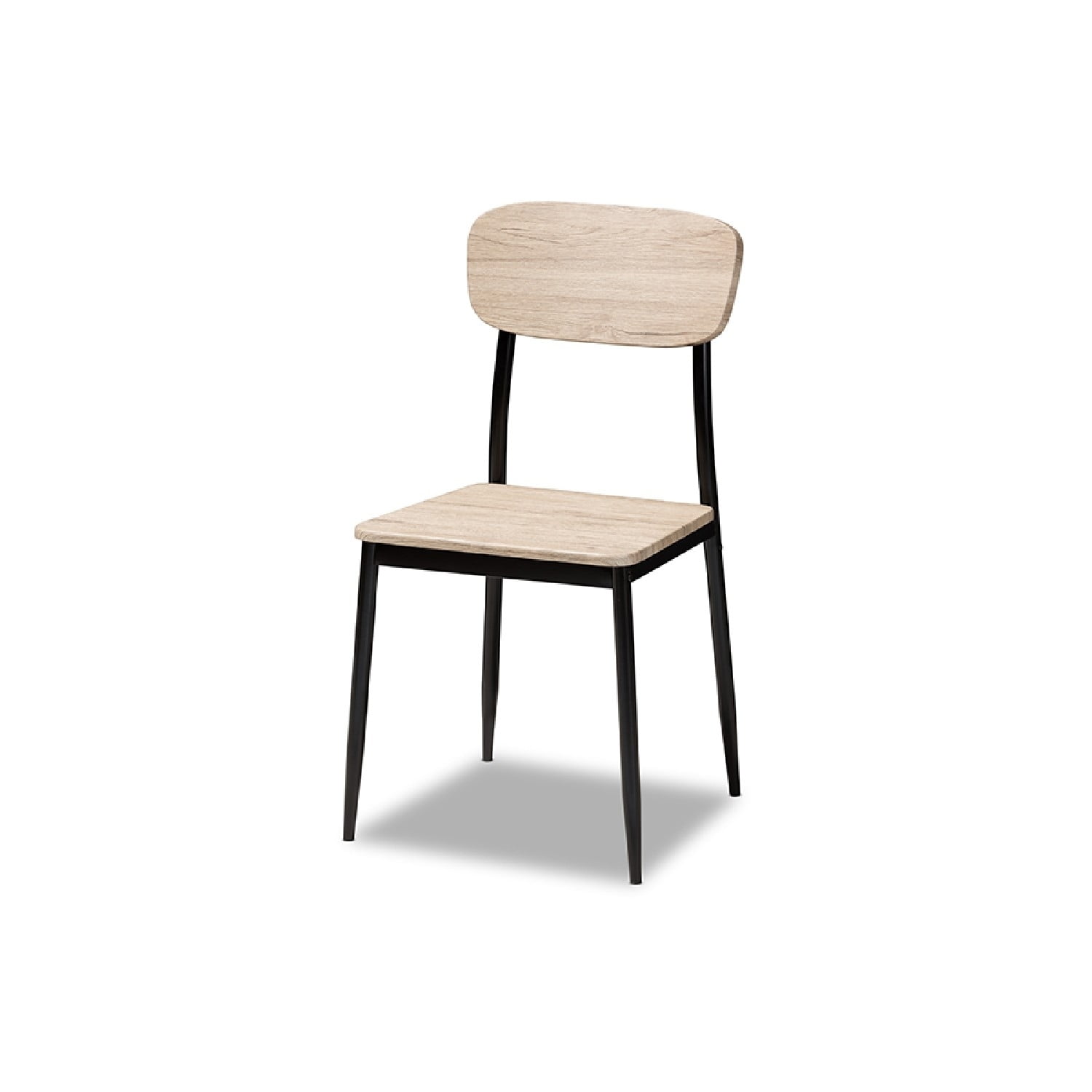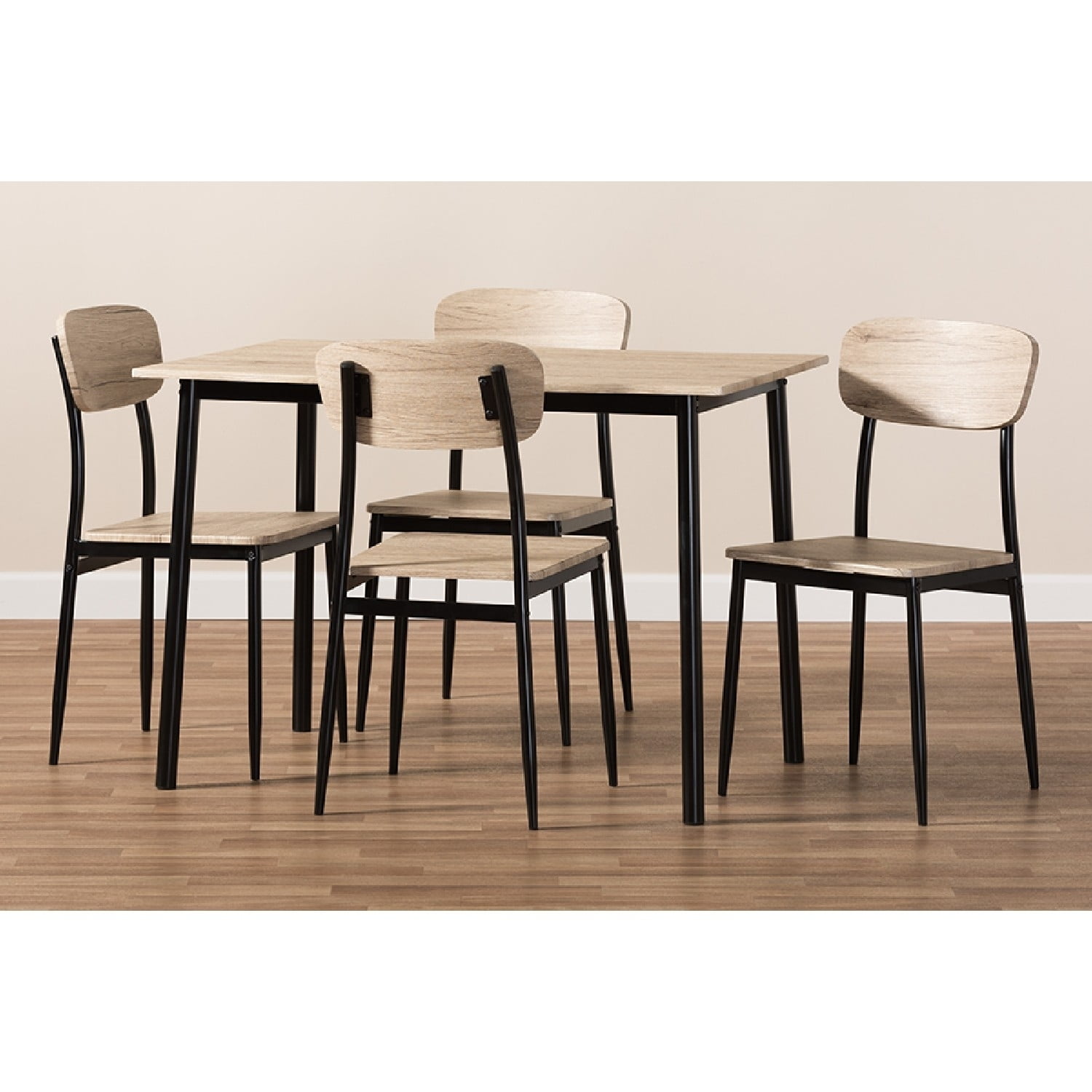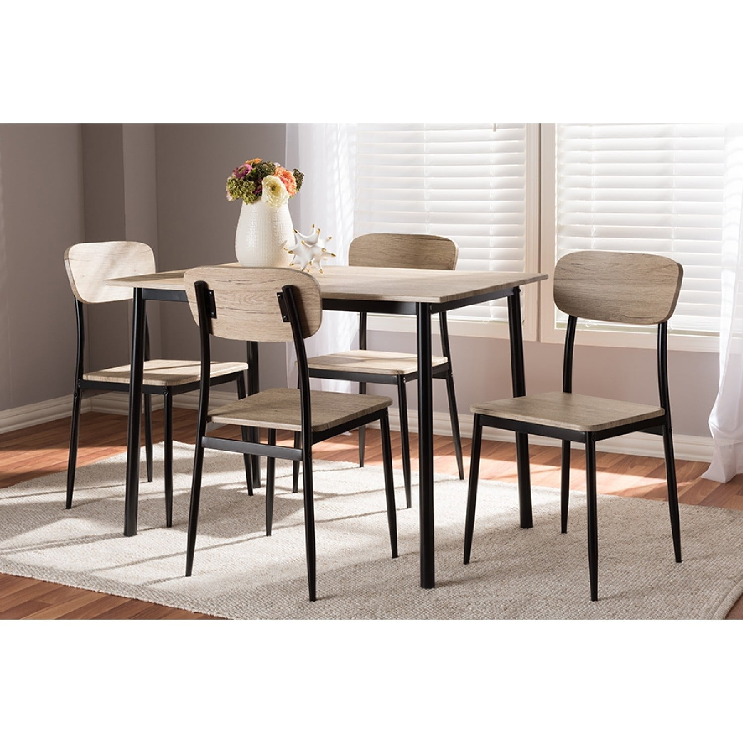 Baxton Studio Honore Mid-Century Modern Light Brown Wood Finished Matte Black Frame 5-Piece Dining Set The Honore 5-piece dining set packs a great deal of style without taking up a ton of space. The mid-century modern-inspired design also has elements of rustic and industrial style, evident in the contrast of colors in the set. The dining table features a table top in light brown wood finishing, which matches the finish of the chair backs and seats. The frames of the chairs and table are constructed of sturdy metal, finished in a handsome matte black. The chair backs of the Honore are slightly curved to contour with the seater, encouraging hours of comfortable seating. The legs of the chairs taper stylishly towards the floor. One of the best features of the Honore dining set is that all four chairs and the dining table ship together in one box for convenience. Add this charming set to your dining room, breakfast nook, or other shared spaces. Made in China, the Honore requires assembly. Specifications: Mid-century modern 5-piece dining set Light brown wood finishing Black, matte finished legs Curved, open chair back design Table and chairs come together in one box Assembly required Made in China