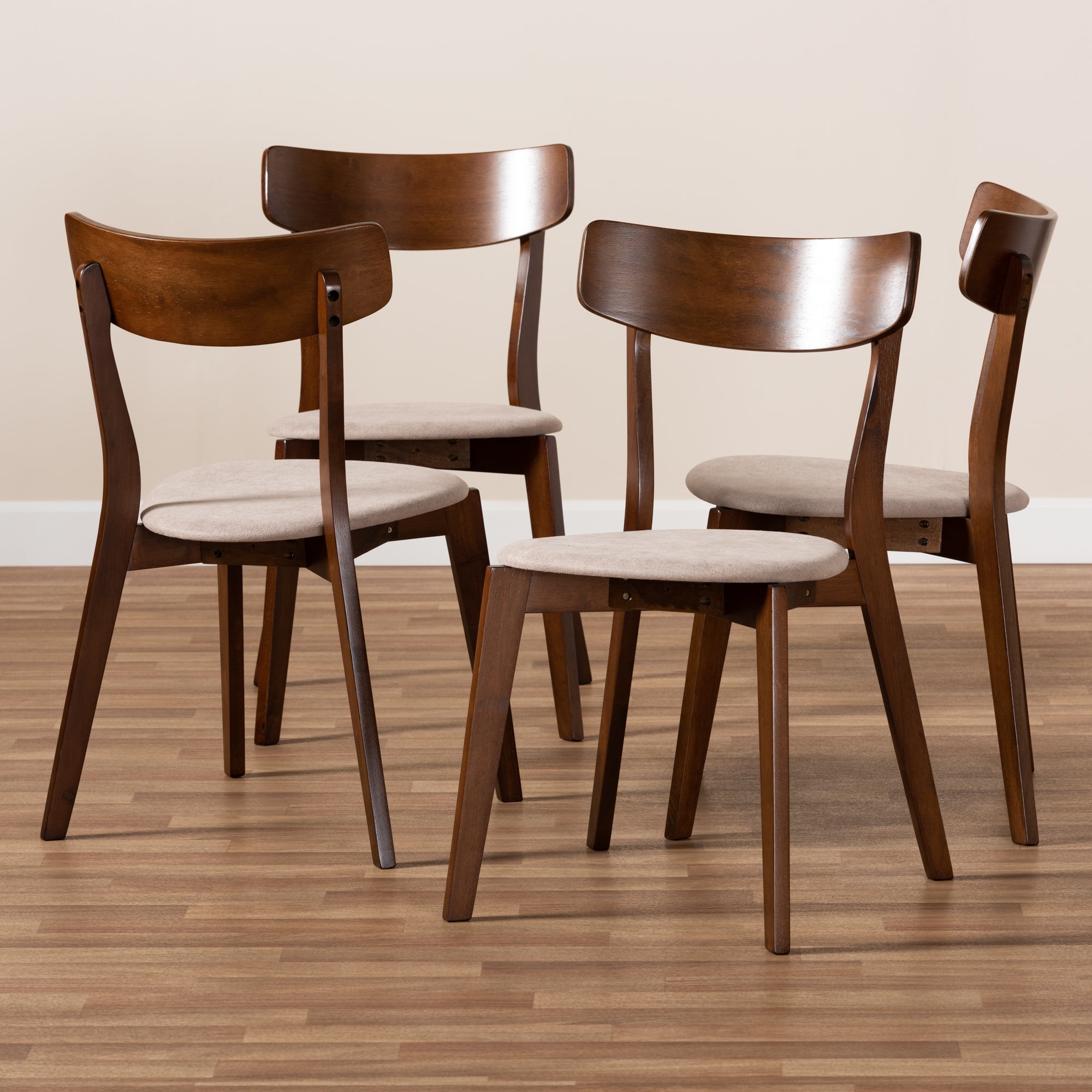 Baxton Studio Iora Mid-Century Modern Transitional Light Beige Fabric Upholstered and Walnut Brown Finished Wood 4-Piece Dining Chair Set: Set includes four (4) dining chairs Constructed from rubberwood Walnut brown finish Upholstered in polyester fabric and padded with foam Splayed legs Assembly required Made in Malaysia