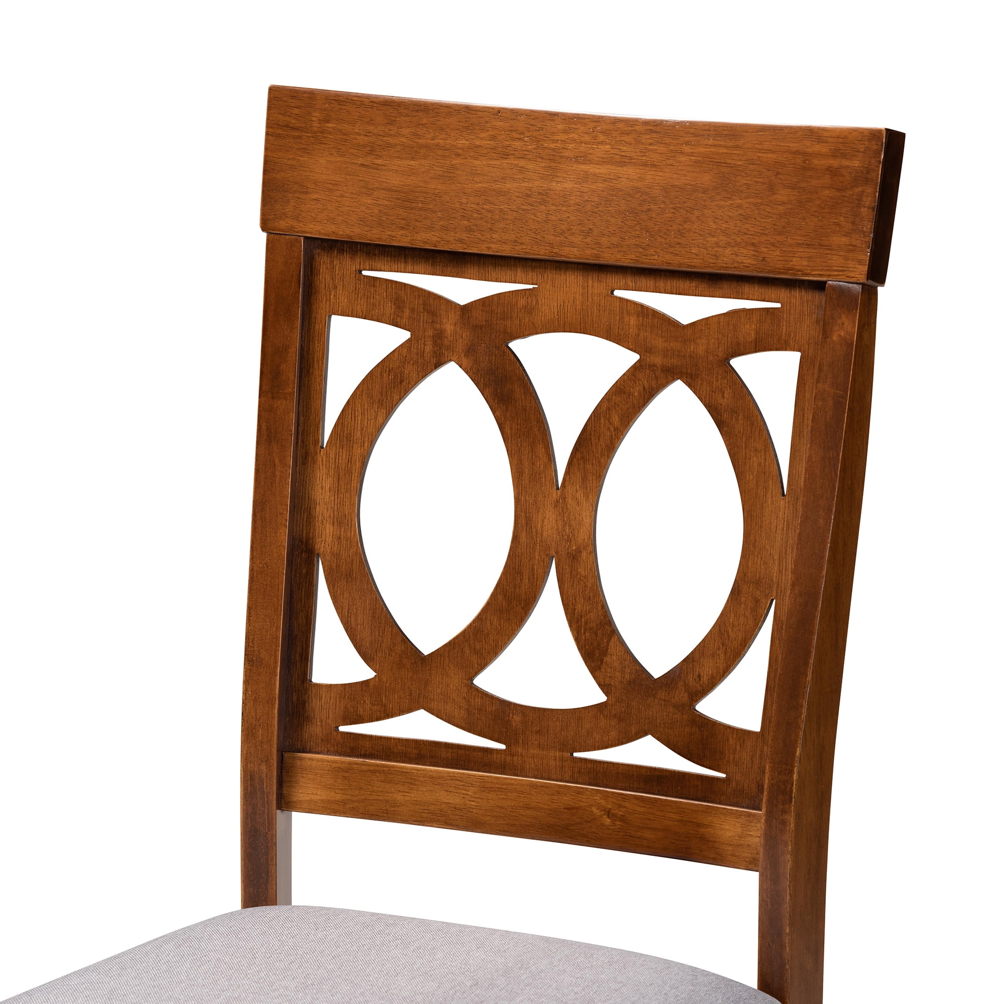 • Set includes four (4) dining chairs and one table • Constructed from oak wood, rubberwood, and MDF wood • Walnut brown finish • Upholstered in Upholstered in polyester fabric and padded with foam • Cut-out back design • Round tabletop • Assembly required • Product Weight: 85 Pound • Package Weight: 93.8 Pound • Table Dimensions: 29.9″ High x 35.4″ Wide x 35.4″ Deep; Legs: 29.1″ High; Chair Dimensions: 38.6″ high x 17.9″ wide x 22″ Deep; Seating Dimensions: 18.7″ Wide x 15.7″ Deep x 17.9″ High (from Floor); Legs: 16.9″ High; • Product Color: Grey/Walnut • Product Composition: Fabric Polyester 100%/Oak/Foam