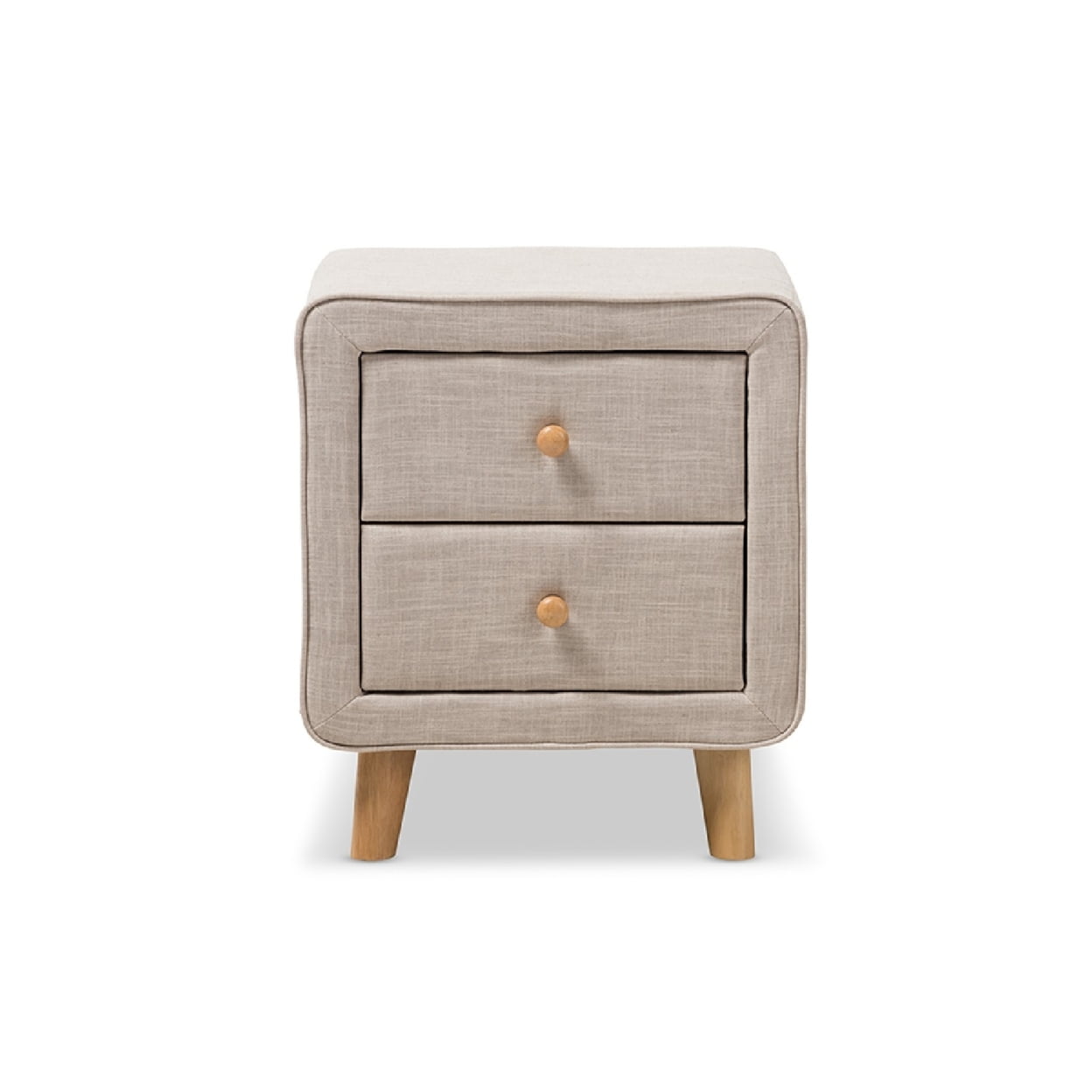 Baxton Studio Jonesy Mid-Century Beige Linen Upholstered 2-Drawer Nightstand Featuring mid-century design, the Jonesy fabric upholstered 2-drawer nightstand perfectly complements the Jonesy fabric upholstered platform bed. Luxuriously upholstery as its bed counterpart, this stylish nightstand adds a modern and minimalist vibe to your room. Constructed of hardwood and plywood frame, the Jonesy is upholstered in beige mixed-linen fabric for every days use. This gorgeous nightstand features two easy-sliding drawers with wooden knobs in natural finishing for easy access. The splayed legs, angularly shaped complement the nightstand for retro vibes. The drawers are adequately sized to store bedside essentials and other knick-knacks for a streamlined, clutter-free room. Combining fine exquisite materials and excellent craftsmanship, this nightstand presents a great investment for your bedroom. Made in Malaysia, the nightstand requires minor assembly. Specifications: Mid-Century nightstand Polyester fabric upholstery Two drawers, each with natural oak buttons drawer pulls Natural oak buttons drawer pulls Splayed wooden legs Assembly required Made in Malaysia