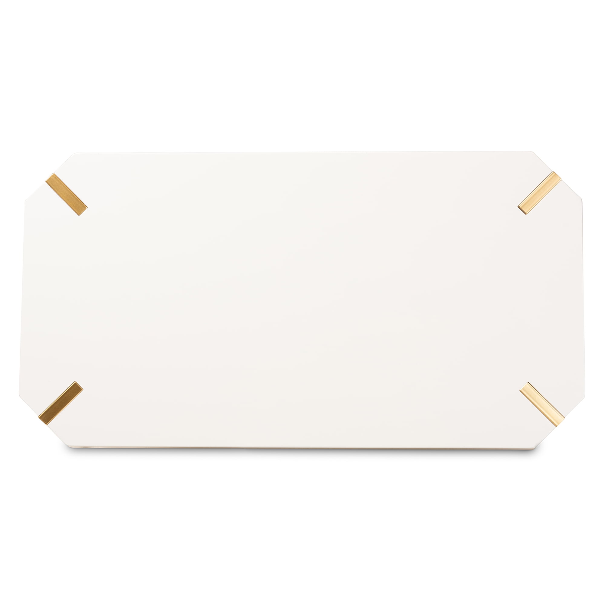 • Contemporary glam and luxe coffee table • Constructed from metal and engineered wood • White and brushed gold finish • Rectangular tabletop • Angled legs • Assembly required • Made in China • Product Weight: 31.3 Pound • Package Weight: 33.5 Pound • Dimensions: 18″ High x 43.5″ Wide x 23″ Deep; Legs: 15.4″ High; • Product Color: White/Gold • Product Composition: MDF/Metal