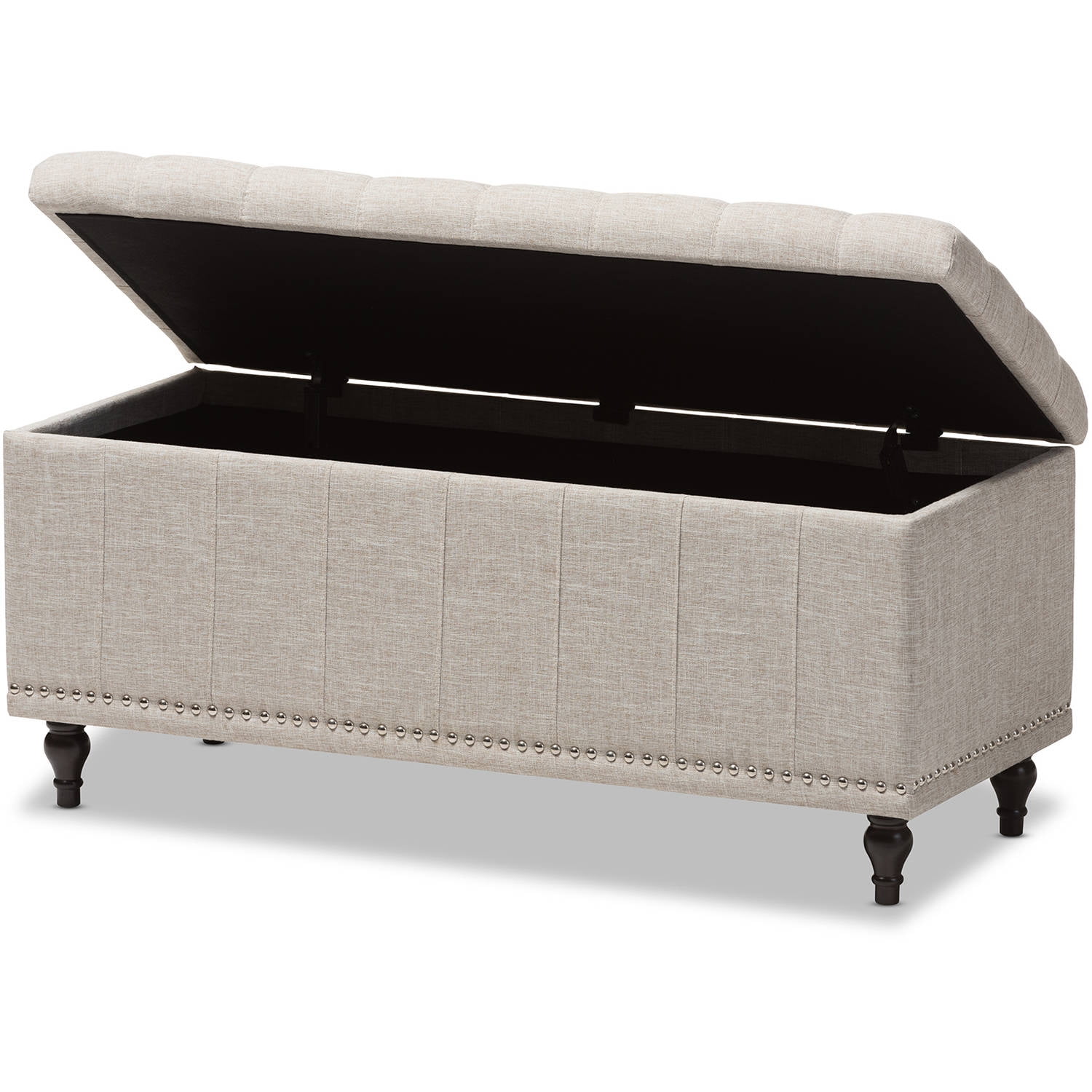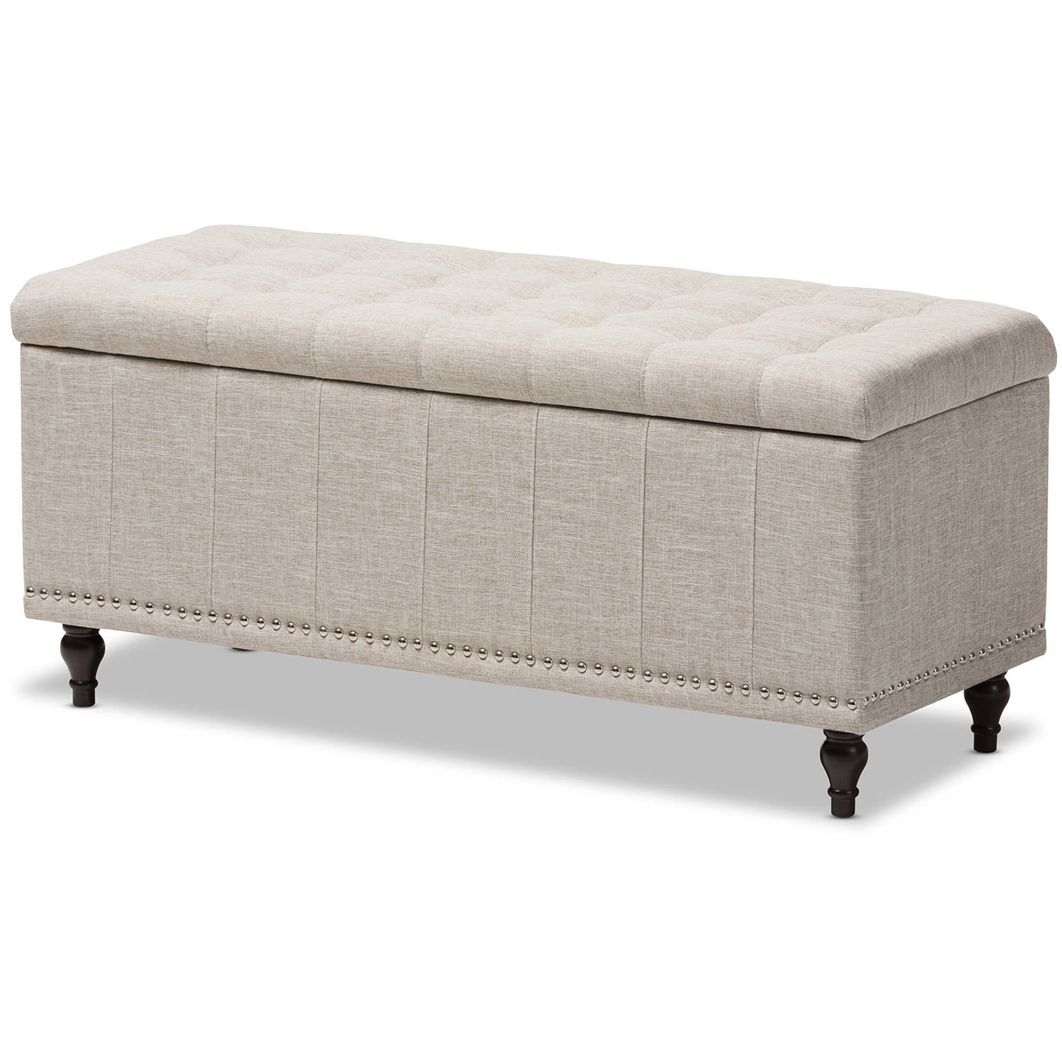 Baxton Studio Kaylee Modern Classic Beige Fabric Upholstered Button-Tufting Storage Ottoman Bench Whether paired with upholstered bed as a bed end bench or simply on its own, this modern classic button-upholstered storage ottoman offers classic and smart interiors styling with practical internal storage that will work in any room. Add an on-trend neutral accent to a simple white room, the Kaylee storage ottoman bench is upholstered in polyester fabric available in your choice of beige, greyish beige, dark grey or light blue color for a neutral or statement look. Constructed of solid rubberwood frame and feet, the Kaylee is built to last. The ottoman box opens up to reveal internal storage for blankets and bed linen. Softly padded, the top of the lid features button-tufting with grid lines while the sides are trim with silver nail heads for a modern look. For refined elegance, the detailed stitching on all sides and the classic feet complete the look. Made in Malaysia, the Kaylee storage ottoman bench requires minor legs assembly Specifications: Modern and contemporary storage ottoman bench Upholstered in polyester fabric Button-tufting with silver nail heads trim Black solid wood legs Made in Malaysia Minor legs assembly required