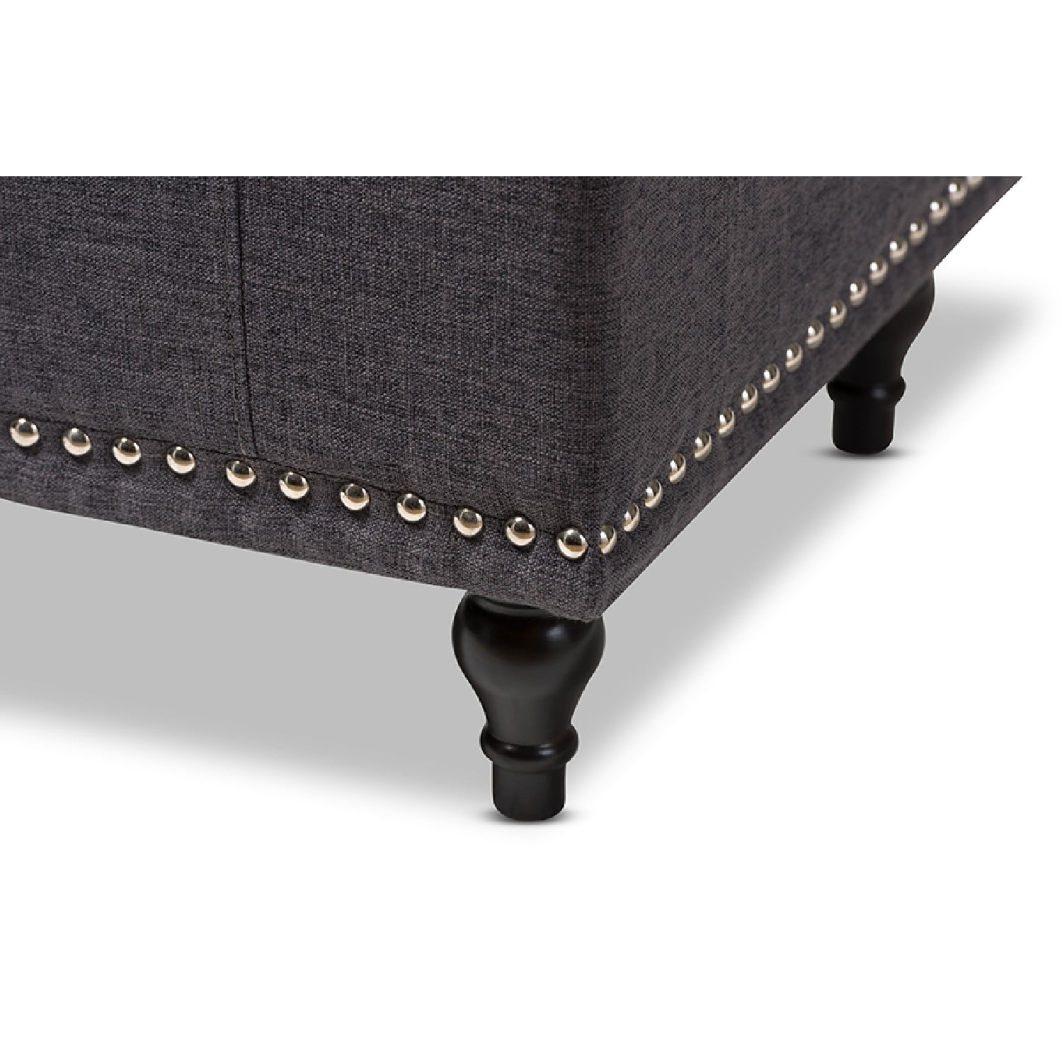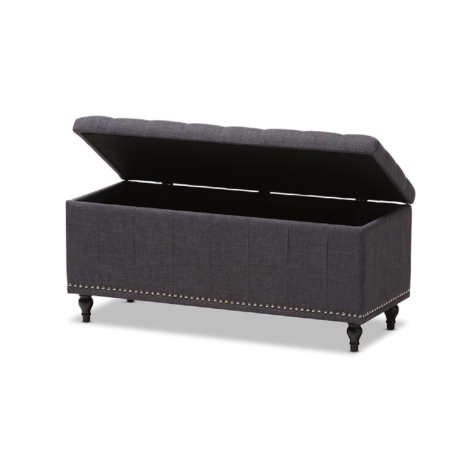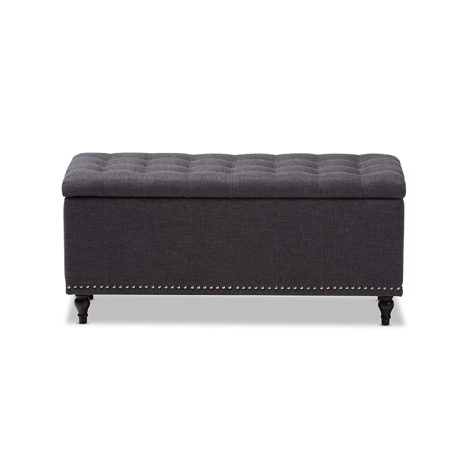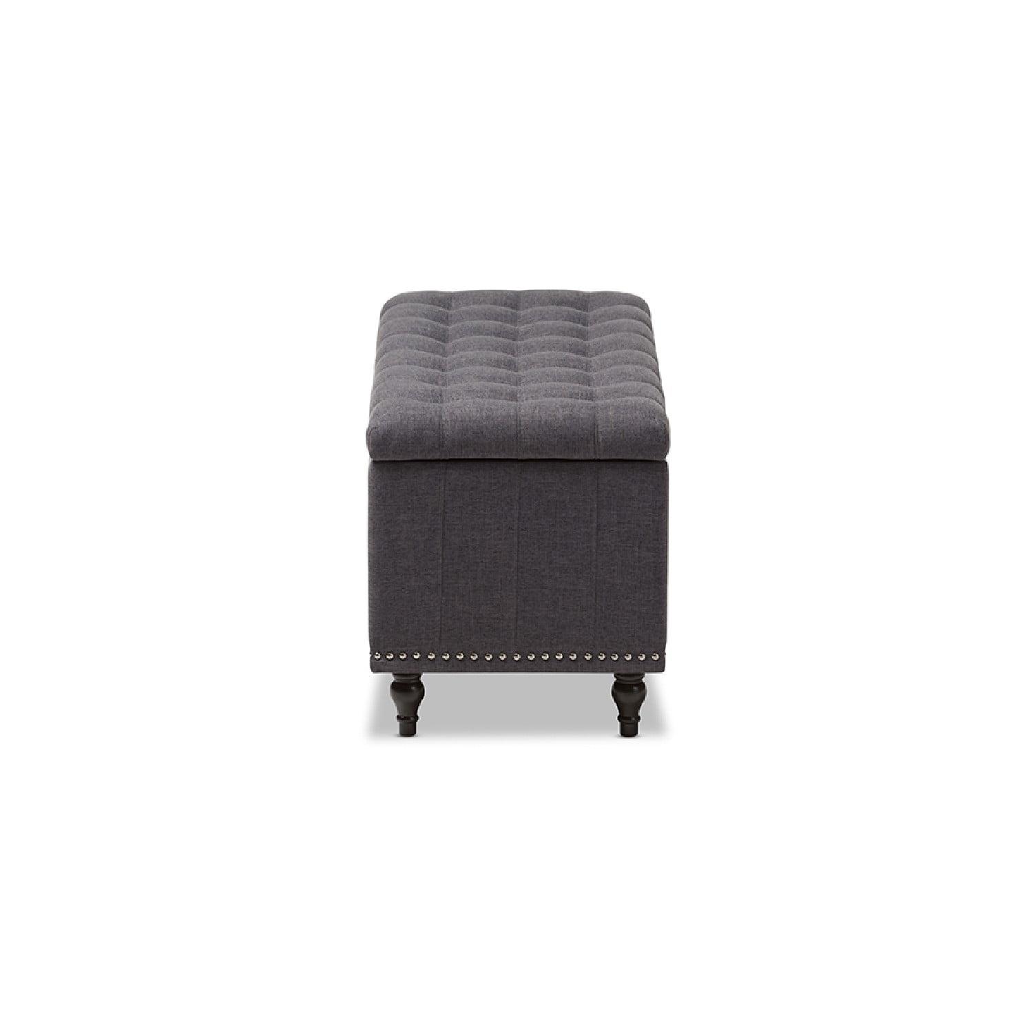 Baxton Studio Kaylee Modern Classic Dark Grey Fabric Upholstered Button-Tufting Storage Ottoman Bench Whether paired with upholstered bed as a bed end bench or simply on its own, this modern classic button-upholstered storage ottoman offers classic and smart interiors styling with practical internal storage that will work in any room. Add an on-trend neutral accent to a simple white room, the Kaylee storage ottoman bench is upholstered in polyester fabric available in your choice of beige, greyish beige, dark grey or light blue color for a neutral or statement look. Constructed of solid rubberwood frame and feet, the Kaylee is built to last. The ottoman box opens up to reveal internal storage for blankets and bed linen. Softly padded, the top of the lid features button-tufting with grid lines while the sides are trim with silver nail heads for a modern look. For refined elegance, the detailed stitching on all sides and the classic feet complete the look. Made in Malaysia, the Kaylee storage ottoman bench requires minor legs assembly Specifications: Modern and contemporary storage ottoman bench Upholstered in polyester fabric Grid-tufting Black solid wood legs Made in Malaysia Minor legs assembly required