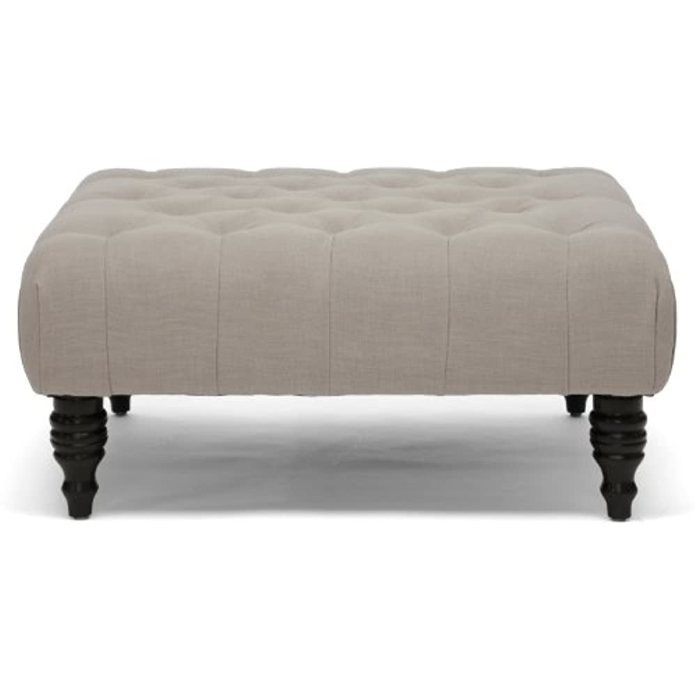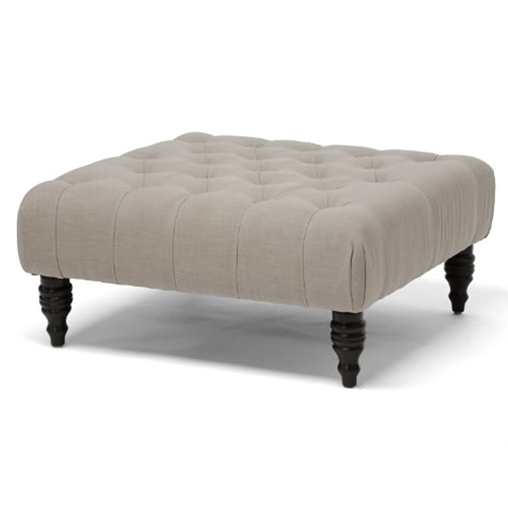 Baxton Studio Keswick Beige Linen Modern Tufted Ottoman Whether used as a modern coffee table, contemporary ottoman, or both, Keswick is a keeper. You will love the beautifully button-tufted beige linen upholstery and the black turned wood legs. Made in China with a eucalyptus wood frame and polyurethane foam cushioning, this upholstered ottoman requires assembly and should be spot cleaned. A dark gray linen option of this style is also offered (sold separately). Dimensions: 15.5 inches high x 35 inches wide x 35 inches long Specifications: Beige linen with button tufting Eucalyptus wood frame Polyurethane foam padding