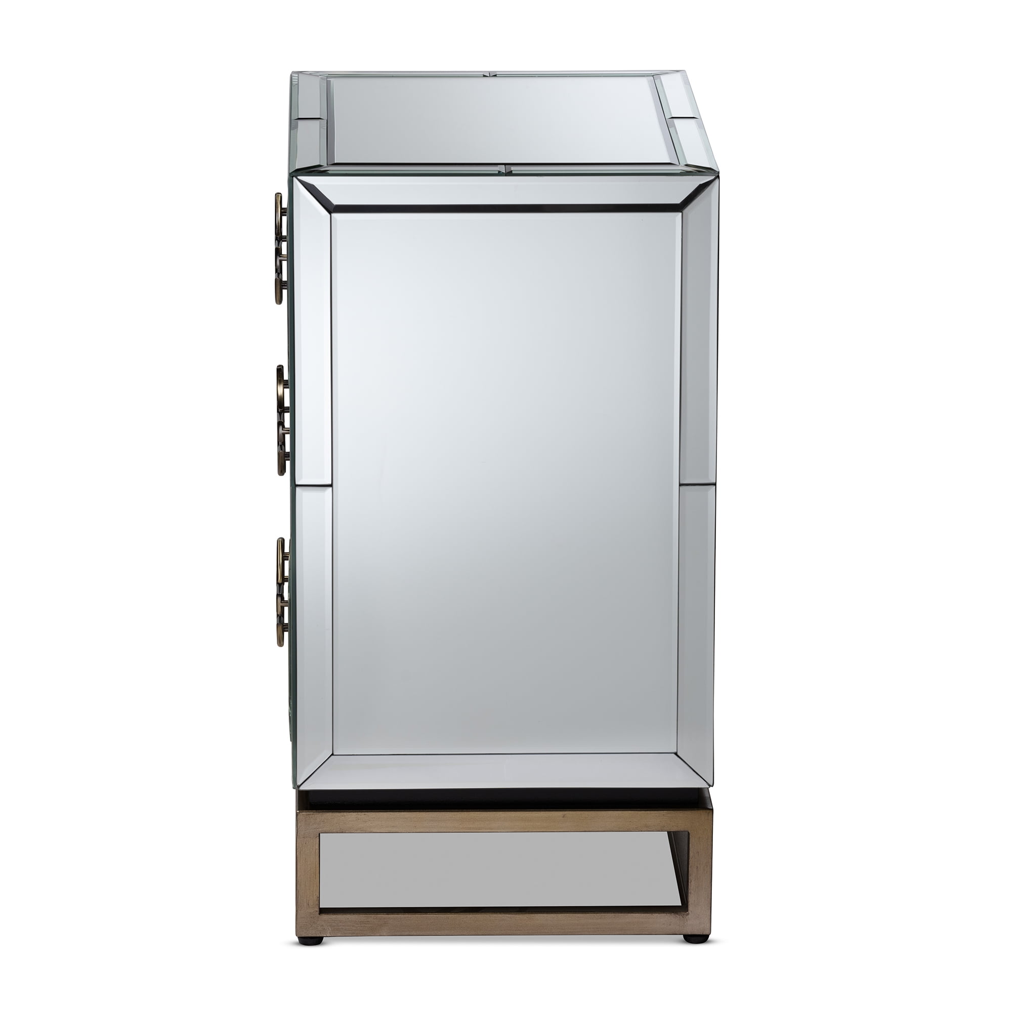 Add glamorous style to your interior with the stunning design of the Laken end table. Made in China, the Laken is comprised of a wood frame fitted with mirrored glass for a graceful aesthetic that adds beauty to any space. Three spacious drawers ornamented with intricately molded metal handles provide easy access to all your household essentials. Fully assembled, the end table features beveled edges and an antique bronze finished metal base for an added touch of glamour. An eye-catching design equipped with outstanding utility, the Laken end table is an exceptional addition to any space. Overall Dimensions: 26″ High x 20″ Wide x 14″ Deep; Legs: 4.5″High; Drawers: 15.50″ W x 11″ D x 4.50″ H