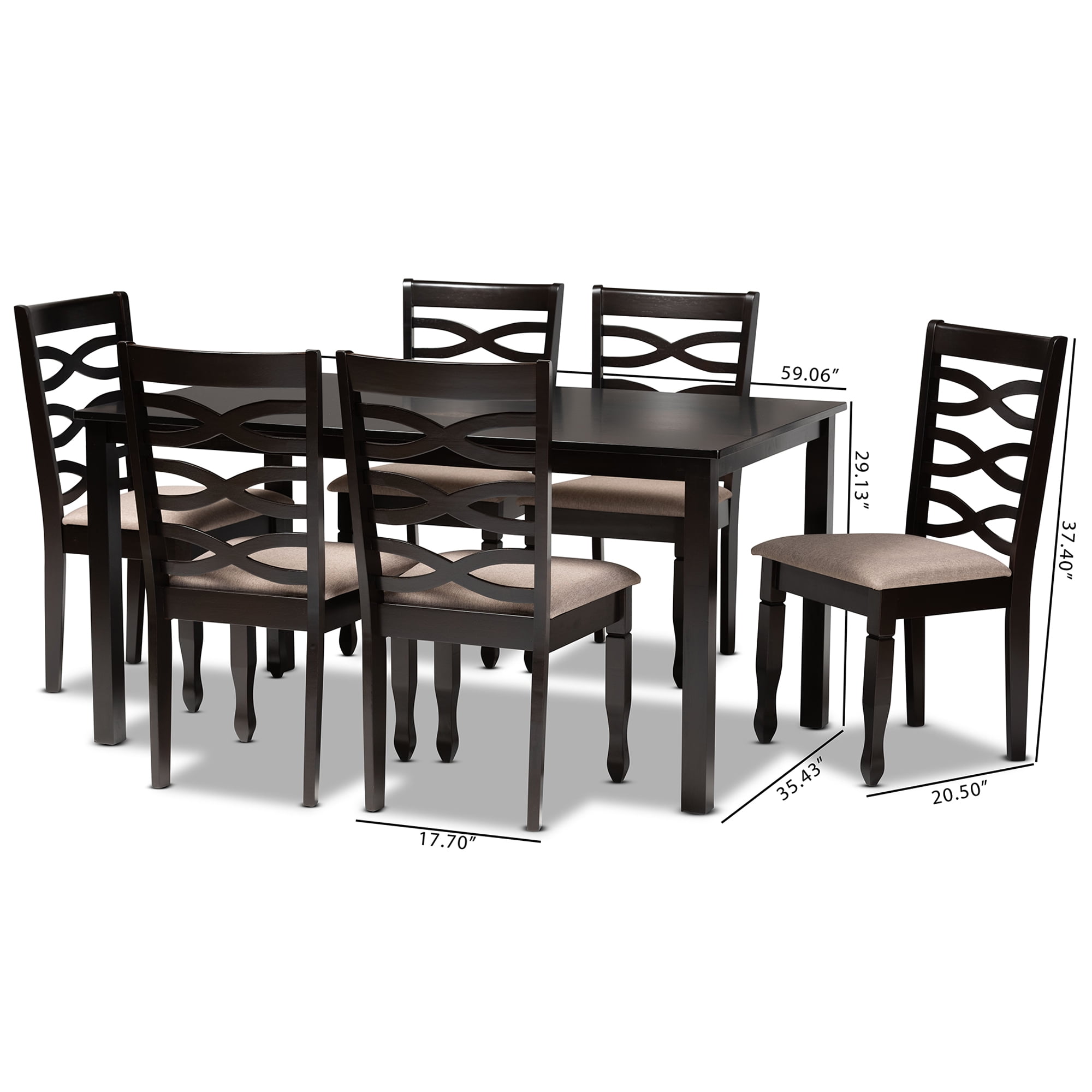 • Modern and contemporary dining set includes one (1) table and six (6) dining chairs • Constructed from oak wood, rubberwood, and MDF wood • Dark brown finish • Upholstered in polyester fabric and padded with foam • Cut-out back design • Assembly required • Made in Malaysia • Product Weight: 138.72 Pound • Package Weight: 157.94 Pound • Dimension: Chair Dimensions: 37.4″ high x 17.7″ wide x 20.9″ deep; Seating dimensions: 18.5″ wide x 16.1″ deep x 18.5″ high (from Floor); Back: 19.7″ high; Legs: 16.9″ high;; Table Dimensions: 29.13″ high x 59.06″ wide x 35.43″ deep; Legs: 28.35″ high; • Product Color: Sand/Dark Brown • Product Composition: Fabric Polyester 100%/Oak/MDF/Rubberwood/Foam