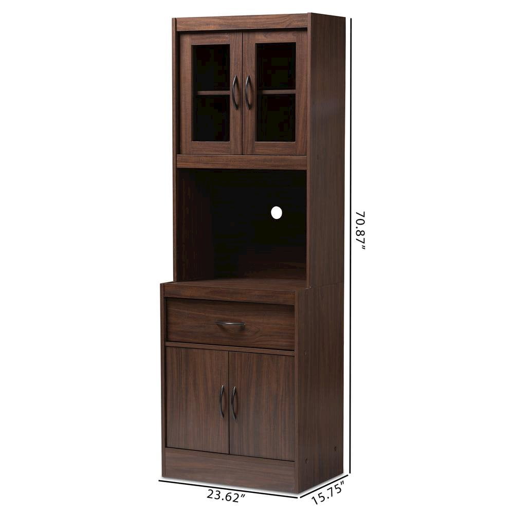 Finish: Walnut Dimensions: 23.62 in. (L) x 15.75 in. (W) x 70.87 in. (H) Recommended Location: Kitchen Color: Walnut Brown Style of drawers/doors: 2 cabinets and drawers