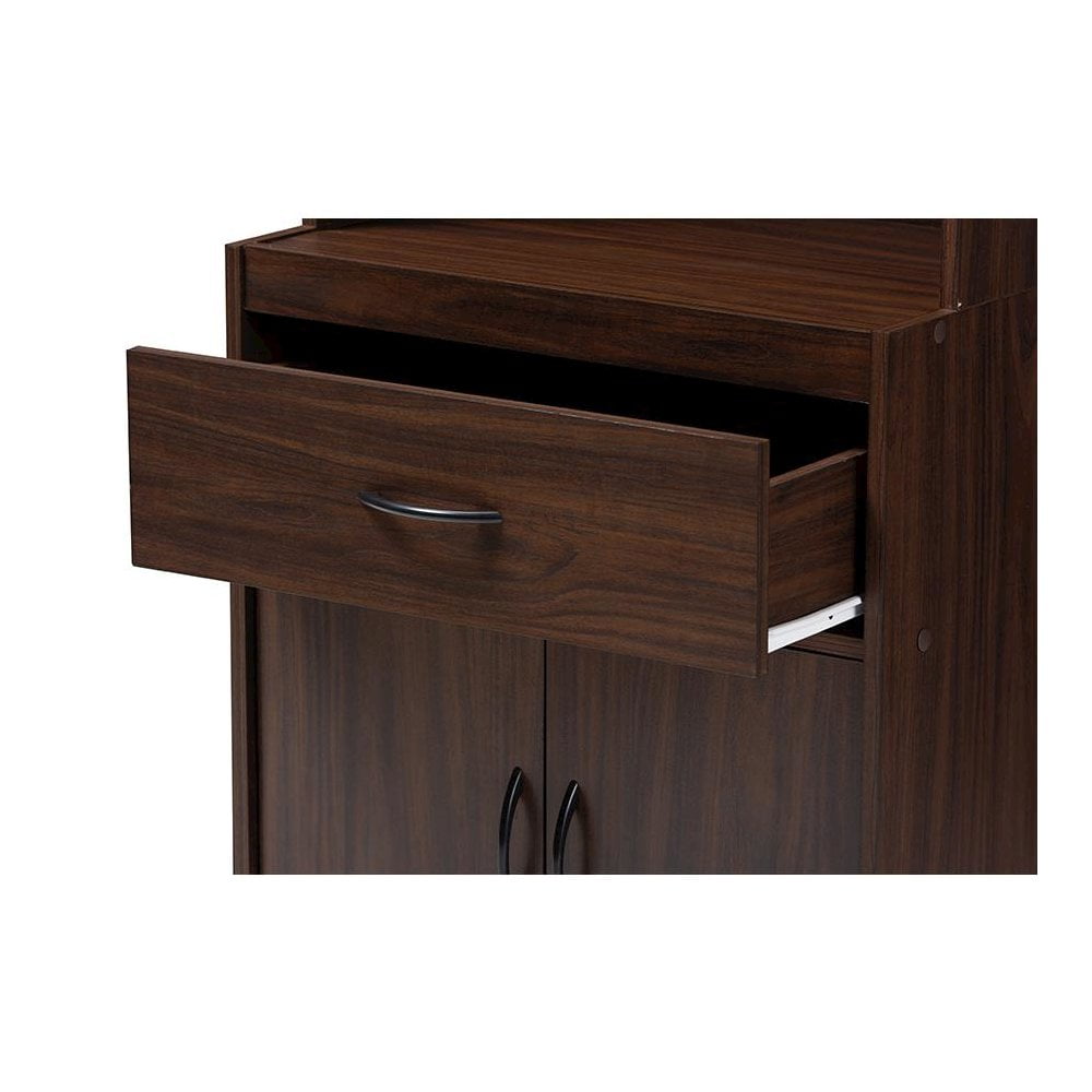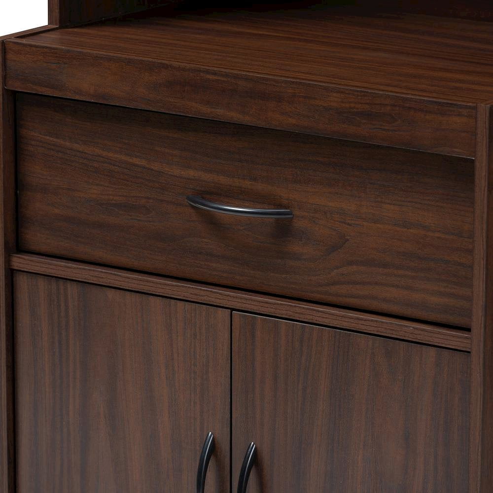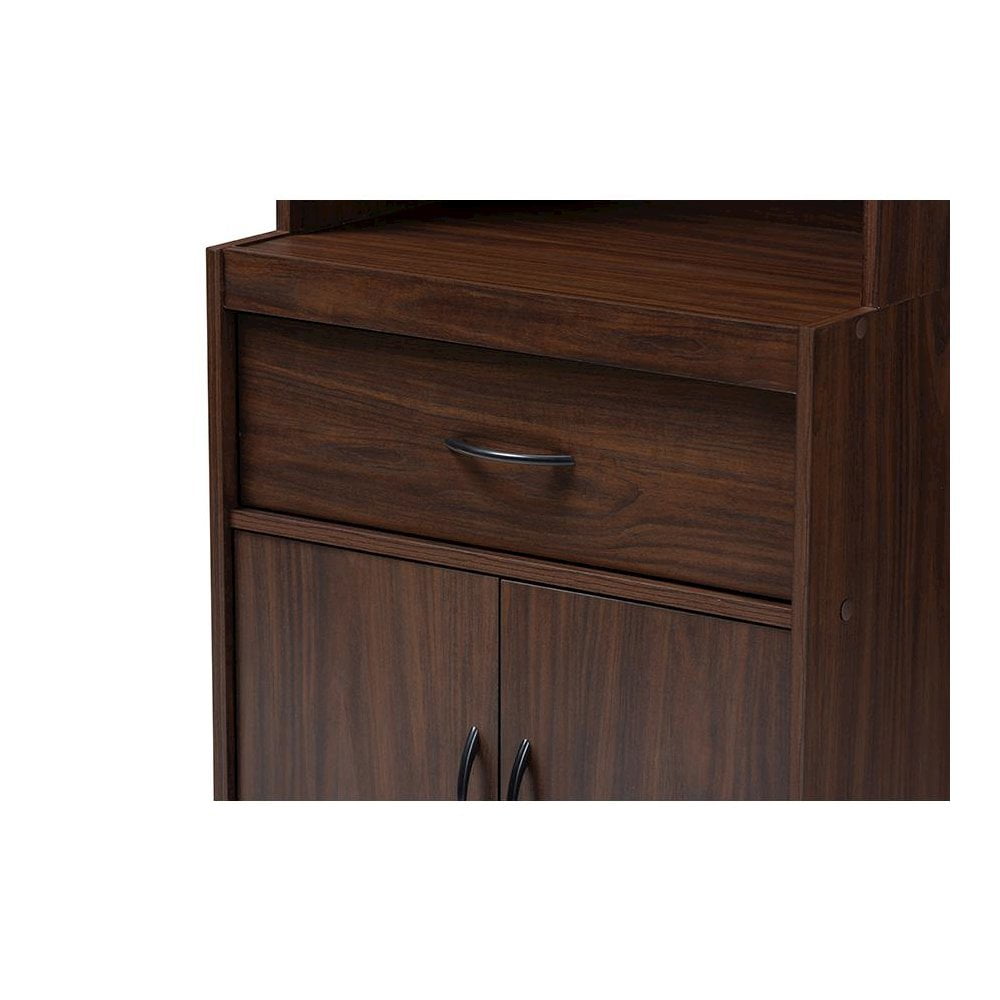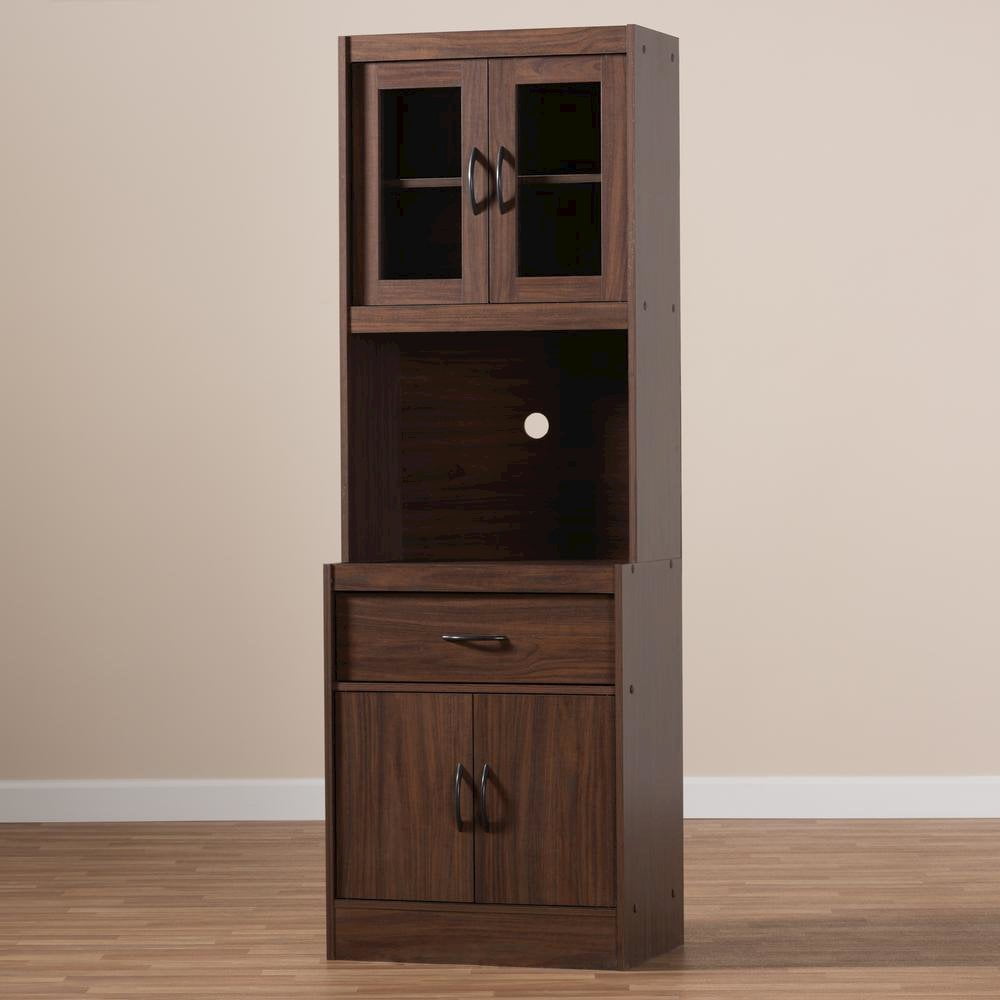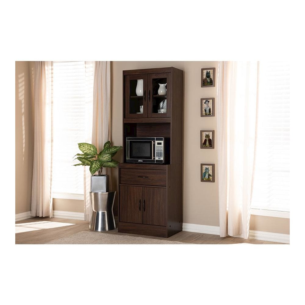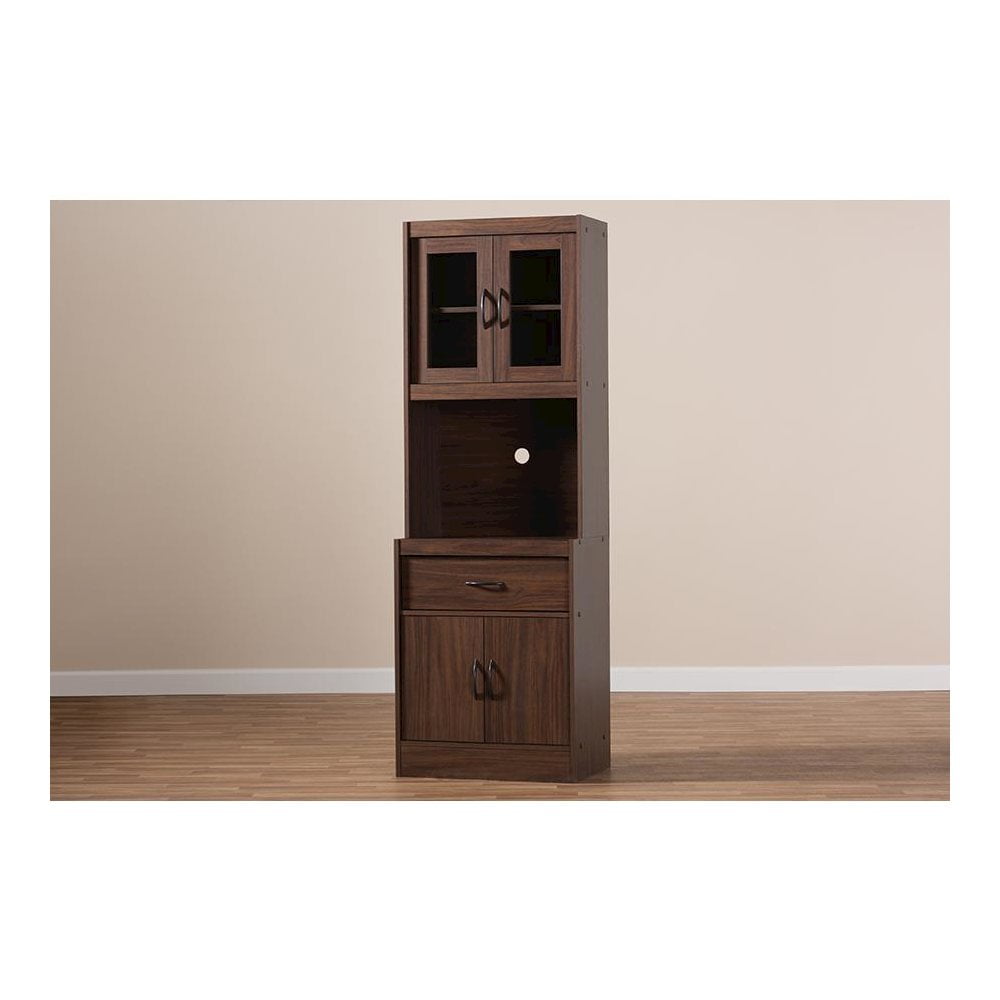 The simplicity and elegance of the Laurana kitchen cabinet and hutch is matched only by its practicality. The modern and contemporary-inspired design emphasizes a tall, rectangular silhouette and clean, solid coloring. The Laurana’s engineered wood frame is finished in a sleek dark walnut, complemented by black door and drawer handles. The hutch features a top cabinet with glass paneled doors, behind which are two shelf spaces. For even more convenience and storage possibilities, the Laurana also has two shelf spaces in the bottom cabinet, one drawer, and an open space perfect for placing a microwave, coffee maker, or other kitchen appliance. The back panel of the microwave compartment has a circular opening for cord management. This stylish, smart hutch cabinet can be easily coordinated into your kitchen or dining room, providing plenty of space for storage and display. Made in Malaysia, the Laurana requires assembly.Modern and contemporary kitchen hutch; Dark walnut finished engineered wood frame; Two top shelves behind glass paneled cabinet doors; Two bottom shelves behind doors and one drawer for storage; Microwave compartment