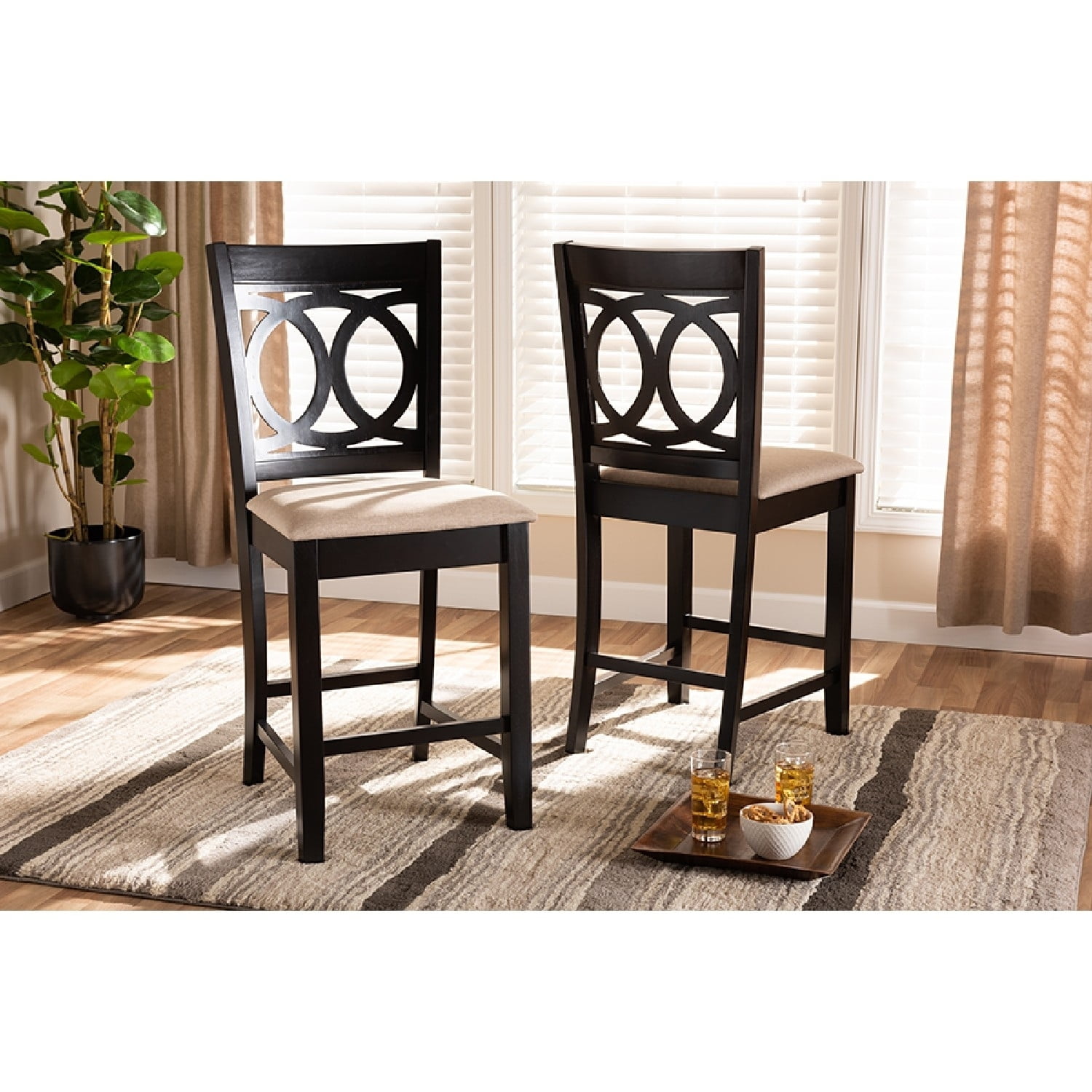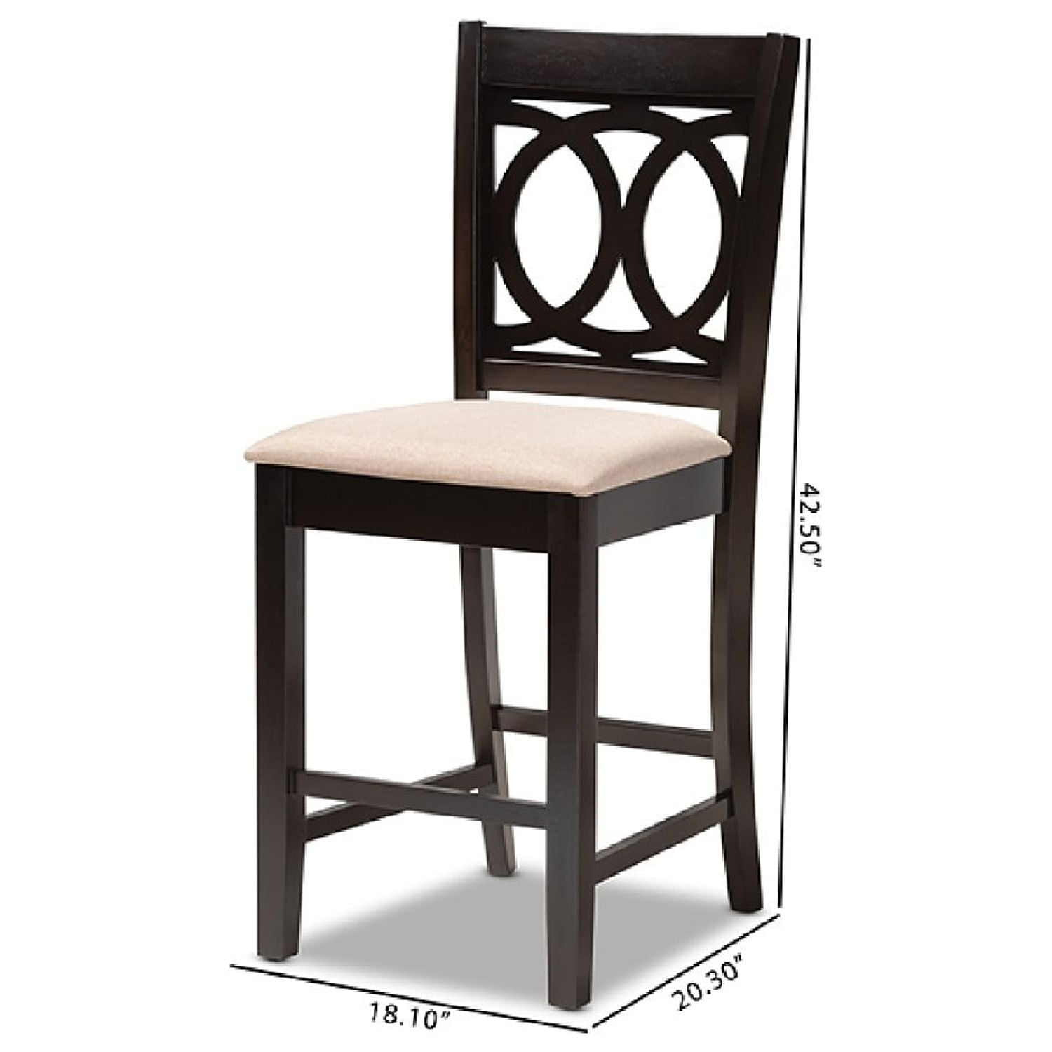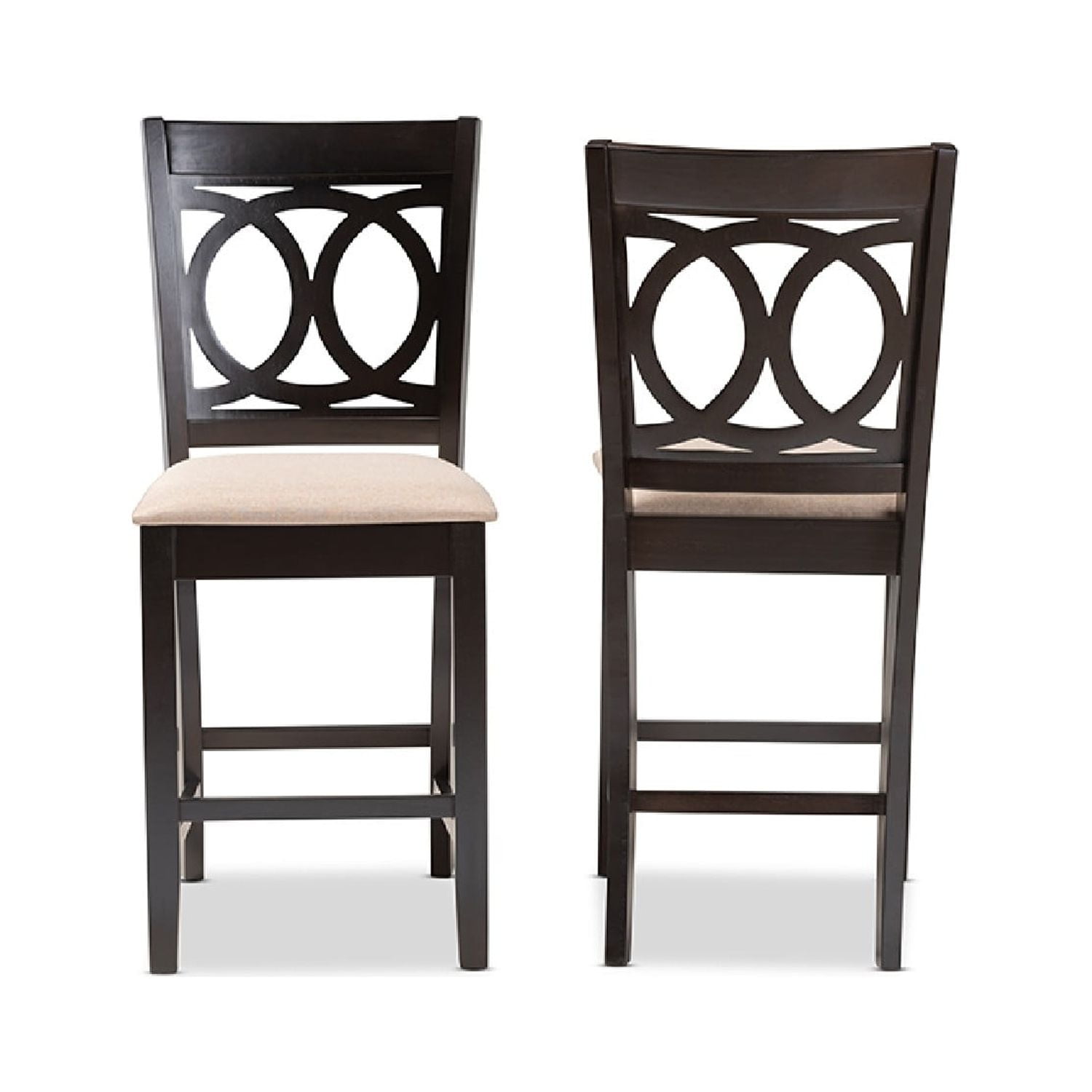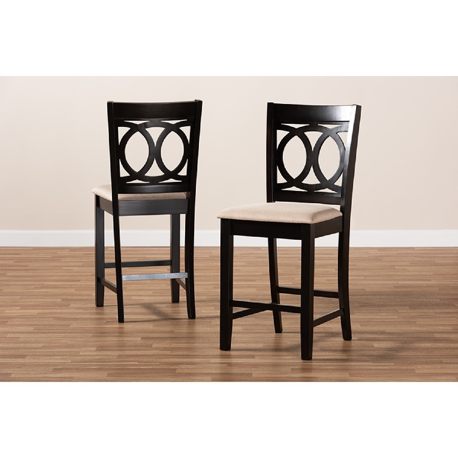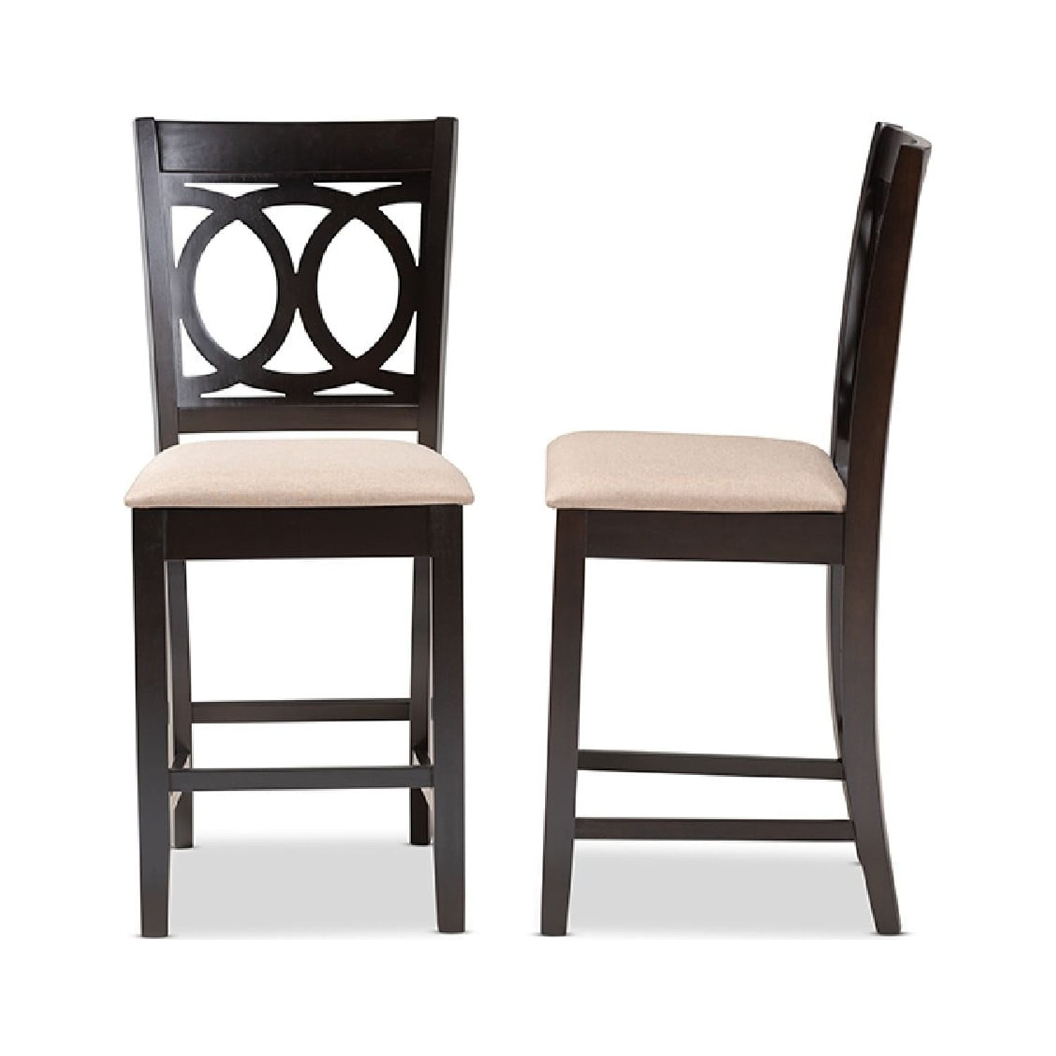 Baxton Studio Lenoir Modern and Contemporary Sand Fabric Upholstered Espresso Brown Finished Wood Counter Height Pub A fusion of traditional design elements and modern craftsmanship make the Lenoir pub chair a stunning addition to any dining space. This solid rubberwood chair features a sleek espresso brown finish that complements the light polyester fabric upholstery. Padded with foam for the utmost comfort as you enjoy long dinners, the Lenoir features a striking cut-out back for enhanced visual appeal. Comfortable and stylish, the Lenoir is suitable for use with pub tables and kitchen counters. The Lenoir pub chair is made in Malaysia and requires assembly. Specifications: Modern and contemporary pub chair Constructed from rubberwood Espresso brown finish Polyester fabric upholstery Cut-out back design Assembly required Made in Malaysia