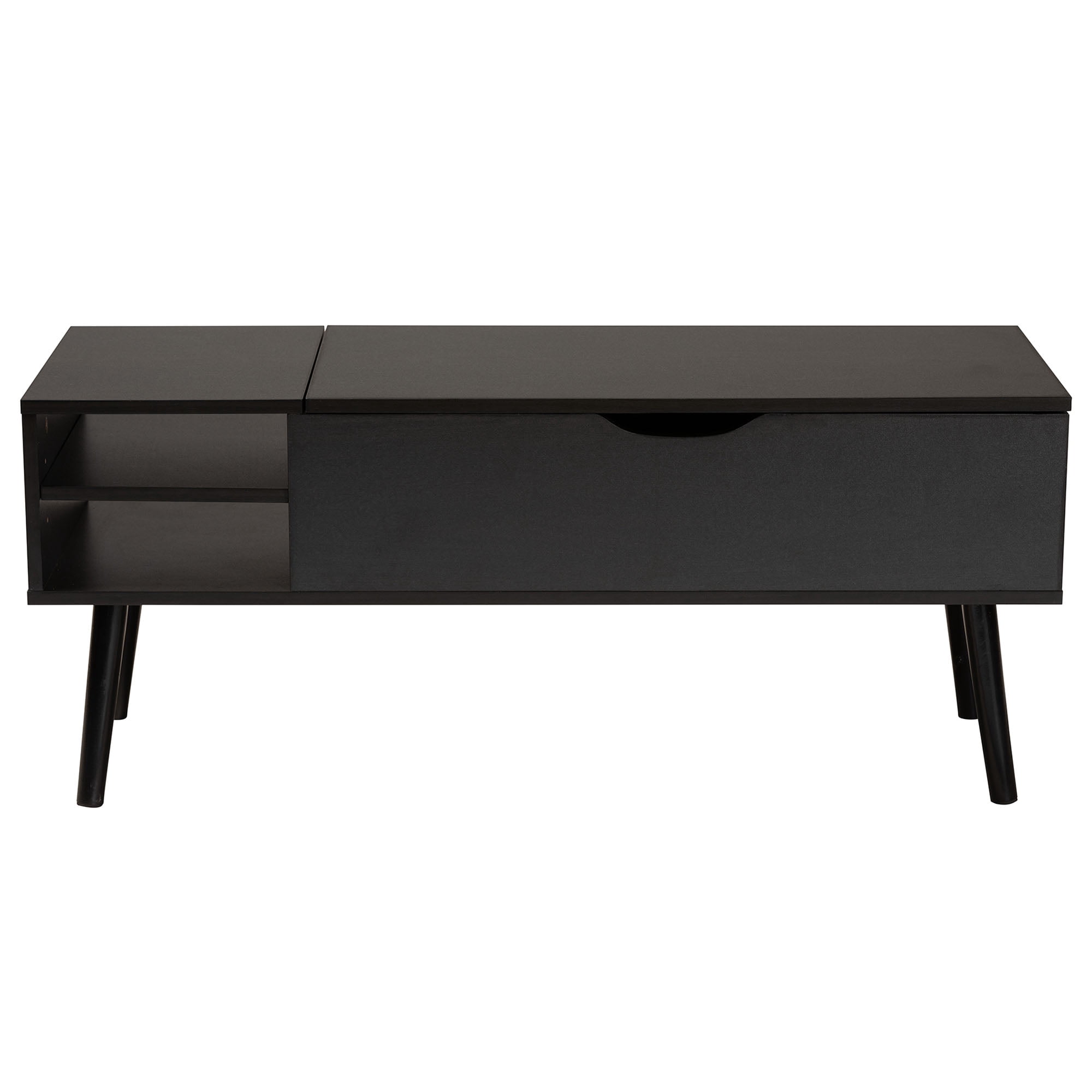 Baxton Studio Lift-Top Solid Wood Coffee Table, Dark Brown/Black Modern coffee table designed to enhance your living space Constructed from durable engineered wood for long-lasting use Features a convenient lift-top tabletop for easy access Includes three (3) interior storage compartments to keep items organized Equipped with two (2) open shelves for additional storage or display Stylish angled legs provide a classic silhouette Rectangular tabletop offers ample surface area for various uses