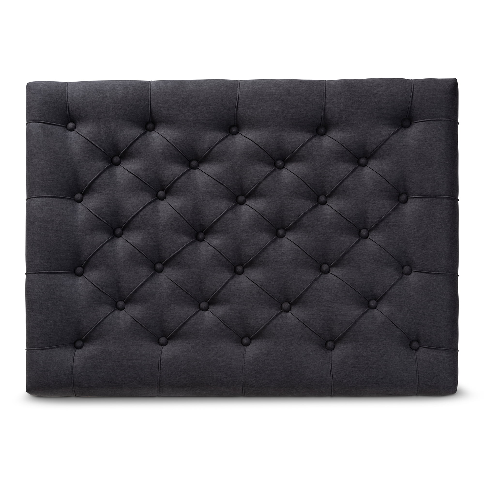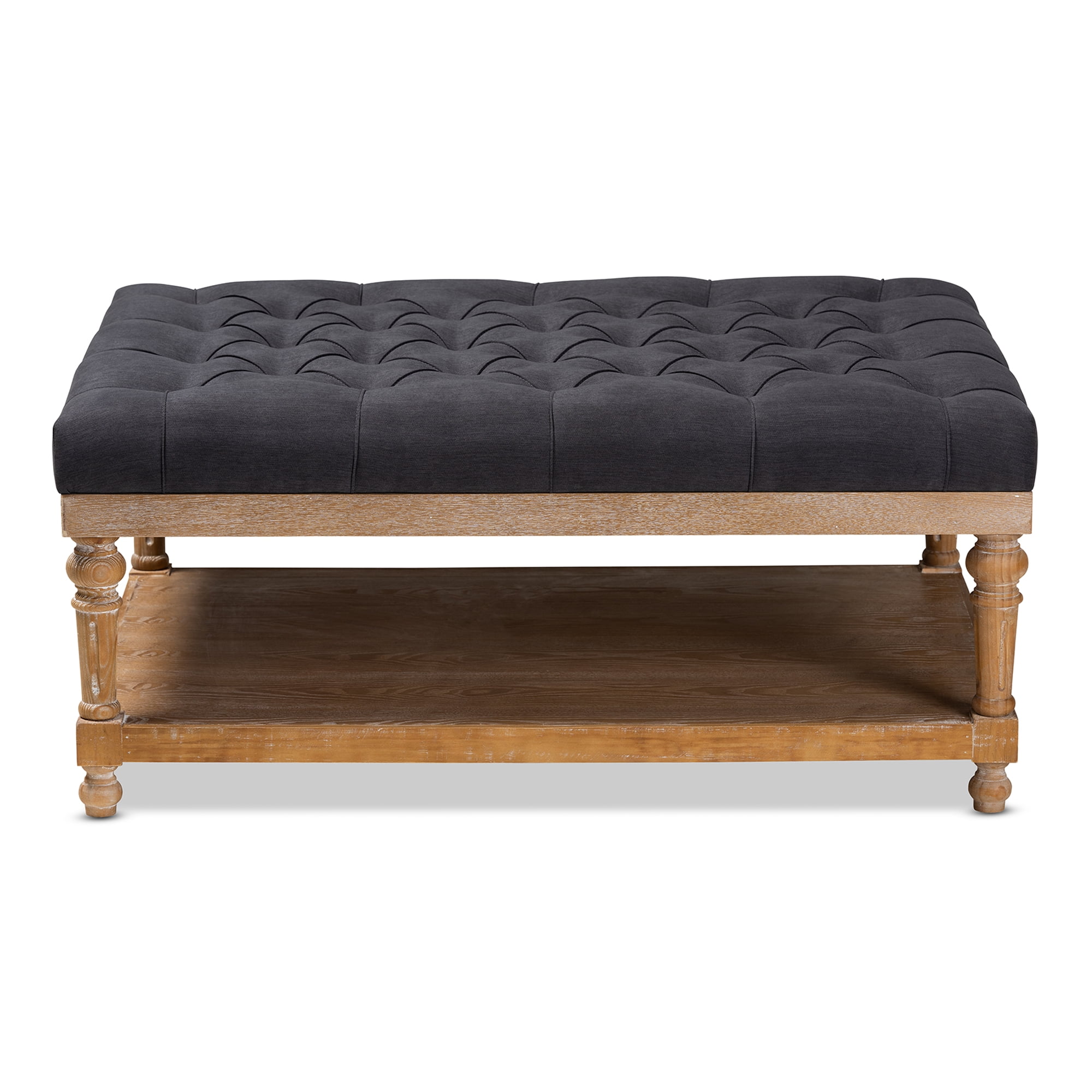 • Charcoal Linen upholstered • Modern and rustic cocktail ottoman • Lower storage shelf • Constructed from MDF wood and Firwood • Button tufted design • Assembly required • Made in Malaysia
