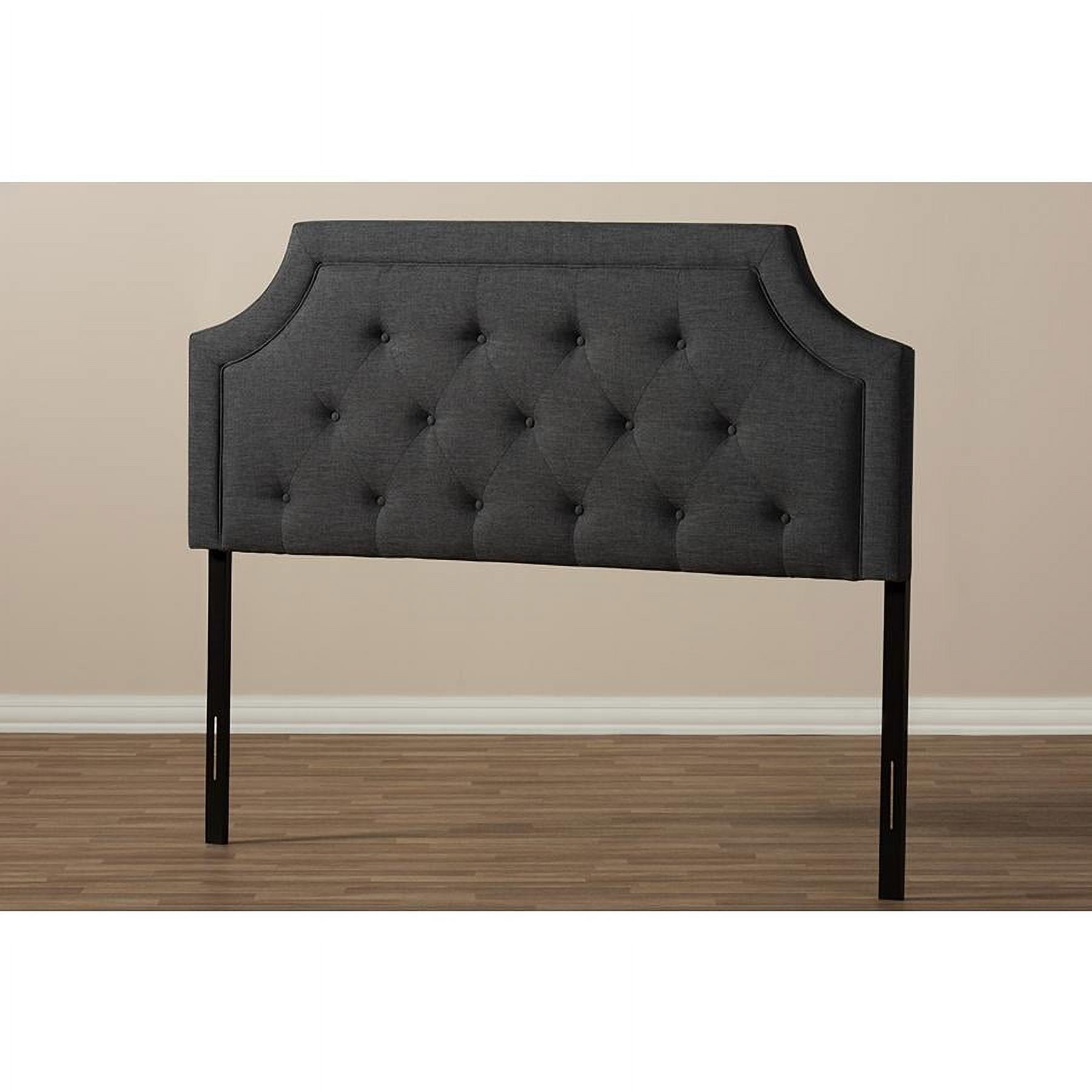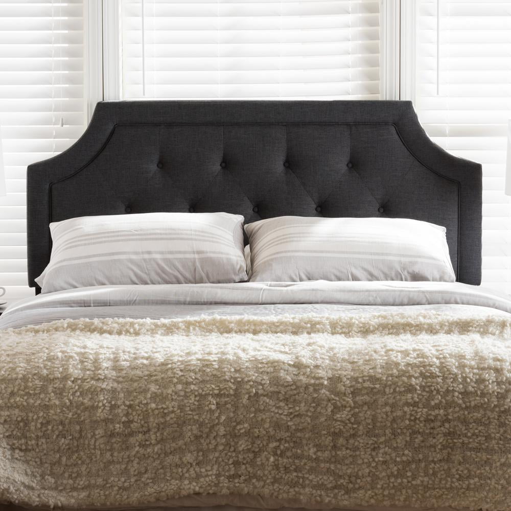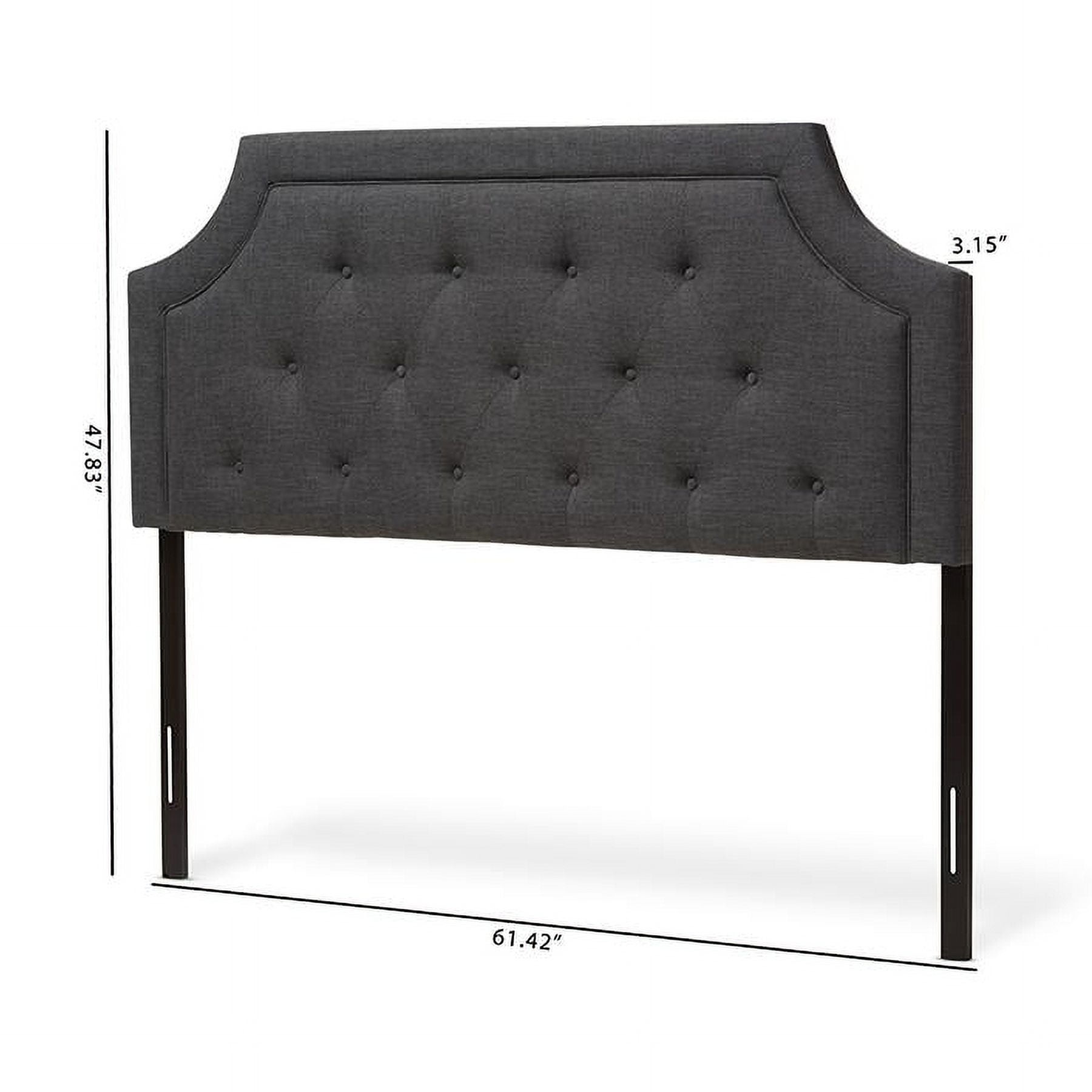 Baxton Studio Mars Modern and Contemporary Dark Grey Fabric Full Size Headboard,Wholesale Interiors With its quality finishes and classic look, the Mars fabric upholstered headboard with solid rubberwood legs is available in a range of warm hues to complement your look. Romantic bedhead shape with exquisite corners and curves, putting a modern edge on classic design. Constructed of solid rubberwood and MDF, the Nadeen full size headboard is upholstered in durable dark grey polyester fabric. Featuring deep button-tufted design for a classic look, the Mars is supported sturdily by the wood posts with 5-level adjustable pre-drilled screw holes to the headboard and 2-level adjustable to the bed frame. Leg supports are invisible once set up and can be adjusted to suit the height of your ensemble for convenience. Traditional adjustable metal bed frame such as Leggett and Platt bed frame will work well with the headboard. Cushioned headboard is padded with high-density foam for softness and shape, providing a comfortable leaning space. Made in Malaysia, the Mars headboard requires assembly. Specifications: Contemporary headboard Fabric upholstered 5-level adjustable wood post attaching the headboard 2-level adjustable wood post attaching the bed frame Cut-out corners with piping Button-tufting design Assembly required