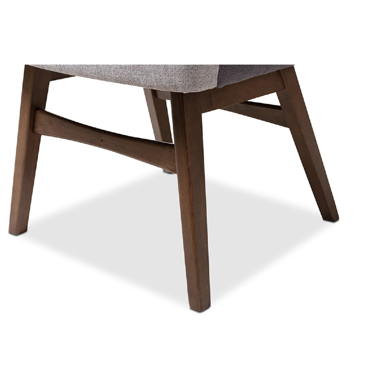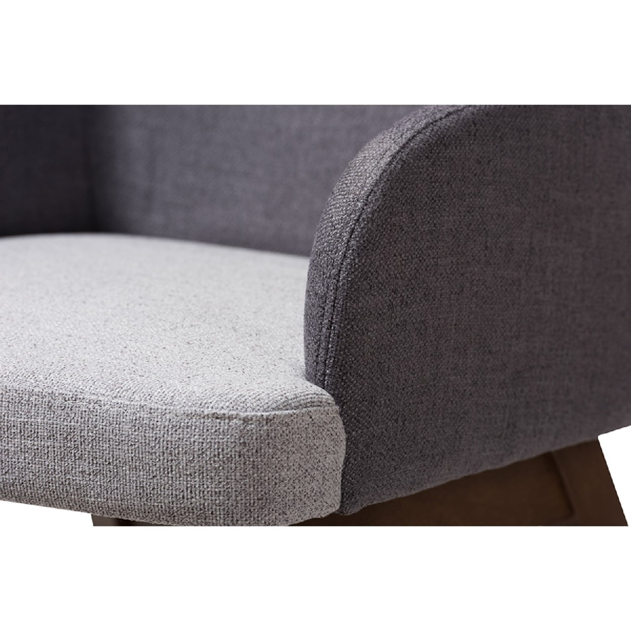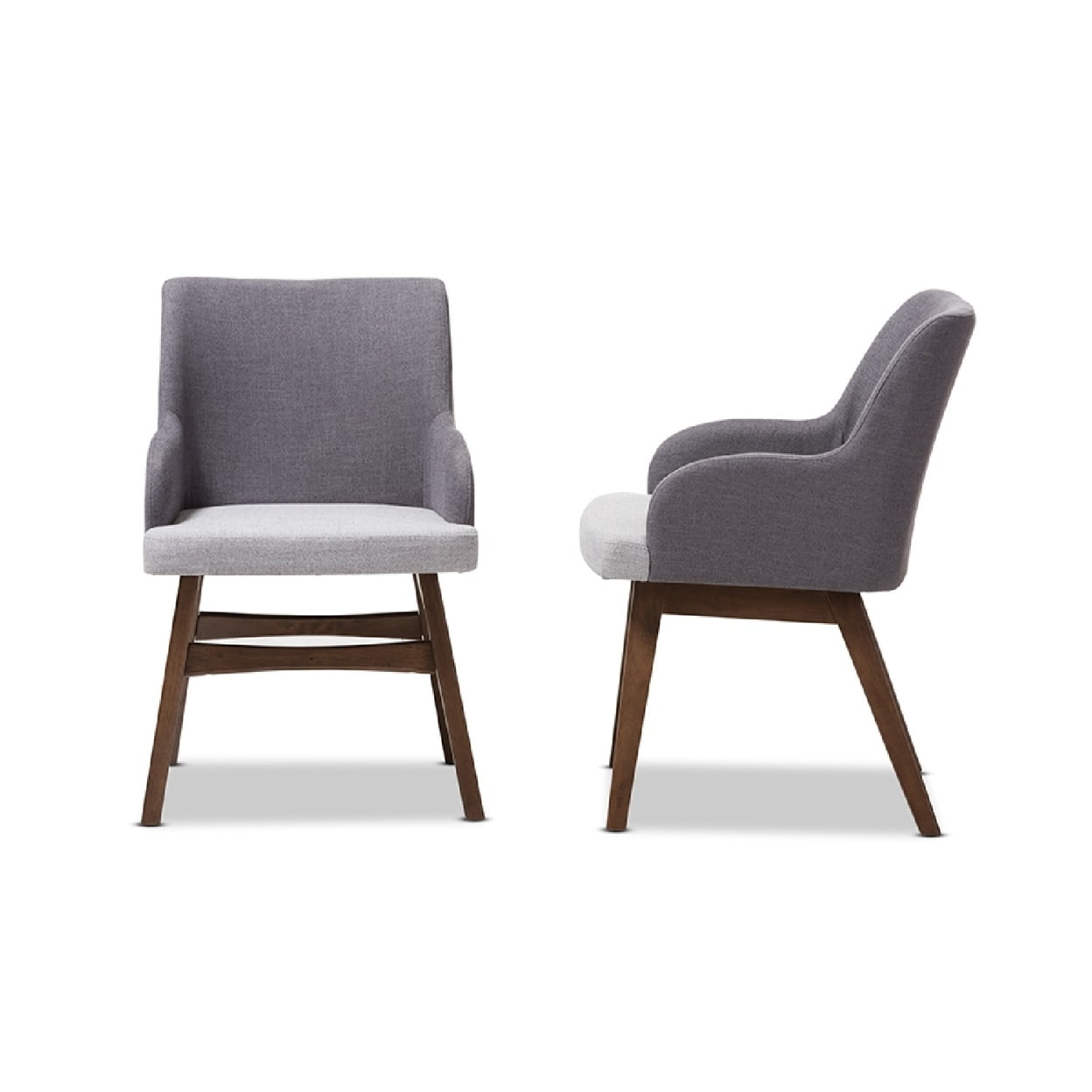 Baxton Studio Monte Mid-Century Modern Two-Tone Grey Fabric Armchair (Set of 2) Hint a touch of mid-century look and vintage-mod aesthetic around your dining table with the Monte dining armchair. Constructed of solid rubberwood frame, the Monte is upholstered in two-tone dark grey and light grey polyester fabric, providing exceptional softness and durability. Solid wood legs support the chair frame with lasting good looks in dark walnut finished. Padded with foam for lasting comfort for enjoying everyday family dinners, the Monte features tall seat back that seamlessly curves down to the wide-seat arms, creating a plush look for a vintage-mod aesthetic. Made in Malaysia, the Monte dining armchair require assembly. Specifications: Mid-century dining room side chair Fabric upholstered Walnut finishing frame Assembly required Made in Malaysia
