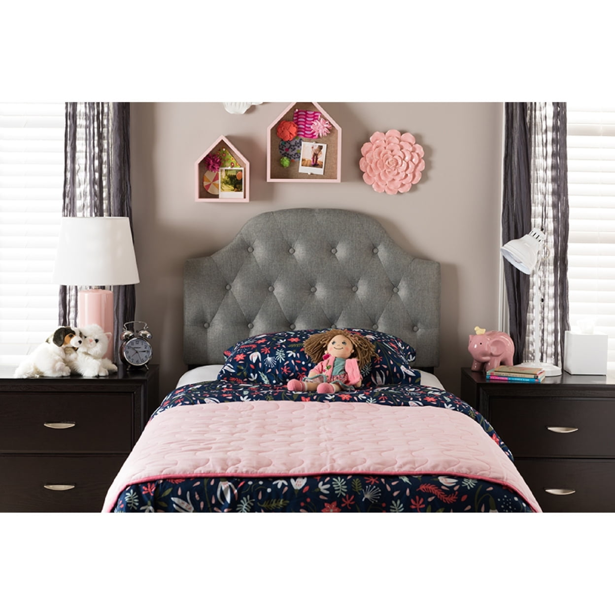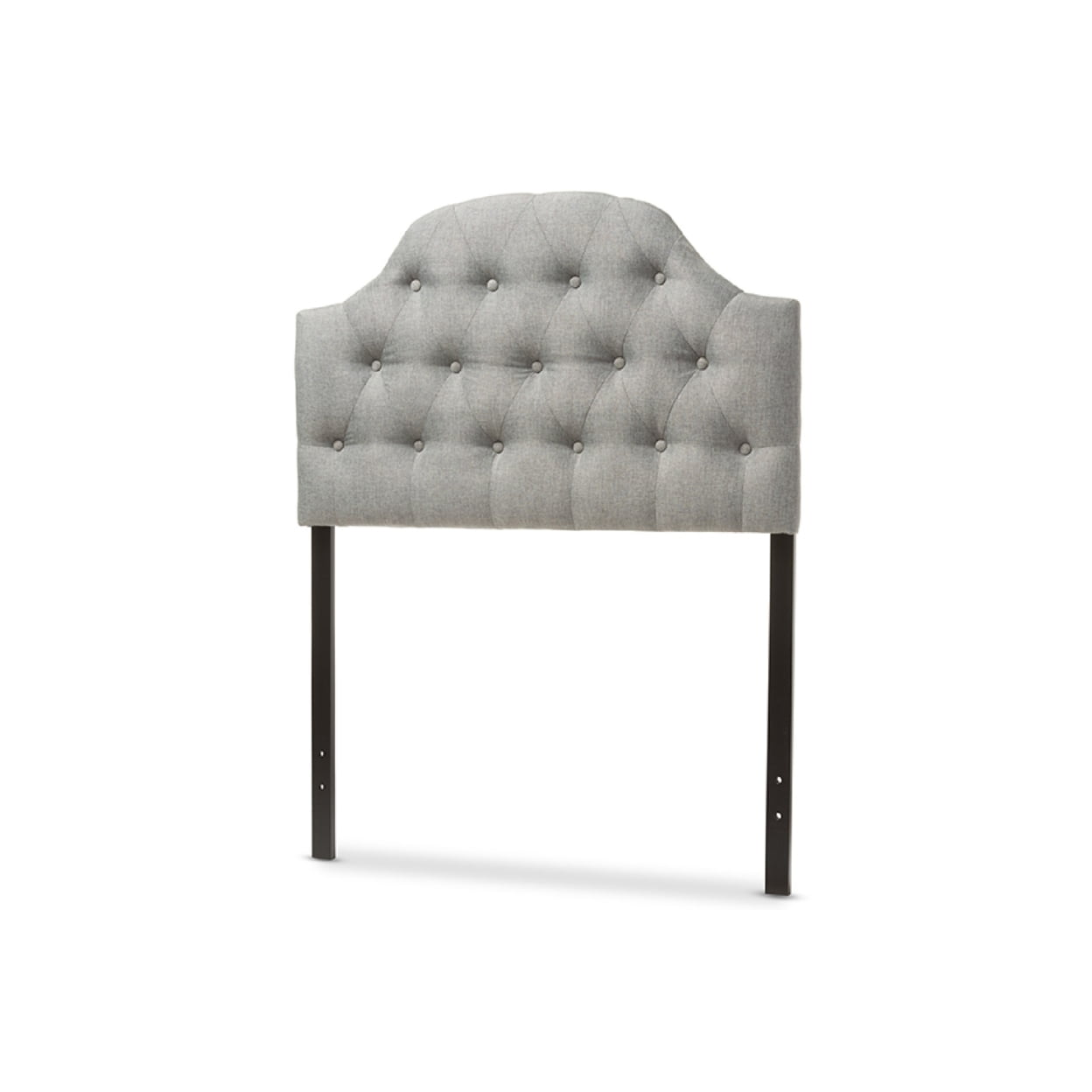 Modern and contemporary twin size upholstered headboard Grey polyester fabric Adjustable headboard legs with five pre-drilled holes on top of the legs and two pre-drilled holes near the bottom Upholstered plush headboard with button-tufting design Self-assembly required