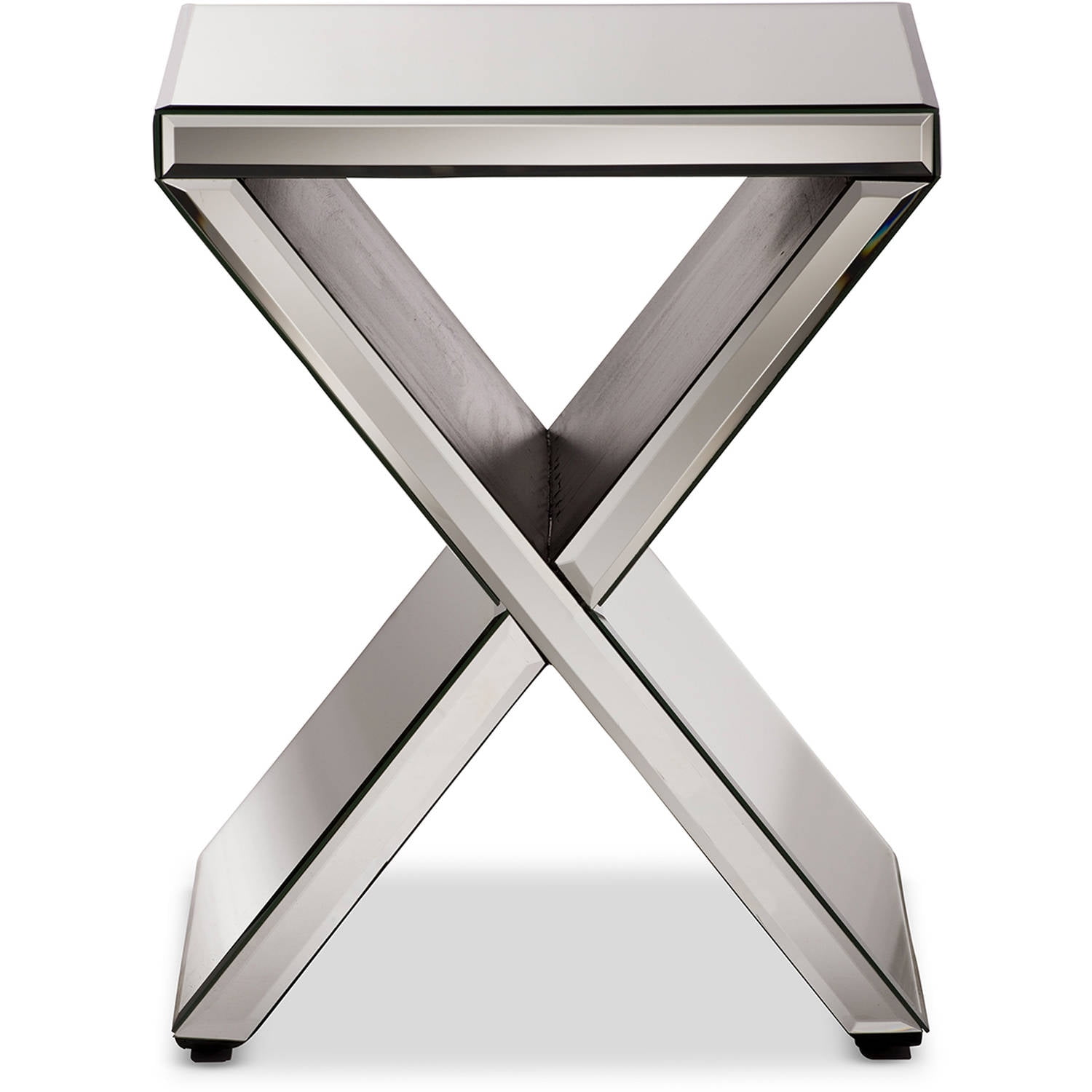 Baxton Studio Morris Modern and Hollywood Regency Glamour Style Accent Side Table Brighten up even the darkest day with the modern and contemporary mirrored furniture. Stylish contemporary designs and eye-catching reflective surfaces make this accent table that can not be ignored; a true asset to any modern home. Featuring Hollywood glamour style, this X-base mirrored accent table will emphasize the luminosity in the room, adding atmosphere and elegance. Make the most of your lamp by sitting atop the sparkling surface of the Morris Mirrored Accent Table. Handcrafted of wood composite, mirrored glass and mirrored laminate, the Morris accent table creates a highly modern and unusual look which is sure to be noticed and admired by all. Thanks to the smooth nature of this mirrored table, it is super easy to maintain a pristine look. Simply wipe over with a damp cloth and every so often use a hint of polish to really make your table shine. There?s no need to worry about a fiddly assembly as this accent table will be delivered fully assembled. Made in China, the occasional table will be a great choice for contemporary elegance. Specifications: Modern and contemporary Hollywood regency glamour style Materials: MDF and mirror Mirrored top with “X” shaped mirror base