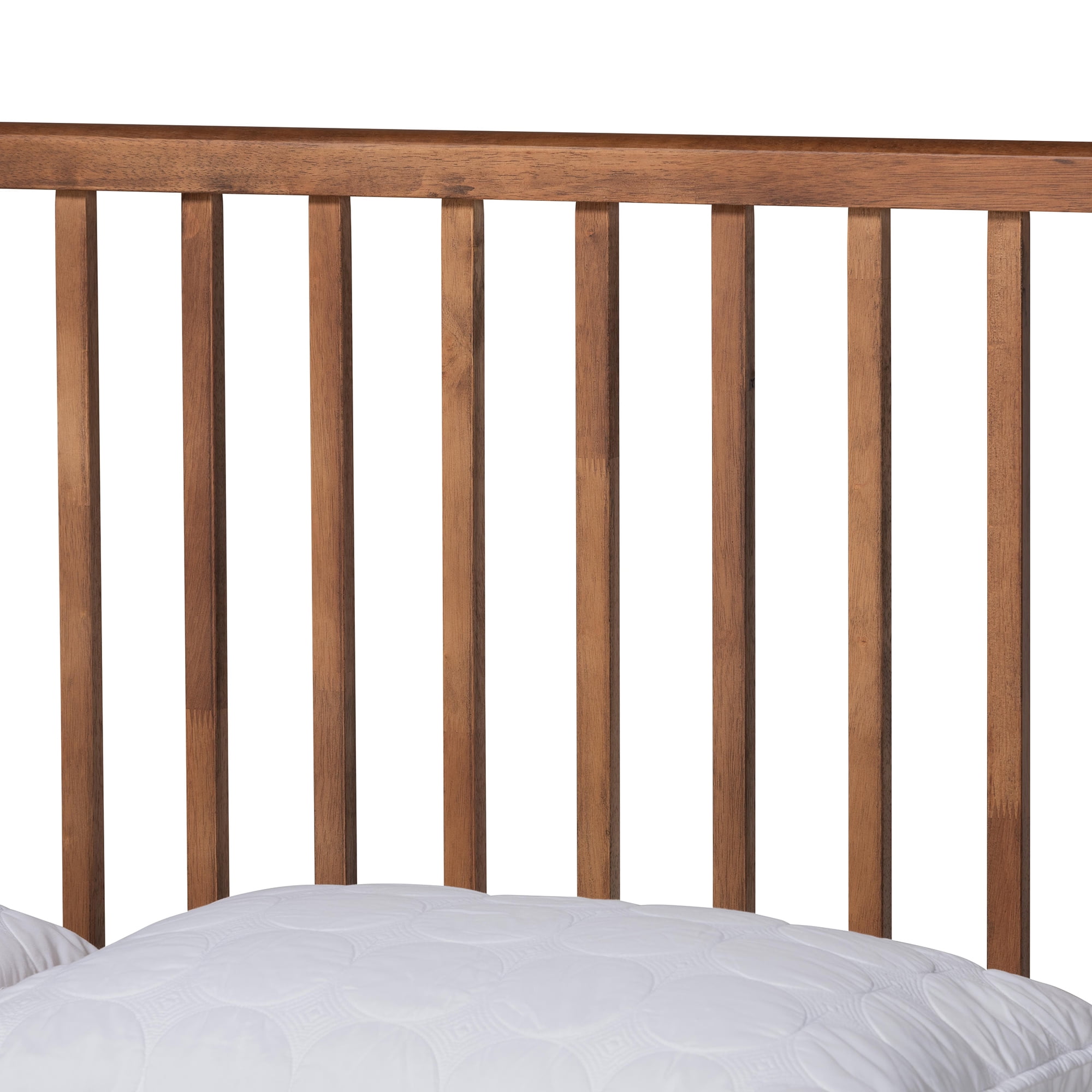 Constructed from rubberwood and engineered wood Wood slats eliminate the need for a box spring Walnut brown finish Slatted wood headboard Assembly required Product Weight: 76.8 Pound Package Weight: 87.8 Pound Overall Dimensions: 47.24″ High x 64.68″ Wide x 84.64″ Deep Inside Dimensions (mattress size): 62.20″ Wide x 81.10″ Deep Headboard Dimensions: 64.68″ Wide x 20.50″ High x 1.8″ Thick Distance from top of slat to bottom of headboard: 14.40″ Distance between each slat: 3.50″ Height from Floor to Top of Slat: 12.40″ High; Legs: 10.10″ High Product Color: Walnut Brown Product Composition: Rubberwood/MDF
