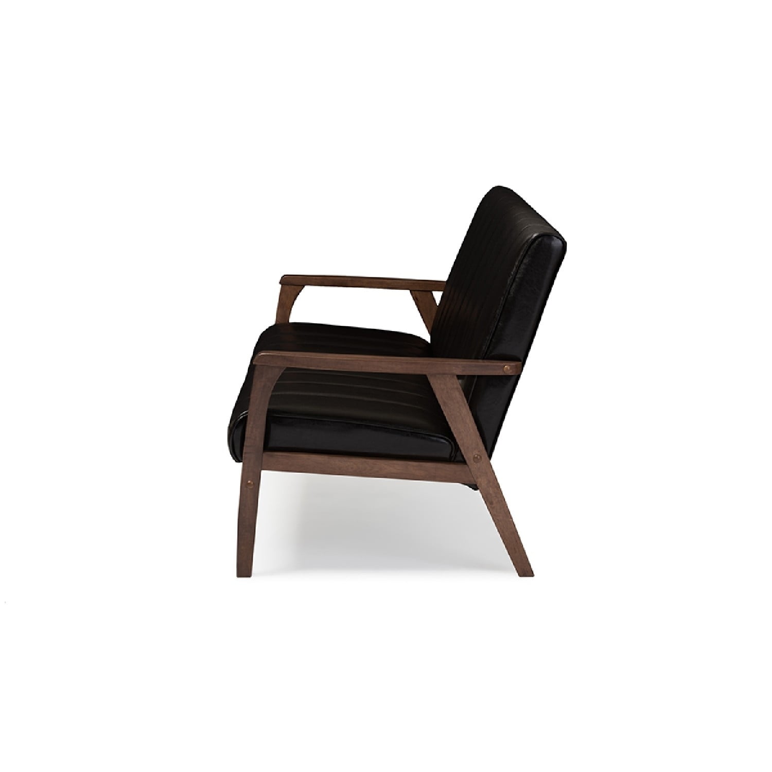 Mid-century modern design sofa Finishing: walnut Faux leather upholstery with panel stitching Angular wooden frame Assembly required