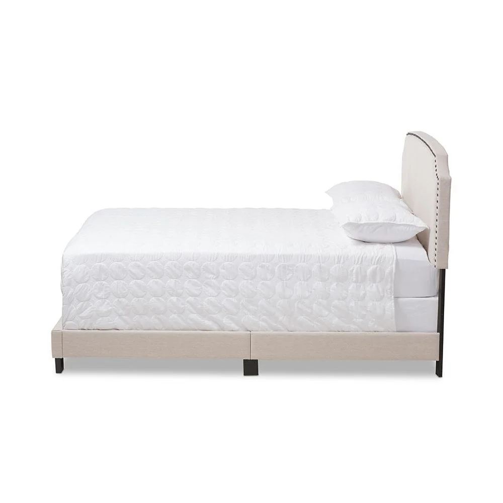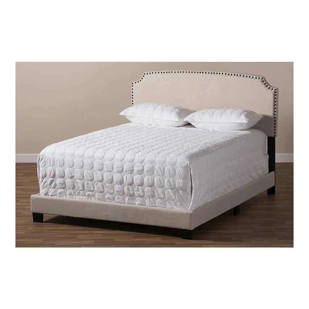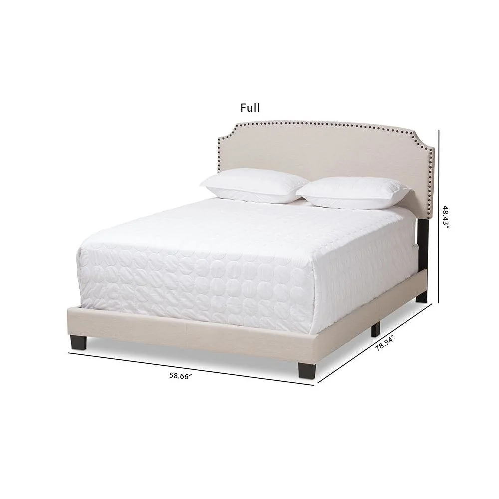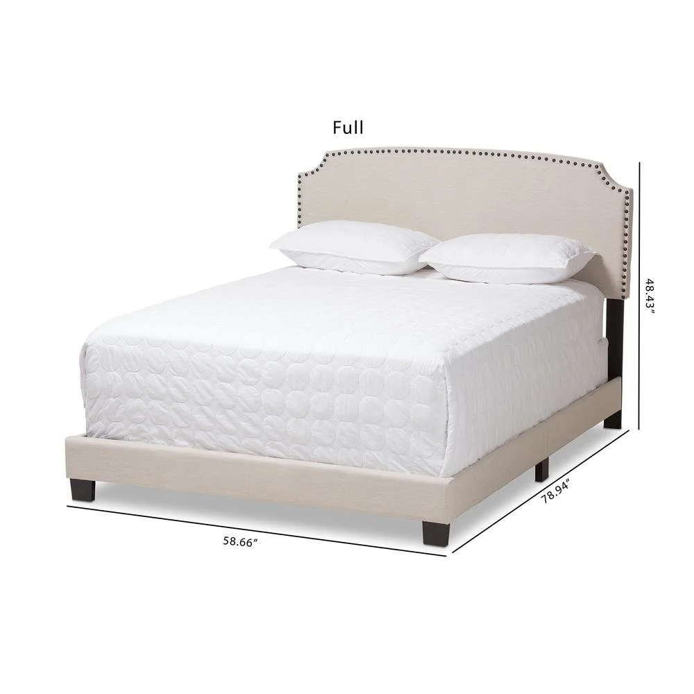 Baxton Studio Odette Full Size Curvaceous Standard Beds, Light Beige Modern and contemporary design Light beige fabric upholstery for a neutral look Solid rubberwood legs for durability Curvaceous headboard with stylish nailhead trim Requires box spring for optimal support