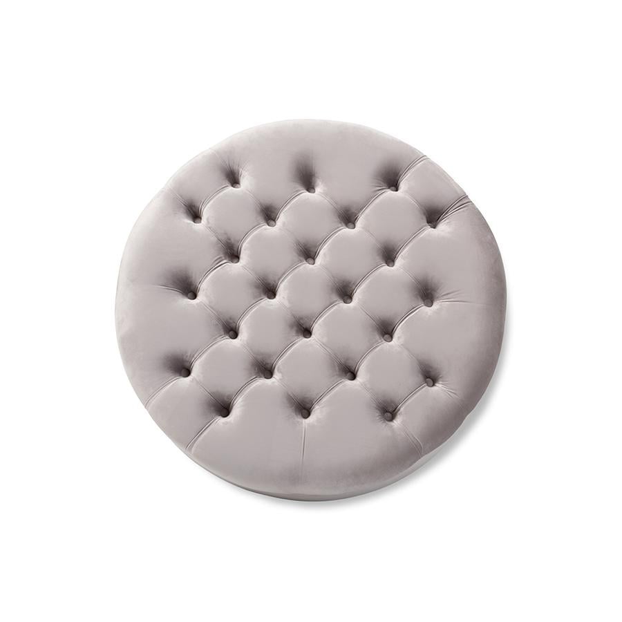 Give your space an elegant upgrade with the Palfrey ottoman. Constructed from eucalyptus wood, this chic ottoman is upholstered in rich velvet upholstery that is soft to the touch. The stunning sheen of the velvet is highlighted by button tufting on top, which adds a refined touch. A fusion of both modern and traditional design elements, the Palfrey features antique brass studs and black turned, fluted wood legs. The Palfrey ottoman is made in China and will requires leg assembly. Features: Transitional cocktail ottoman Constructed from eucalyptus wood Upholstered in velvet polyester fabric Specifications: Seat Height: 15.8″ Seat Depth: 35.3″ Seat Width: 35.3″