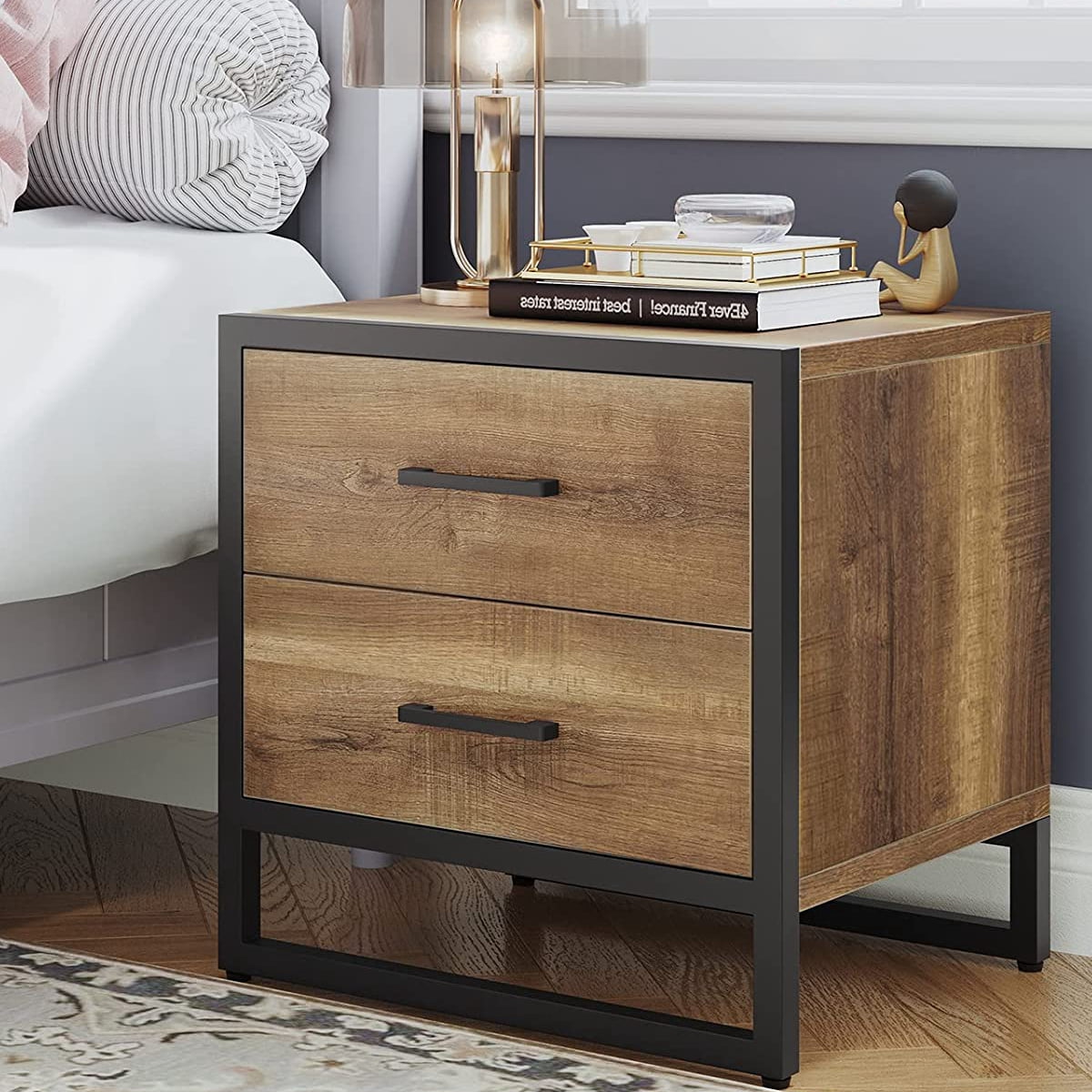 Modern and contemporary nightstand Dark grey and “oak” light brown finishing Two-tone finishing, Two drawers, and one open shelf 2-Drawers nightstand Wooden drawer handles Made in Malaysia Assembly required