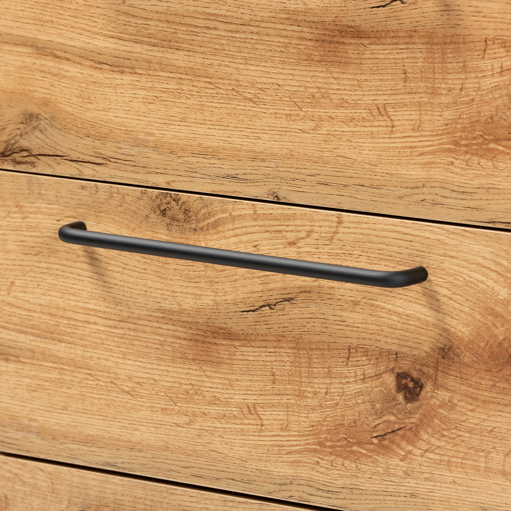Pairing natural wood tones with sleek black metal, the Radley sideboard adds a cool, contemporary touch to any dining room. Made in Malaysia, the Radley is constructed from sturdy wood showcasing a natural oak brown finish for visual warmth. Three spacious drawers efficiently organize utensils, while two large shelves behind the doors support larger cookware. Requiring assembly, angled legs provide the Radley with stable support while adding a touch of retro charm. Black finished metal handles complete the look with industrial style, making the Radley sideboard a stylish and practical addition to any space.