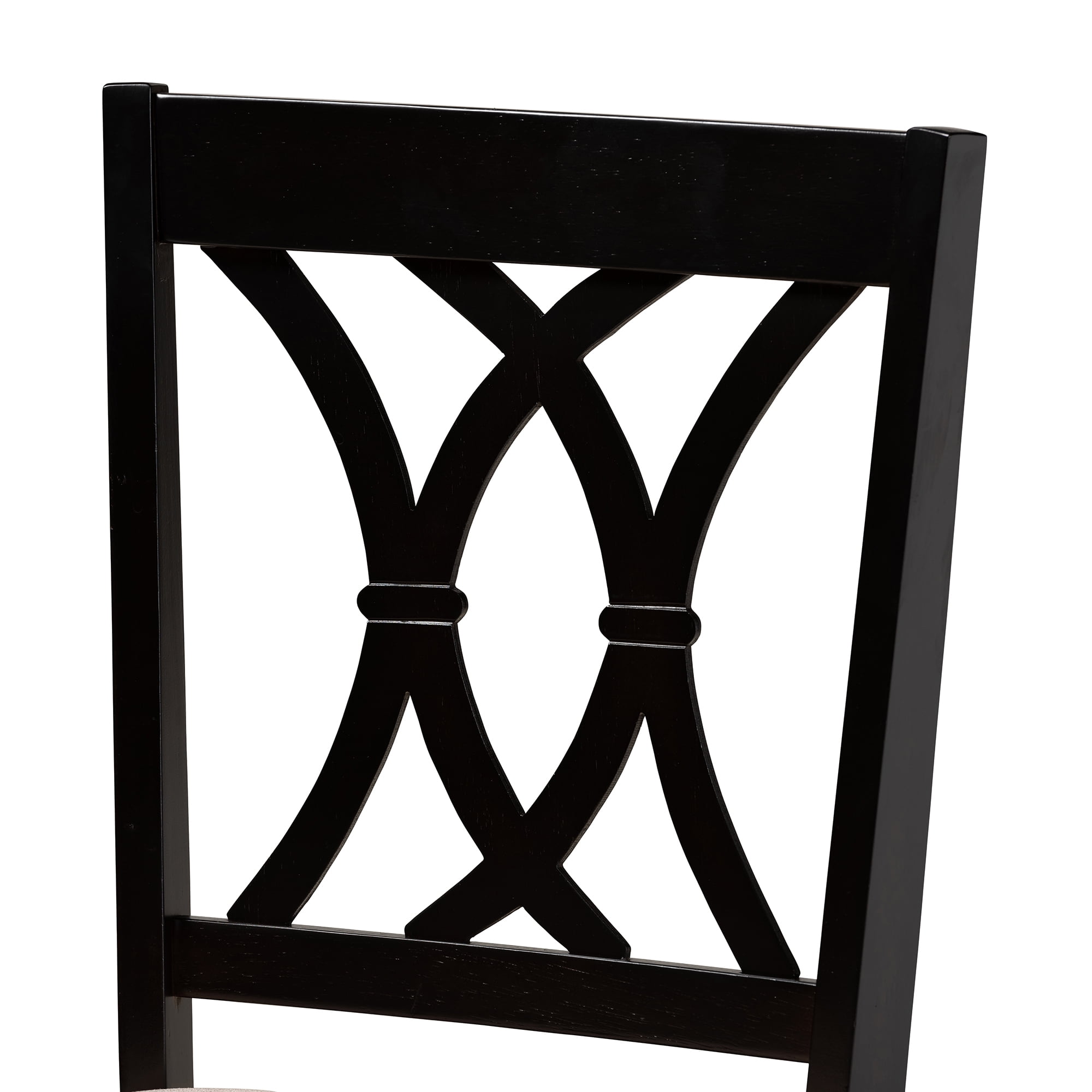 Crafted with the utmost attention to detail, the Reneau 7-piece dining set adds elegance to any dining space. Constructed from solid rubberwood in an espresso finish, this dining set includes one table and four chairs, each upholstered in a light polyester fabric that complements the dark wood finish. Designed to add both comfort and style to your dining space, each chair features a plush foam-padded seat, as well as a stunning cut-out design on its back. Tapered feet add a classic, refined touch. Built for long dinners with family and friends, the Reneau set is sure to enhance any dining experience. The Reneau 7-piece dining set is made in Malaysia and requires assembly. Chair dimensions: 37.4″ High x 17.7″ Wide x 20.5″ Deep; Seating Dimensions: 18.5″ High (from Floor) x 18.5″ Wide x 16.1″ Deep; Back: 18.9″ High; Legs: 16.9″ High Table dimensions: 29.13″ high x 59.06″ wide x 35.43″ deep; Legs: 28.35″ high;