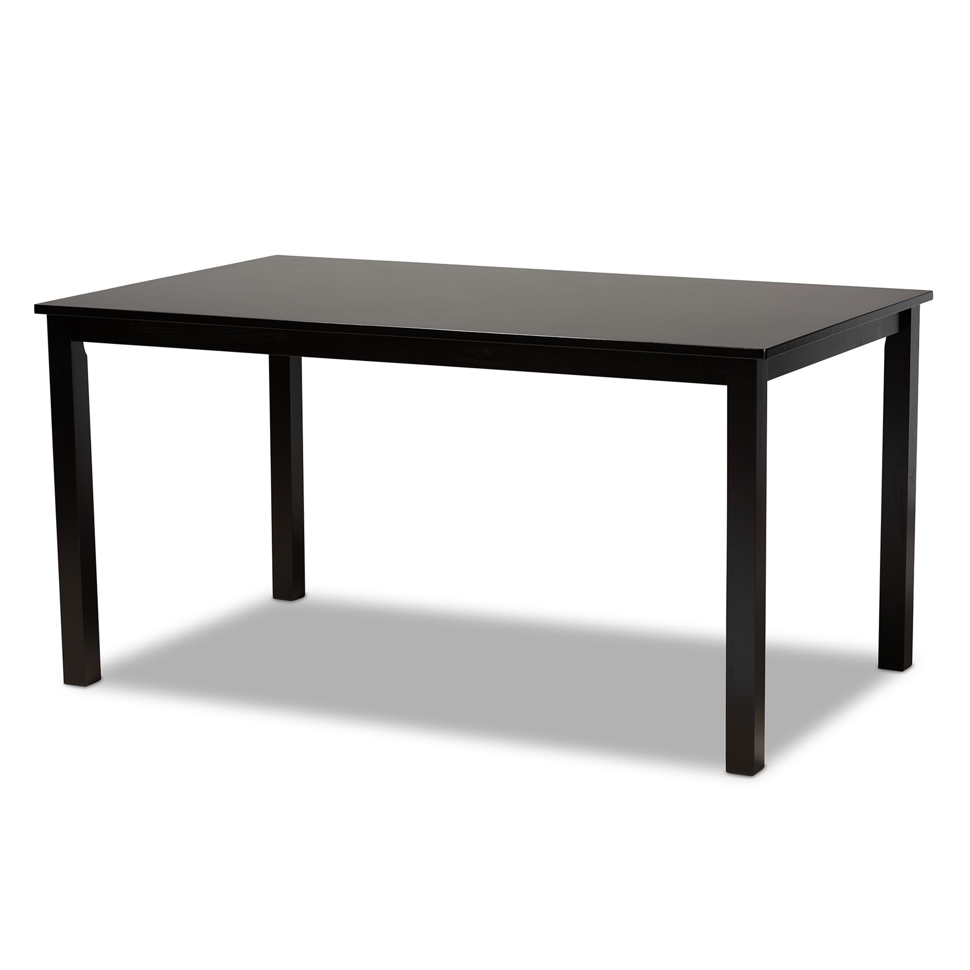 • Modern and contemporary dining set includes one (1) table and six (6) chairs • Constructed from rubberwood • Espresso brown finish • Polyester fabric upholstery • Cut-out back design • Assembly required • Made in Malaysia