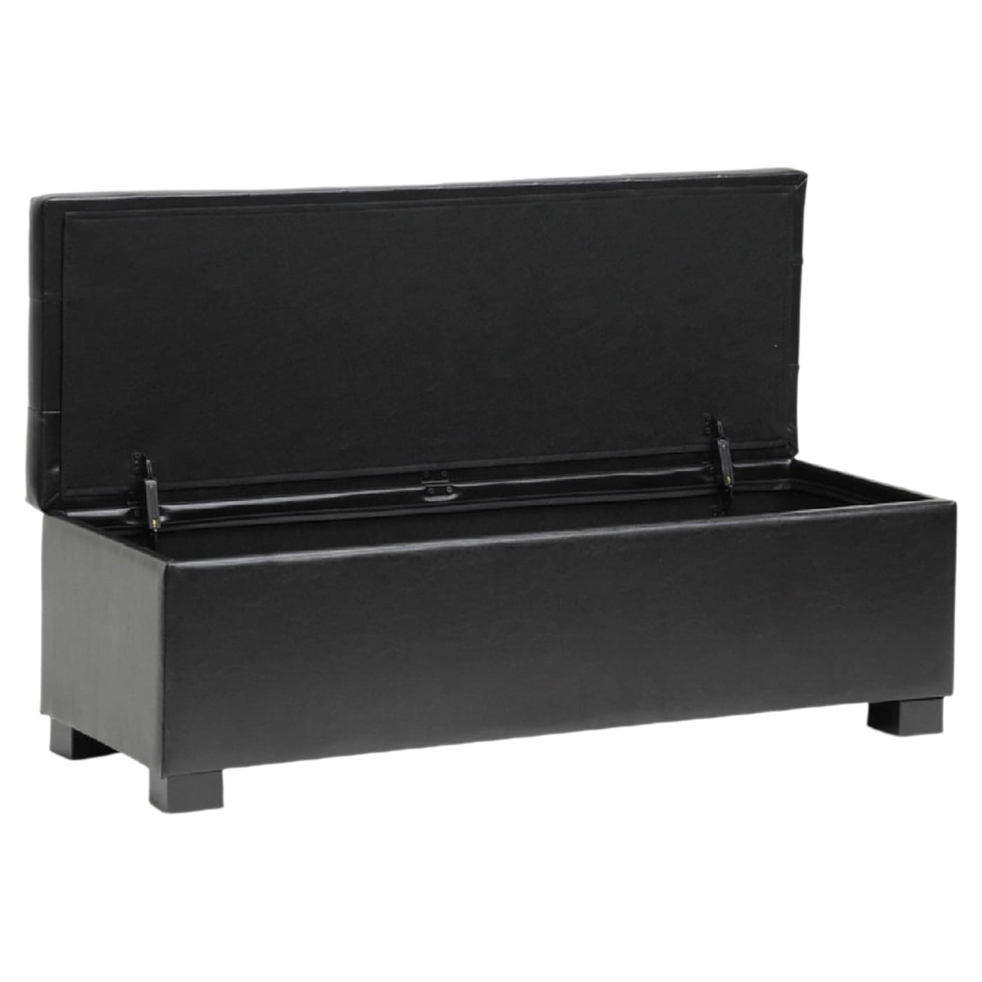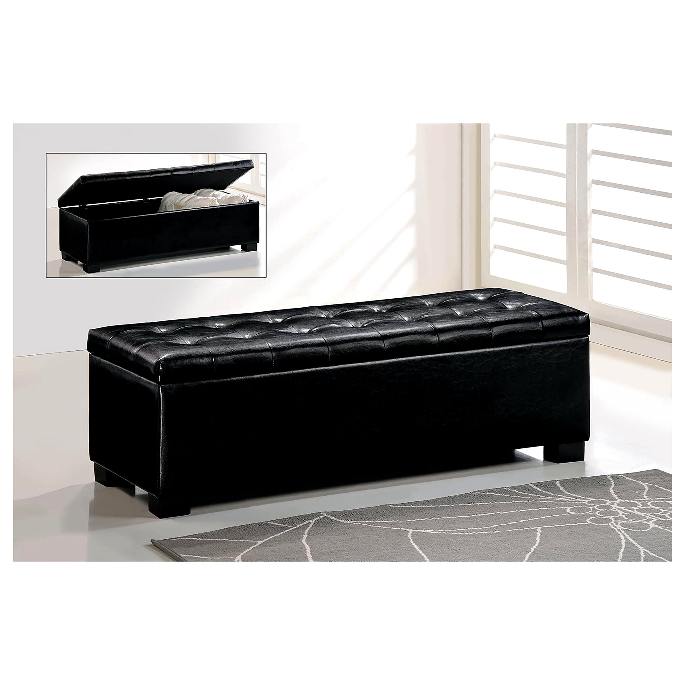 Material: Bonded leather, Plywood Contemporary tufted ottoman Black bonded leather Eucalyptus wood frame with polyurethane foam padding Cushioned top creates additional seating or a comfortable footrest Storage compartment