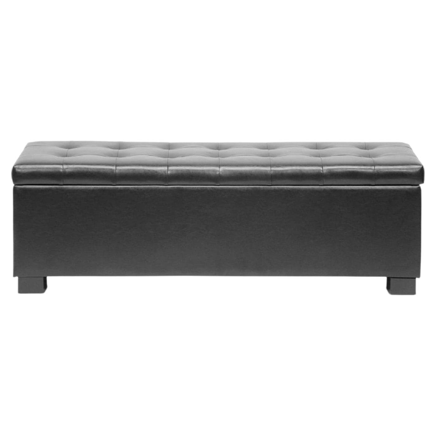 Baxton Studio Roanoke Contemporary Black Ottoman Need concealed storage space but demand style? Look no further than our Roanoke Ottoman. This contemporary ottoman boasts a black bonded leather exterior over a genuine eucalyptus wood frame. Cushioned comfort is achieved via polyurethane foam padding so the top can be used for additional seating as well as a comfortable footrest. Striking rectangular feet contrast against the upholsterys softened corners. Specifications: Material: Bonded leather, Plywood Contemporary tufted ottoman Black bonded leather Eucalyptus wood frame with polyurethane foam padding Cushioned top creates additional seating or a comfortable footrest Storage compartment