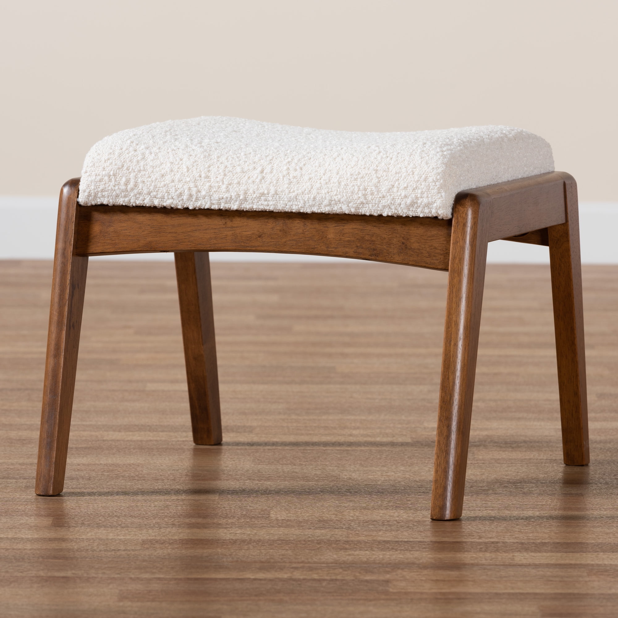 Baxton Studio Roxy Mid-Century Modern Off-White Boucle Upholstered and Walnut Brown Finished Wood Ottoman Footstool