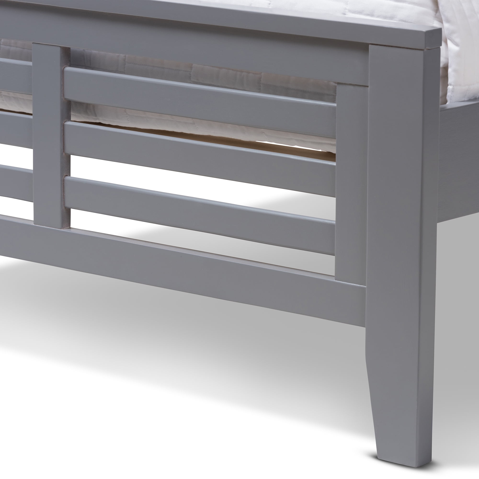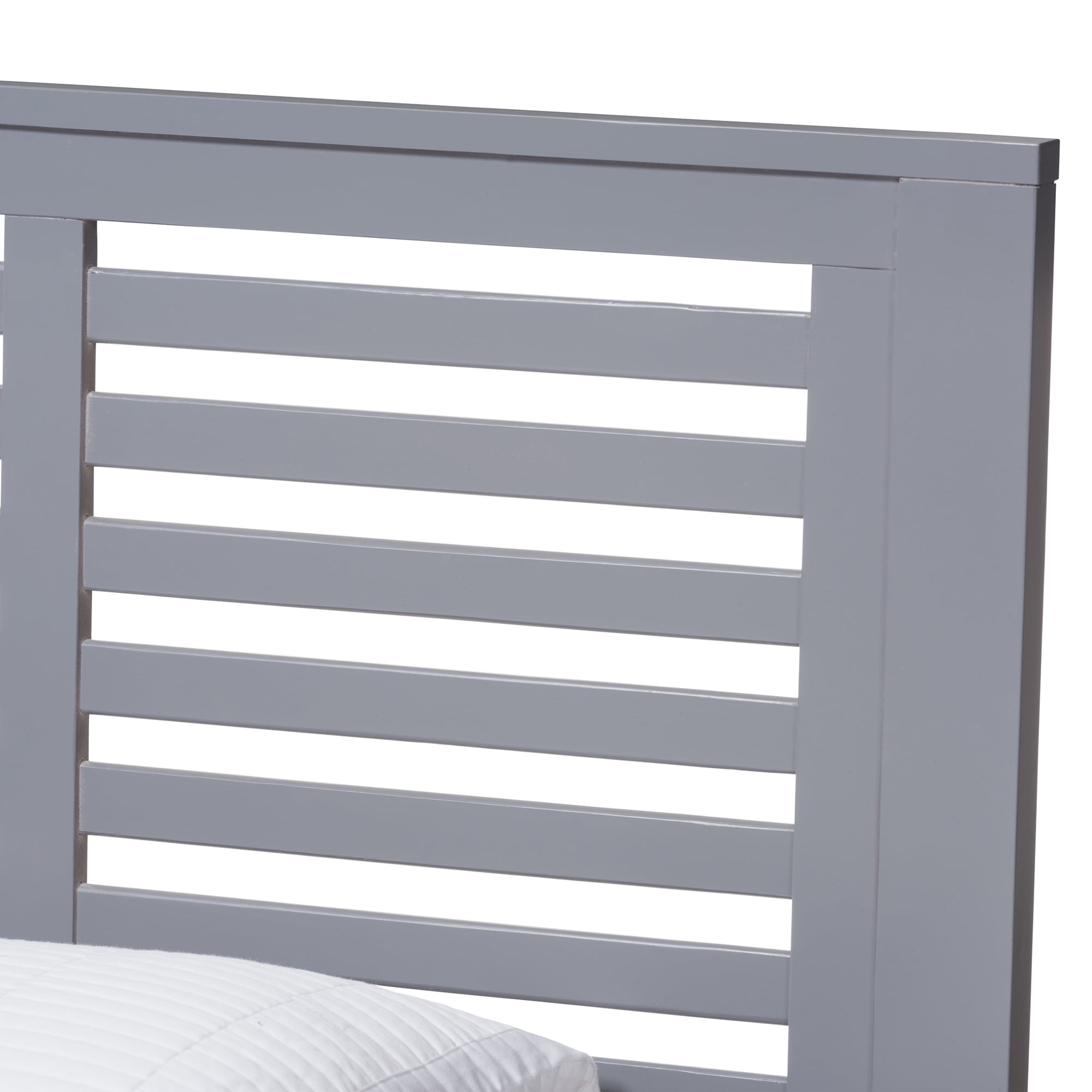Grey-finished wood frame Poplar and rubberwood construction Slatted headboard Fabric Care:Wipe with a dry cloth Product Weight:48.5 Pounds Product Dimensions:Dimensions: 40.55″ High x 40.94″ Wide x 77.01″ Deep- Headboard: 40.94″ Wide x 41.34″ Long x 1.1″ Thick- Siderail: 4.65″ Wide x 74.8″ Long x 0.71″ Thick- Footboard: 17.72″ Wide x 40.94″ Long x 1.1″ Thick- Slats: 2.17″ Wide x 38.98″ Long x 0.63″ Thick- Inside Dimensions (Mattress Size): 39″ Wide x 74″ Deep Product Height:40.55 Inches Product Width:40.94 Inches Product Depth:77.01 Inches Assembly Required:Yes