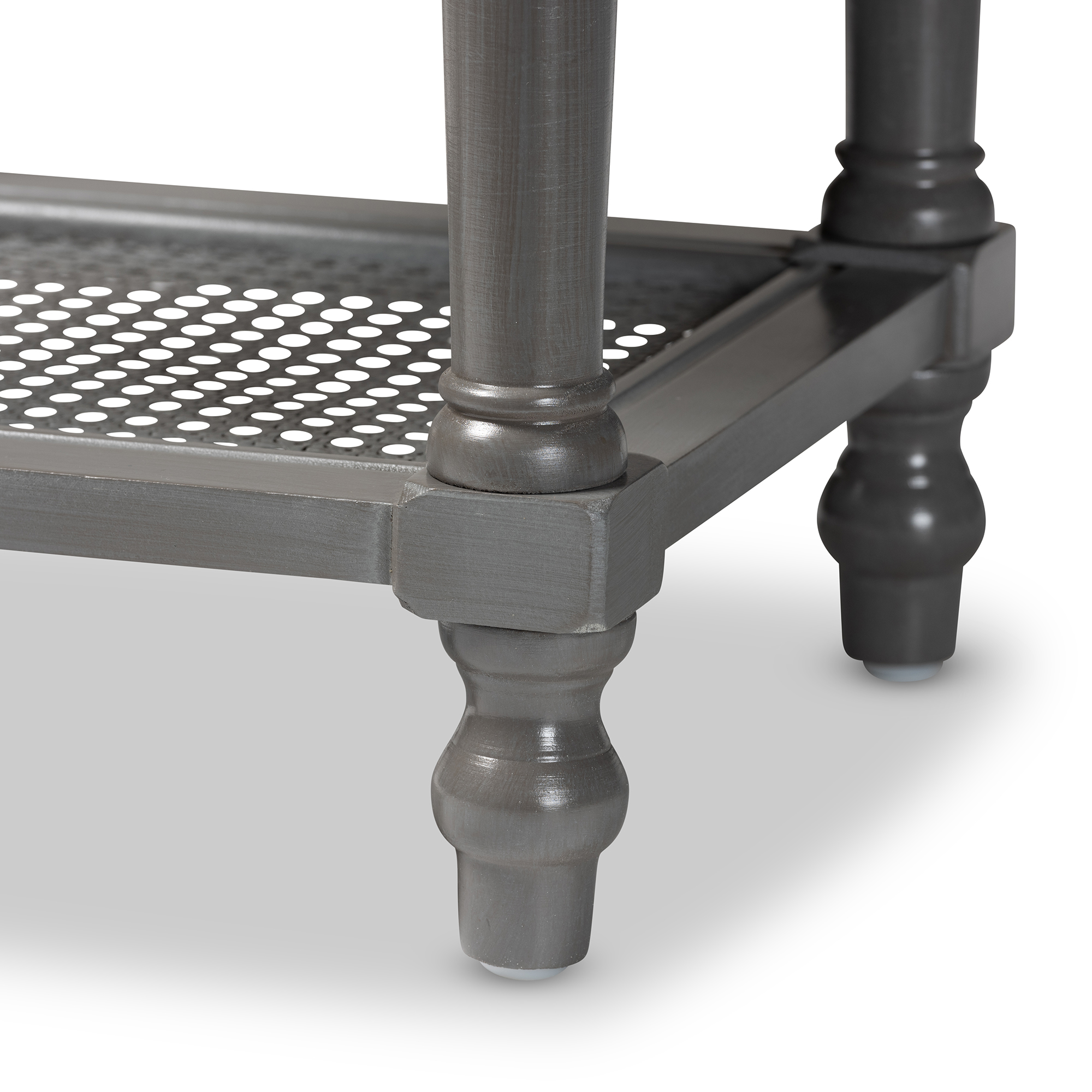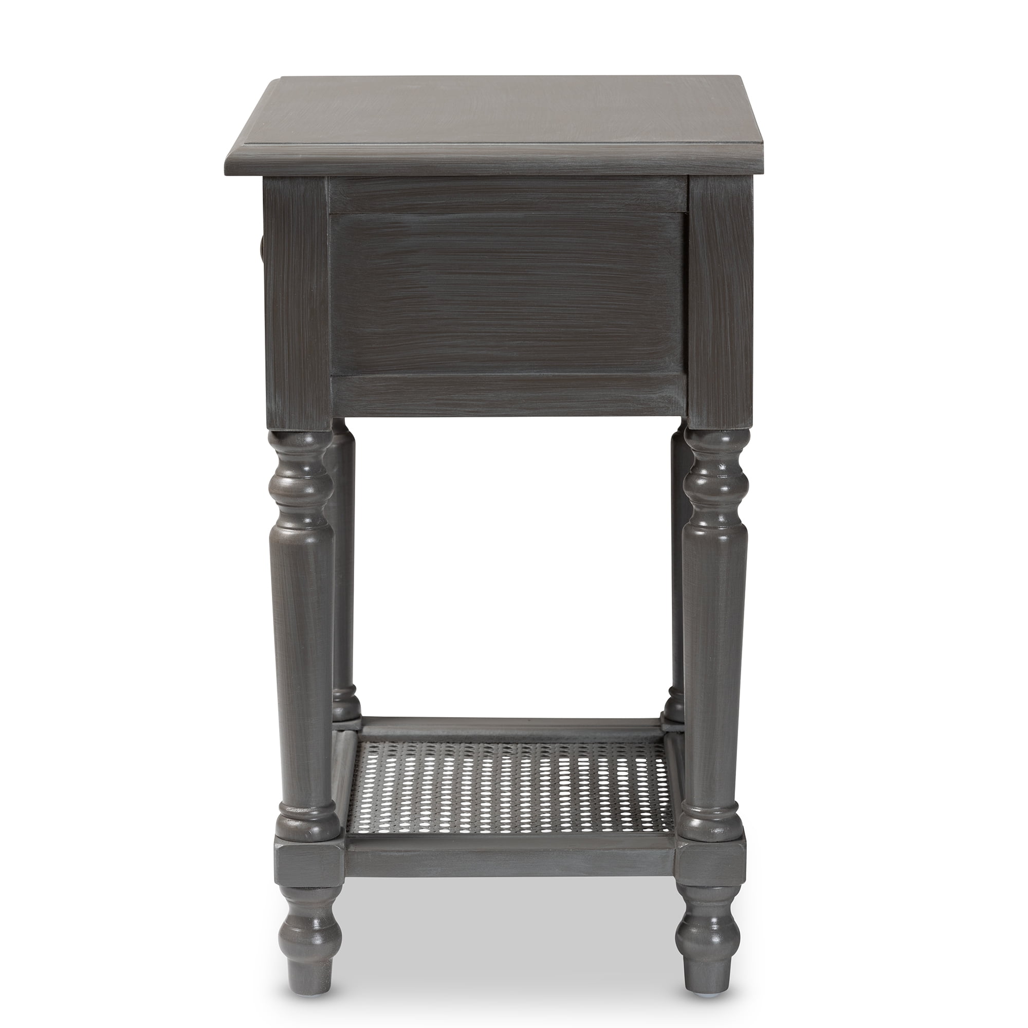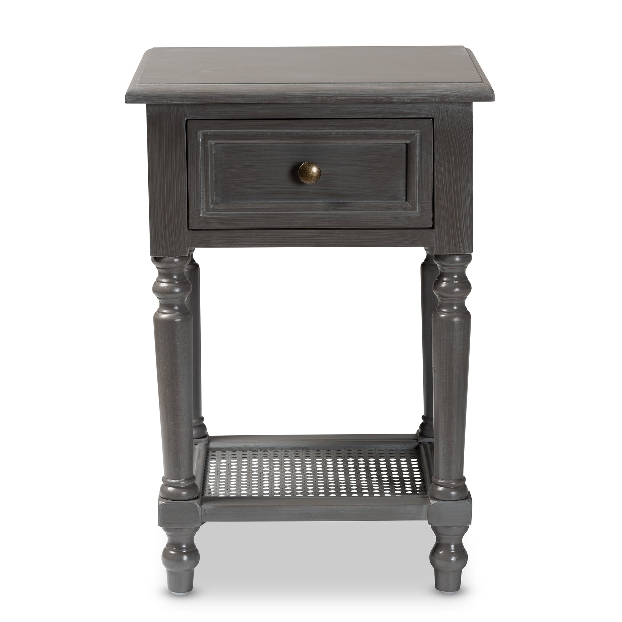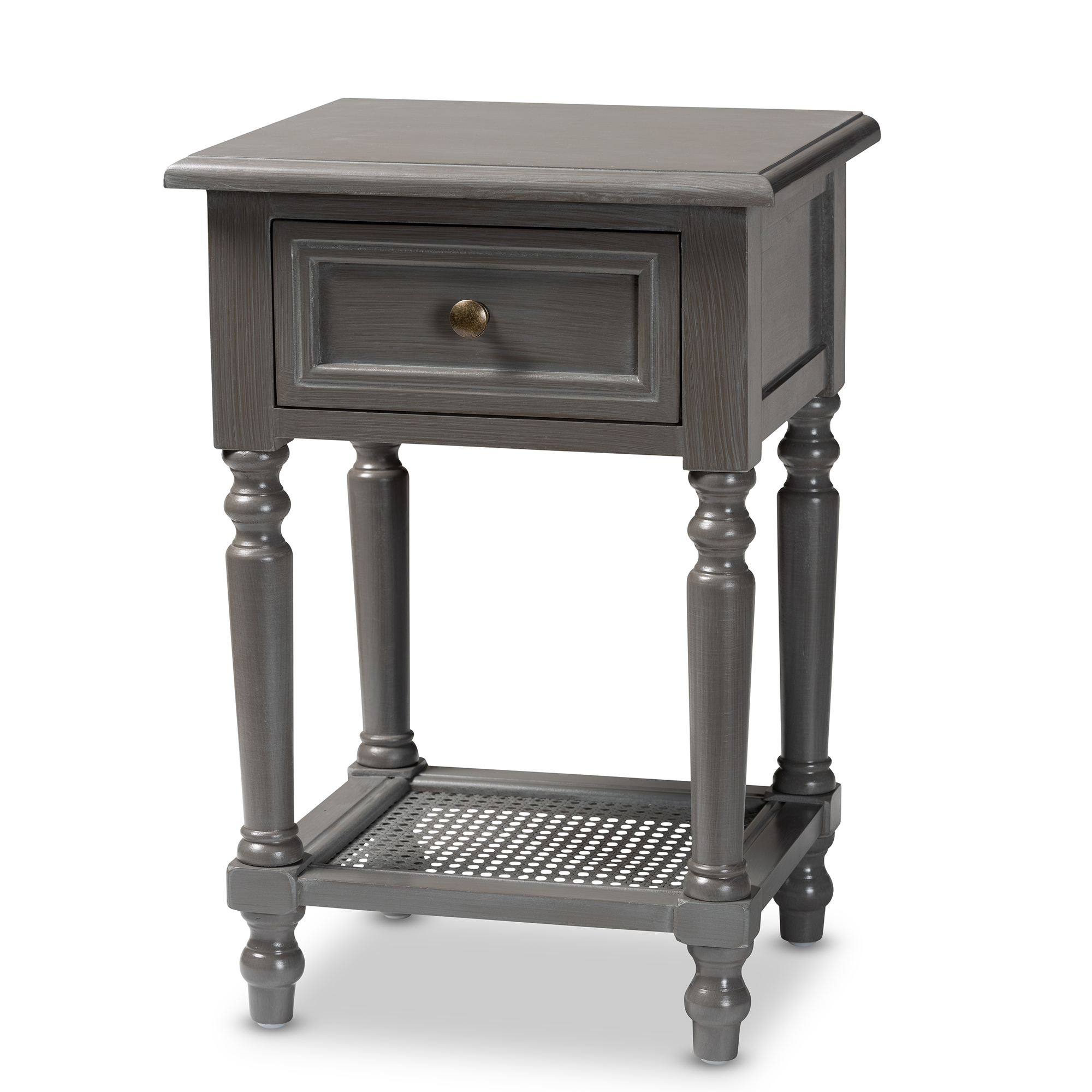 Accommodate your household needs with the timeless design of the Mahoney end table. Made in China, this end table is crafted from sturdy wood with a neutral grey finish that blends well with modern spaces. One drawer offers secure storage for household essentials, while the woven synthetic rattan shelf creates a convenient display for larger items. Requiring assembly, the Mahoney is supported by ring-turned legs for stable support that lends a sophisticated feel. An antique brass finished metal drawer knob adds a vintage touch, making the Mahoney end table a simple yet classy addition to any space.