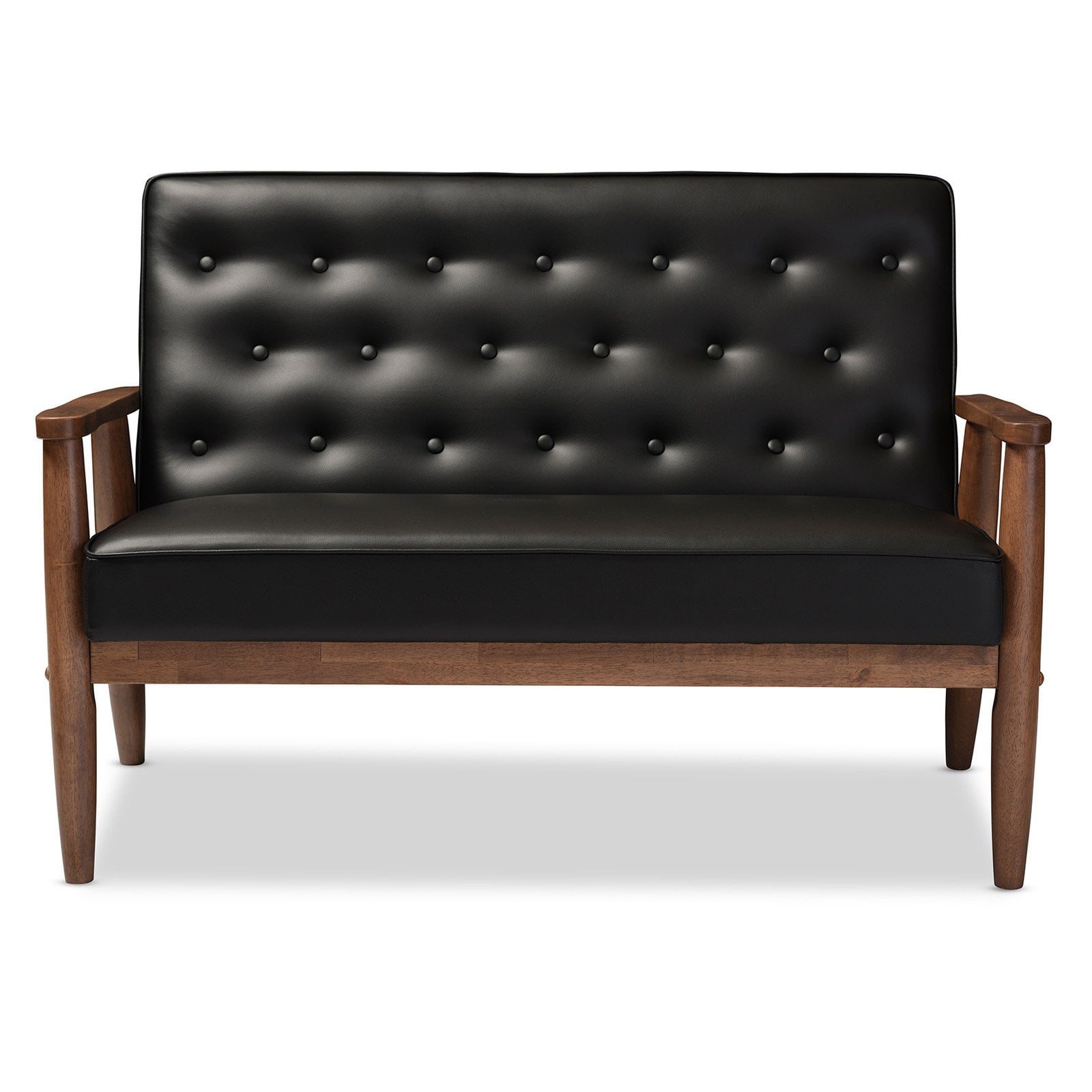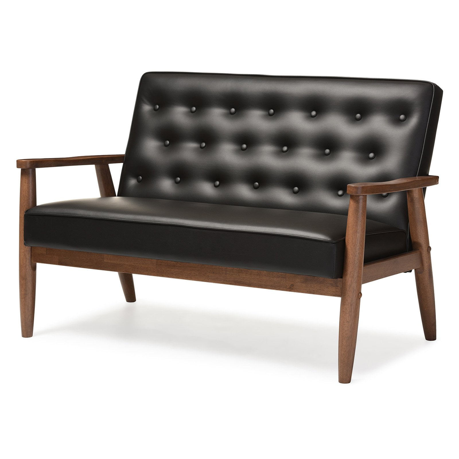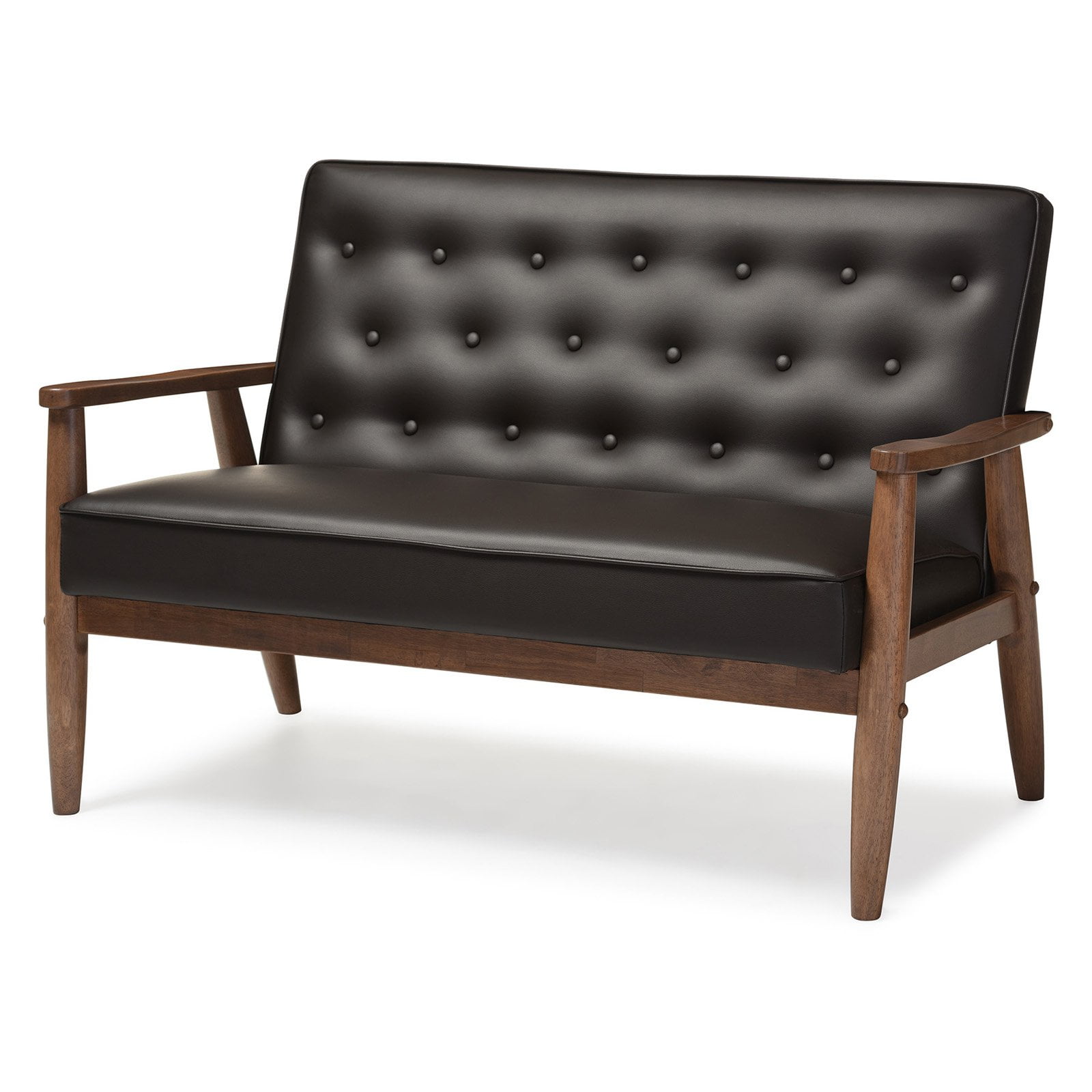 Baxton Studio Sorrento Mid-century Retro Modern Brown Faux Leather Upholstered Wooden 2-seater Loveseat A simple, post-modern design that works well with a variety of styles, the Sorrento 2-seater loveseat is upholstered in brown faux leather with solid rubberwood legs and frame. The sculptural arms and wide, welcoming seat are a throwback to classic 1950s and 60s Danish design. A fully upholstered seat with exposed dark walnut wood looks great from all angles, whether in a lounge arrangement, public waiting area or private office. The splayed legs and button-tufting design add a retro modern touch to this piece of clean lines furniture. The Sorrento features light weight and easy handling. It will be suitable for those urban dwellers with limited space. It could be a cool-looking reading nook within 30 minutes of assembly out of a box. Made in Malaysia, the Sorrento will be a standout piece in any modern interior. Specifications: Mid-century loveseat Finishing: dark walnut Button-tufting with piping on the edges of the cushion Removable cushions with stoppers underneath the seat cushion Rounded armrests with splayed legs Upholstered in dark brown faux leather
