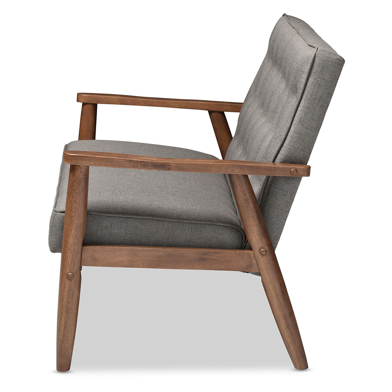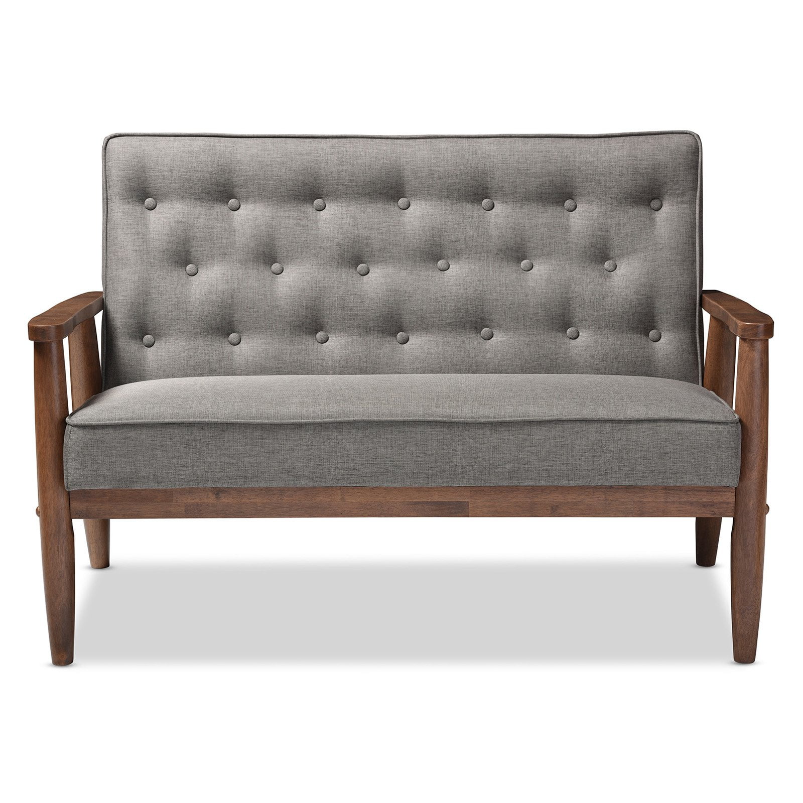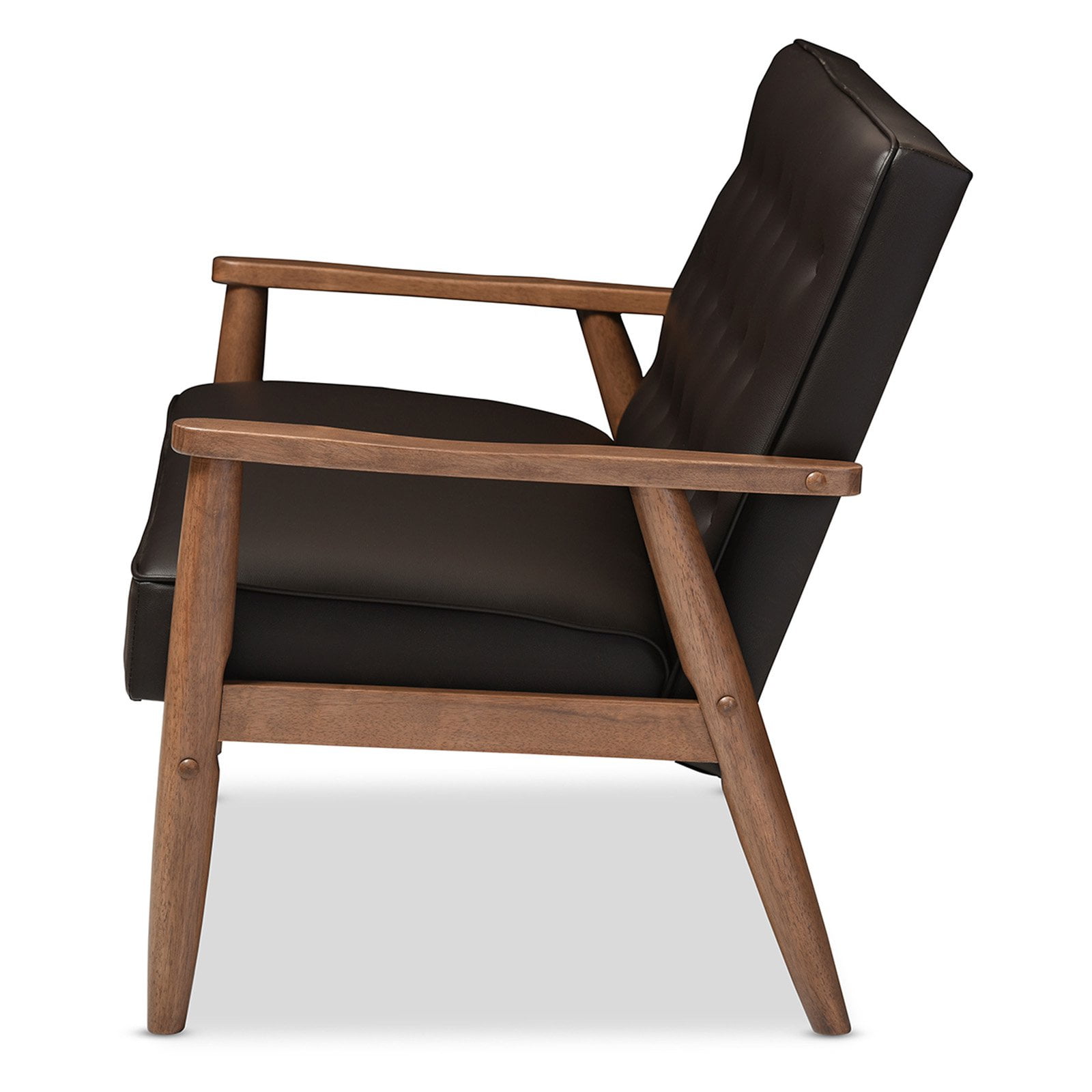 Baxton Studio Sorrento Mid-century Retro Modern Brown Faux Leather Upholstered Wooden 2-seater Loveseat A simple, post-modern design that works well with a variety of styles, the Sorrento 2-seater loveseat is upholstered in brown faux leather with solid rubberwood legs and frame. The sculptural arms and wide, welcoming seat are a throwback to classic 1950s and 60s Danish design. A fully upholstered seat with exposed dark walnut wood looks great from all angles, whether in a lounge arrangement, public waiting area or private office. The splayed legs and button-tufting design add a retro modern touch to this piece of clean lines furniture. The Sorrento features light weight and easy handling. It will be suitable for those urban dwellers with limited space. It could be a cool-looking reading nook within 30 minutes of assembly out of a box. Made in Malaysia, the Sorrento will be a standout piece in any modern interior. Specifications: Mid-century loveseat Finishing: dark walnut Button-tufting with piping on the edges of the cushion Removable cushions with stoppers underneath the seat cushion Rounded armrests with splayed legs Upholstered in dark brown faux leather