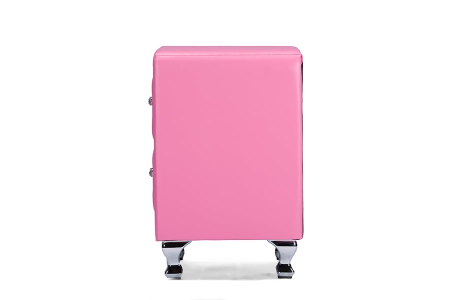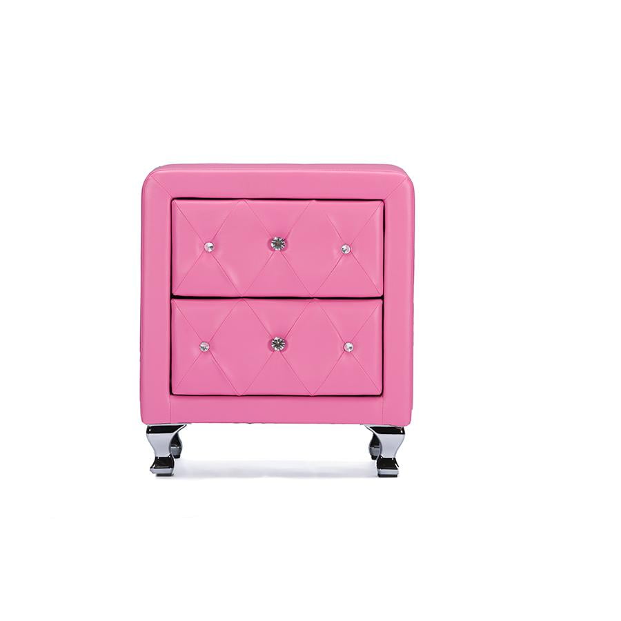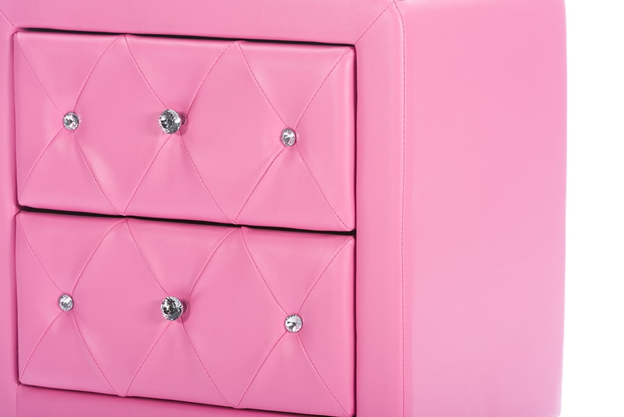 Stella is a glamorous designer nightstand that takes it up a notch with allover faux crystal button tufting. Crystal lookalike buttons adorn the front of the bedside table’s two drawers and truly glimmer with even the slightest bit of light. Pink faux leather is accented by chrome-plated metal legs. This Malaysian-made modern nightstand is built with a plywood and hardwood frame, which is padded with foam before being upholstered. The designer nightstand, which requires minor assembly, is also available in white and black (sold separately). Keep an eye out for the matching bed, floor mirror, and bed-end bench (also sold separately). Features: Rubberwood frame Allover faux crystal button tufting Faux leather Polyurethane foam padding Assembly required