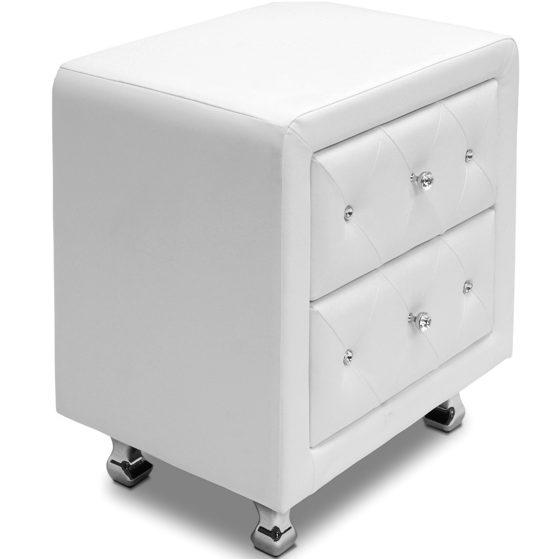 Color: white Drawer Dimension: 5.62″ H x 14.5″ W x 12.75″ D Includes 2 drawers Made of faux crystal, faux leather, metal and wood Crystal buttons upholstered and drawer Pulls Polyurethane foam padding Chrome-plated steel legs Product Weight: 30lbs