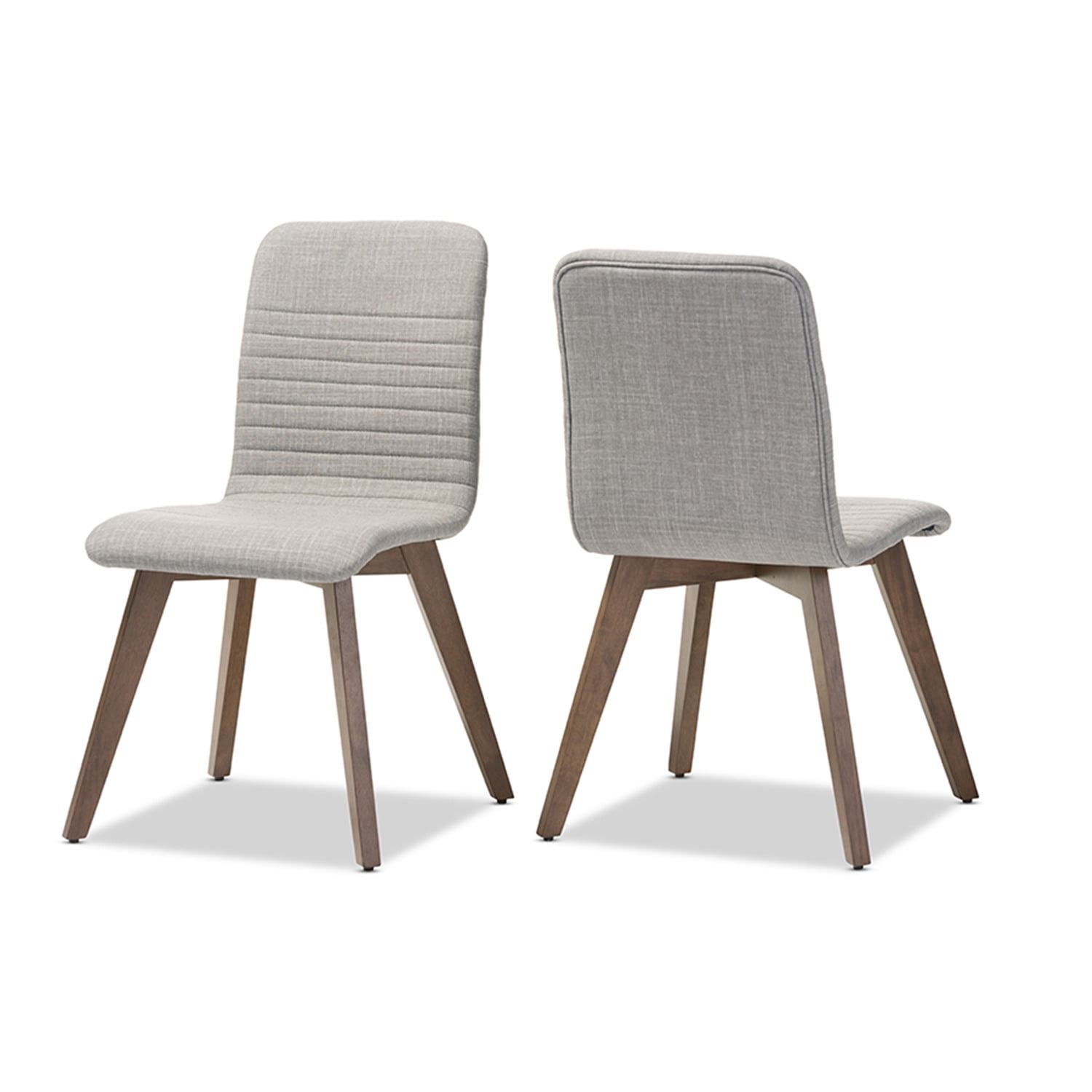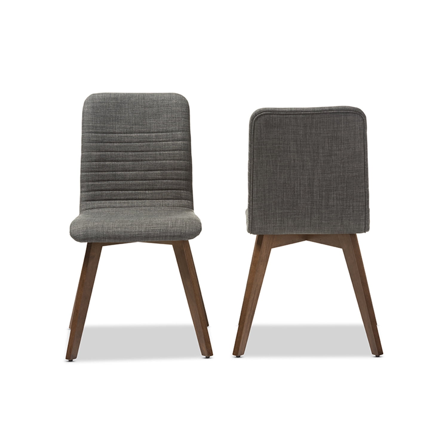 Baxton Studio Sugar Mid-century Retro Modern Scandinavian Style Dark Grey Fabric Upholstered Walnut Wood Finishing Slightly contoured for comfort and luxury in its modern color, the Sugar Mid-century Retro Modern Scandinavian Style Light Grey Fabric Upholstered Walnut Wood Finishing Dining Chair is the perfect addition to your dining table. Featuring durable solid rubberwood frame, the dining chair is built for exceptional durability and stable comfort. Upholstered in polyester for luxurious comfort and resilience against day-to-day wear, the Sugar is perfect for everyday seating around your dining table, mixing and matching with other colors for a pop of modernity. Contoured seat for comfort, with shapely legs, the Sugar combines retro design with contemporary good looks. The striped design in grey tone complements the walnut finished rubberwood legs for a modish palette. Made in Malaysia, the Sugar requires assembly. Specifications: Mid-century modern dining chair Dark grey fabric upholstery Contoured back with stripped design Shapely legs Padded seat Assembly required
