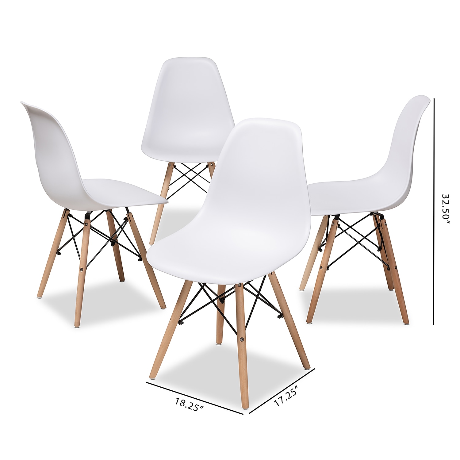 Baxton Studio Sydnea Mid-Century Modern White Acrylic Brown Wood Finished Dining Chair (Set of 4) The Sydnea dining chair combines practicality and comfort in an iconic look. The white acrylic seat and chair back are formed to contour the seaters body, with clear inspiration from mid-century modern design. The Sydnea features metal legs covered in beech wood tubes with a natural brown finish, with metal crisscross supports between them. This dynamic chair can add sophistication and a retro flair to your dining room, reception area, or other shared spaces. The Sydnea can even look right at home in your nursery or entryway. Made in China, the chair requires assembly. Specifications: Mid-century modern dining chair White acrylic seat and chair back Metal legs with beech wood covering Seat and chair back contoured to fit the seater Criss-cross metal support design between the legs Assembly required Made in China