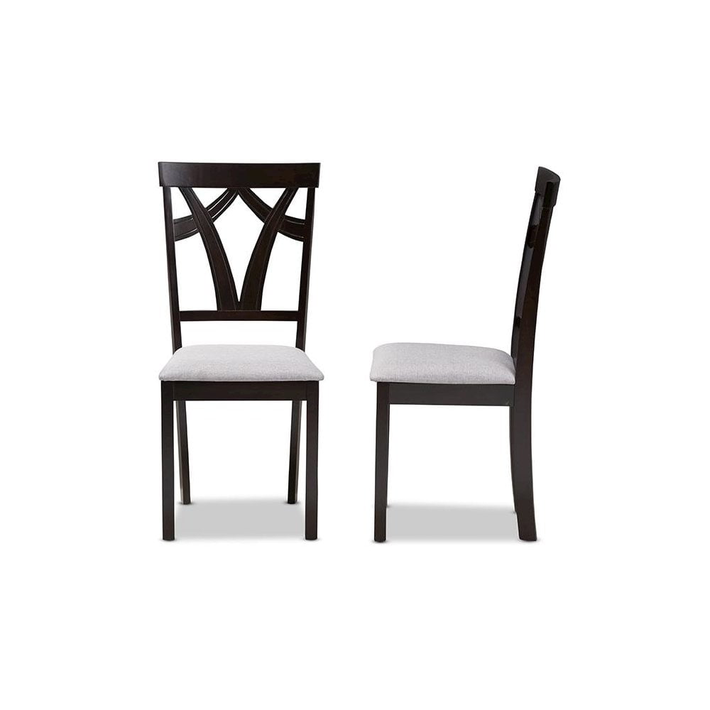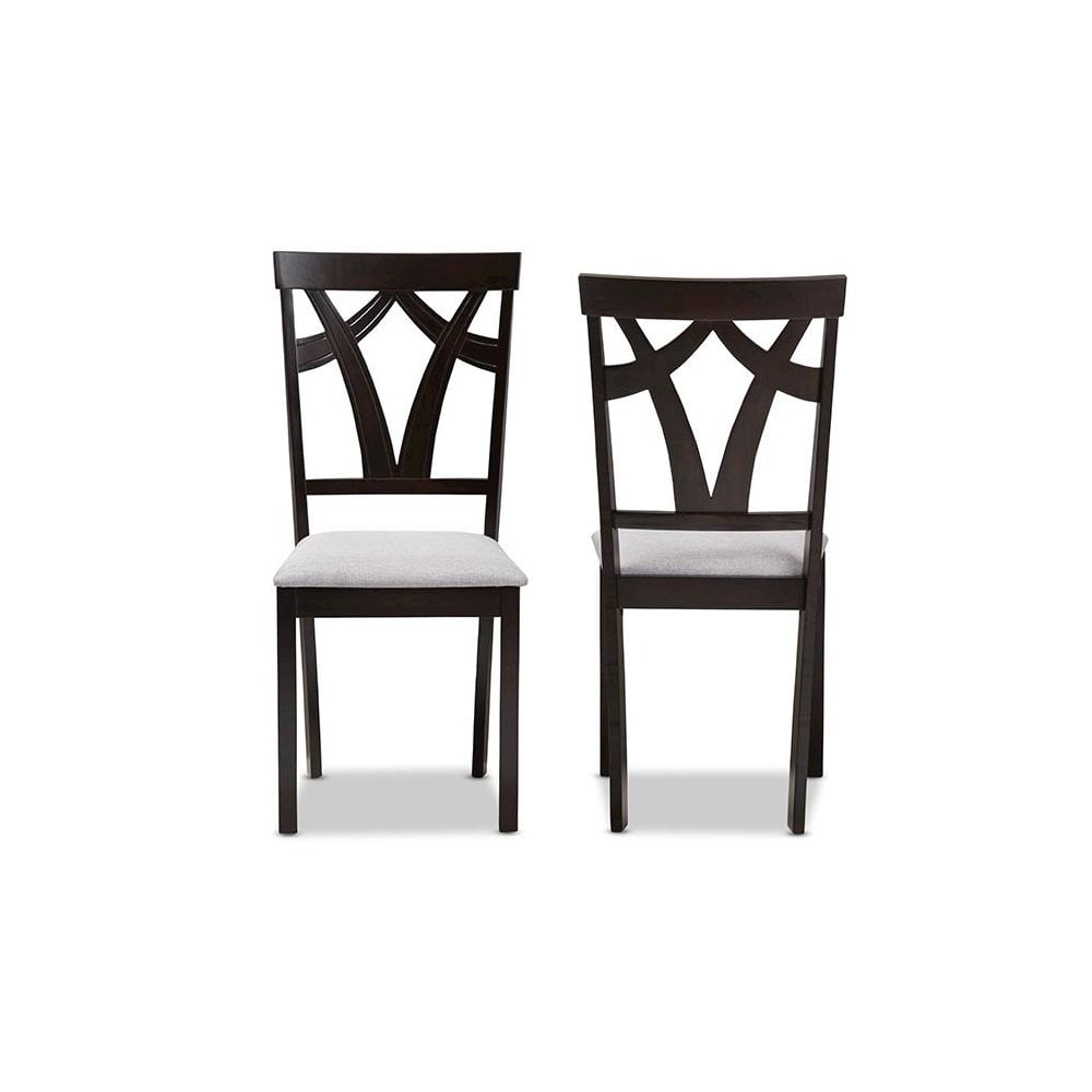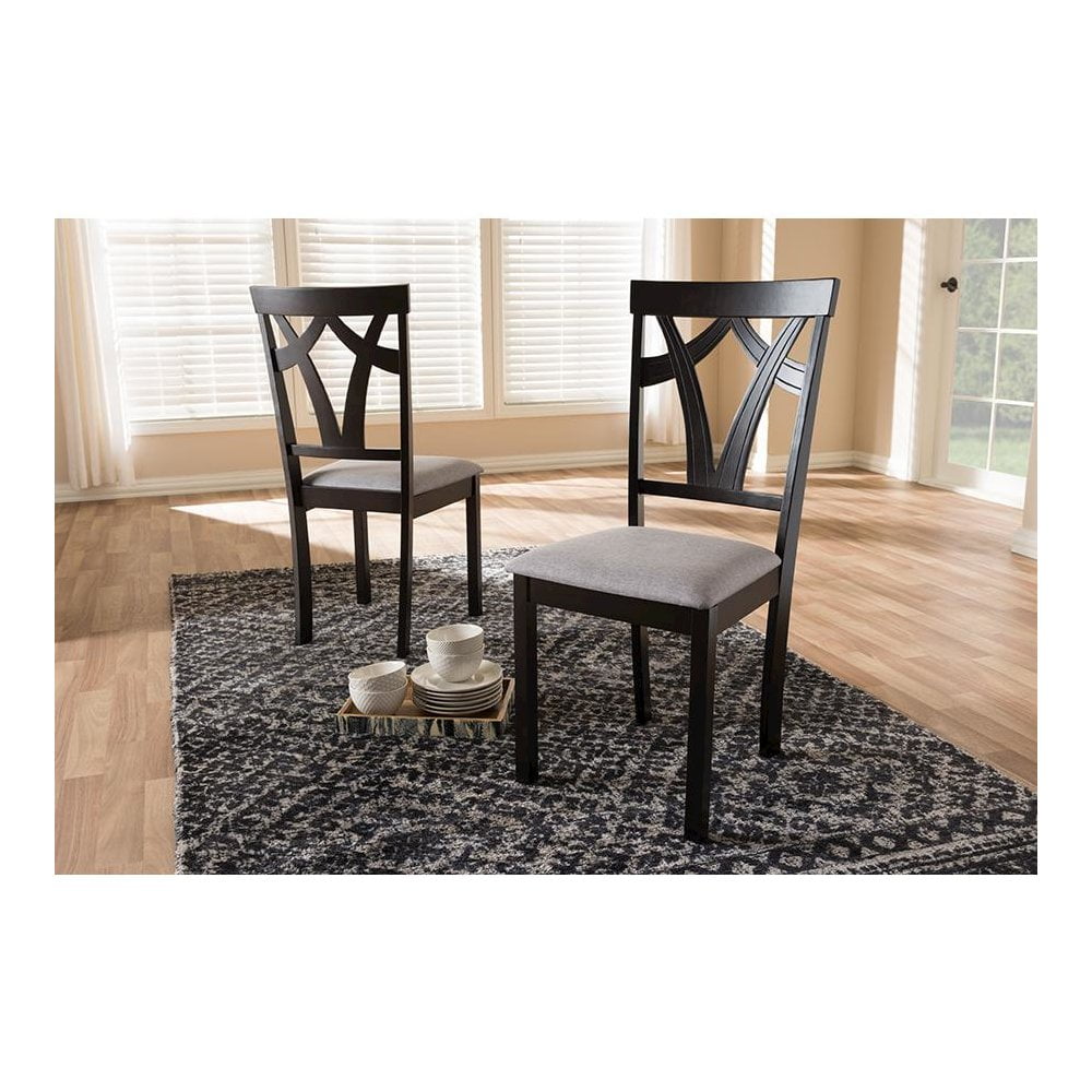 Versatile palette and contemporary form for a dynamic piece in your dining room, the Sylvia set of two dining chair set features practical casual dining chairs for compact spaces. Constructed of solid rubberwood frame, the dining chair set is upholstered in gray polyester fabric, instantly updating your dining room for an on-trend look. Featuring geometric seat back, the Sylvia dining chair set is foam padded, ensuring comfortable seating experience while you enjoy dinners with friends and family. Features: Finish: Gray and Brown Seating Dimensions: 18.11″ H (from Floor) x 16.93″ W x 15.16″ D Material: Fabric Polyester 100%, Solid Rubberwood, Foam Back Height: 37.01″ Style: Contemporary Set includes two chairs Tapered legs Assembly required Care Instruction: Spot clean only Warranty: 30 Days limited Specifications: Product Dimensions: 37.01″ H x 17.36″ W x 17.99″ D Product Weight: 22 lbs Leg Dimensions: 16.54″