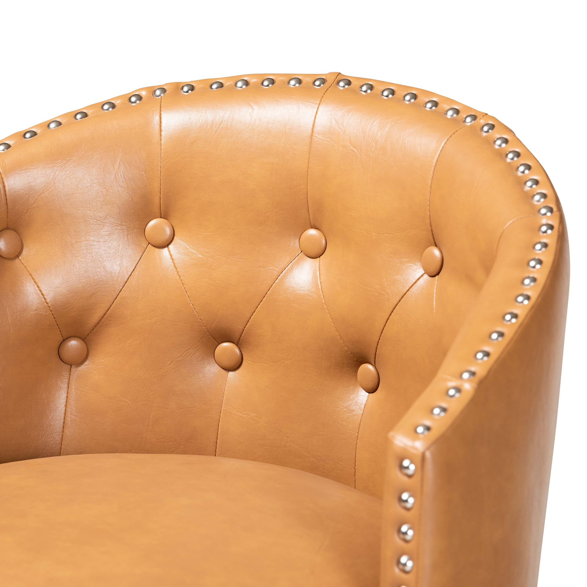 • Set includes two (2) bar stools • Constructed from rubberwood and engineered wood • Dark brown finish • Upholstered in faux leather and padded with foam • Swivel seat • Accented with button tufting and silver finished metal nailheads • Assembly required • Product Weight: 23.8 Pound • Package Weight: 53.4 Pound • Dimensions: 41.1″ High x 21.7″ Wide x 21.7″ Deep; Seat Dimensions: 30.9″ High(From Floor) x 17.7″ Wide x 17.7″ Deep; Arm Height (from floor): 35″ High; Back: 10.2″ High; Legs: 24.8″ High; • Product Color: Tan/Dark Brown • Product Composition: Faux Leather/MDF/Foam/Rubberwood