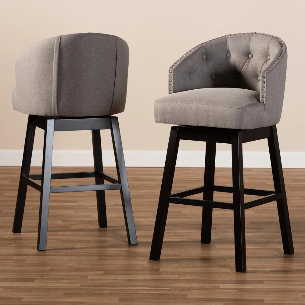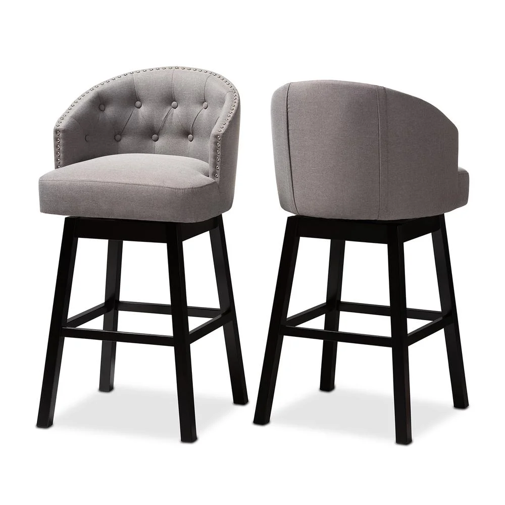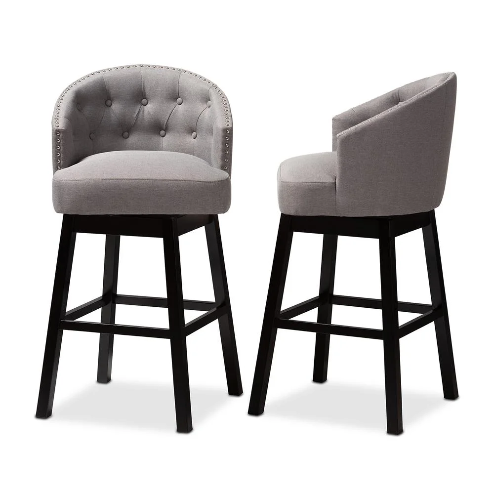 Baxton Studio Theron Transitional Gray Fabric Upholstered Wood Swivel Bar Stool Set of 2 Bring happy hour to your home with the elegant Theron bar stool. Constructed from solid rubberwood, the Theron showcases a stunning dark brown finish. The seat and back are upholstered in polyester fabric and padded with foam for endless comfort as you sip cocktails. A built-in foot rest provides additional comfort, while button tufting and silver-finished nailheads add a touch of glamour. Equipped with swivel capability, the Theron is well suited for both a kitchen or bar setting. The Theron bar stool is made in Malaysia and requires assembly. Specifications: Constructed from rubberwood in an espresso finish Polyester fabric upholstery Swivel capability Foot rest Button tufted Silver-finished nailheads Assembly required