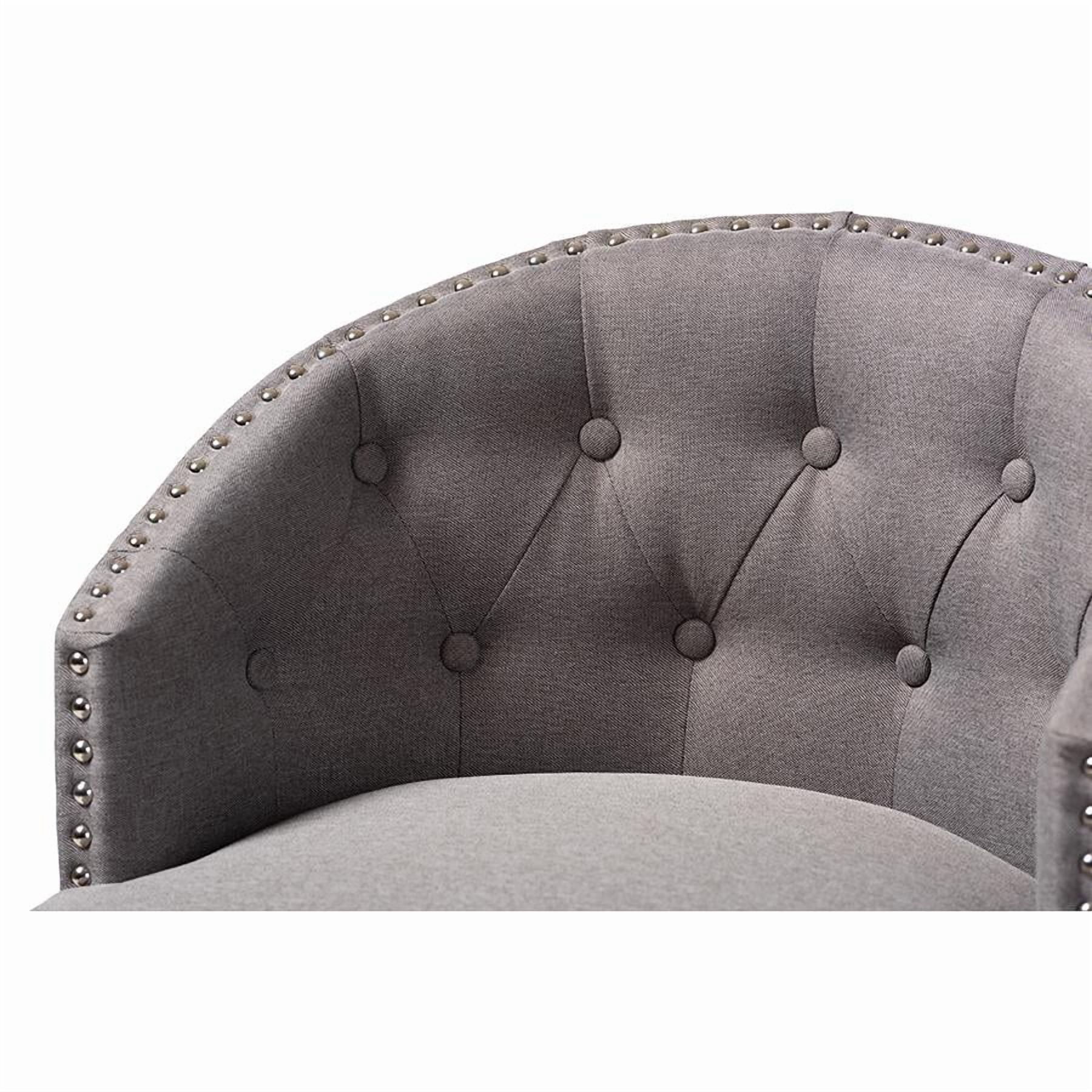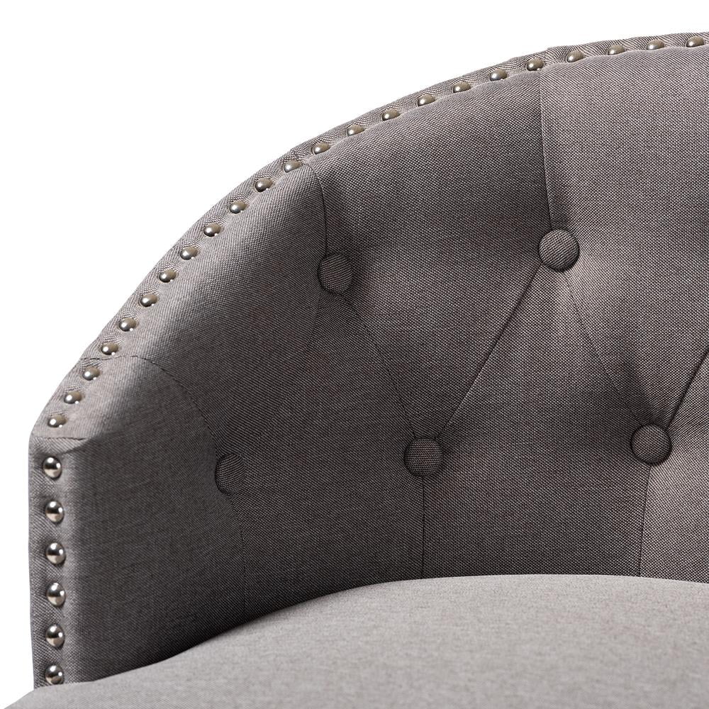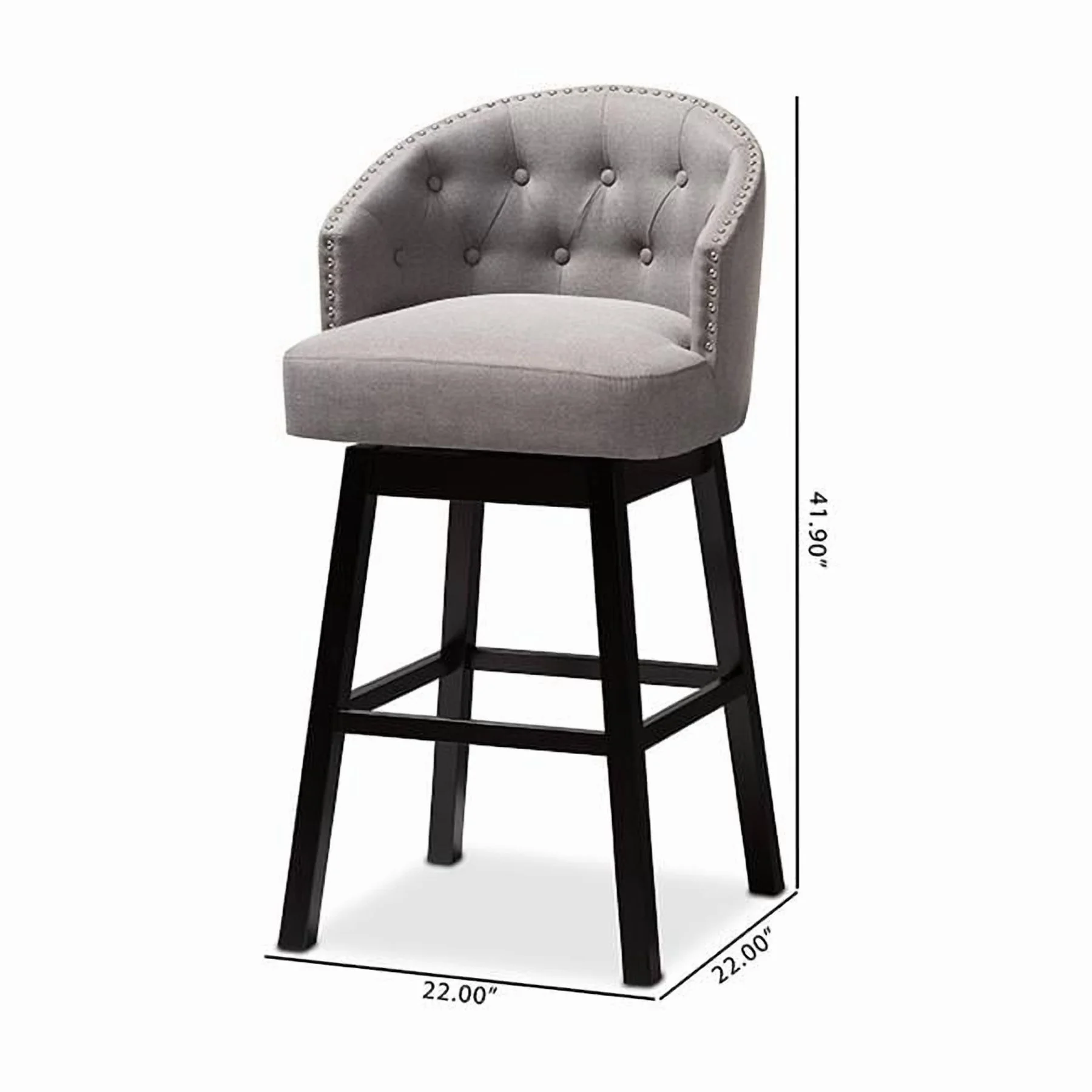 Baxton Studio Theron Transitional Gray Fabric Upholstered Wood Swivel Bar Stool Set of 2 Bring happy hour to your home with the elegant Theron bar stool. Constructed from solid rubberwood, the Theron showcases a stunning dark brown finish. The seat and back are upholstered in polyester fabric and padded with foam for endless comfort as you sip cocktails. A built-in foot rest provides additional comfort, while button tufting and silver-finished nailheads add a touch of glamour. Equipped with swivel capability, the Theron is well suited for both a kitchen or bar setting. The Theron bar stool is made in Malaysia and requires assembly. Specifications: Constructed from rubberwood in an espresso finish Polyester fabric upholstery Swivel capability Foot rest Button tufted Silver-finished nailheads Assembly required