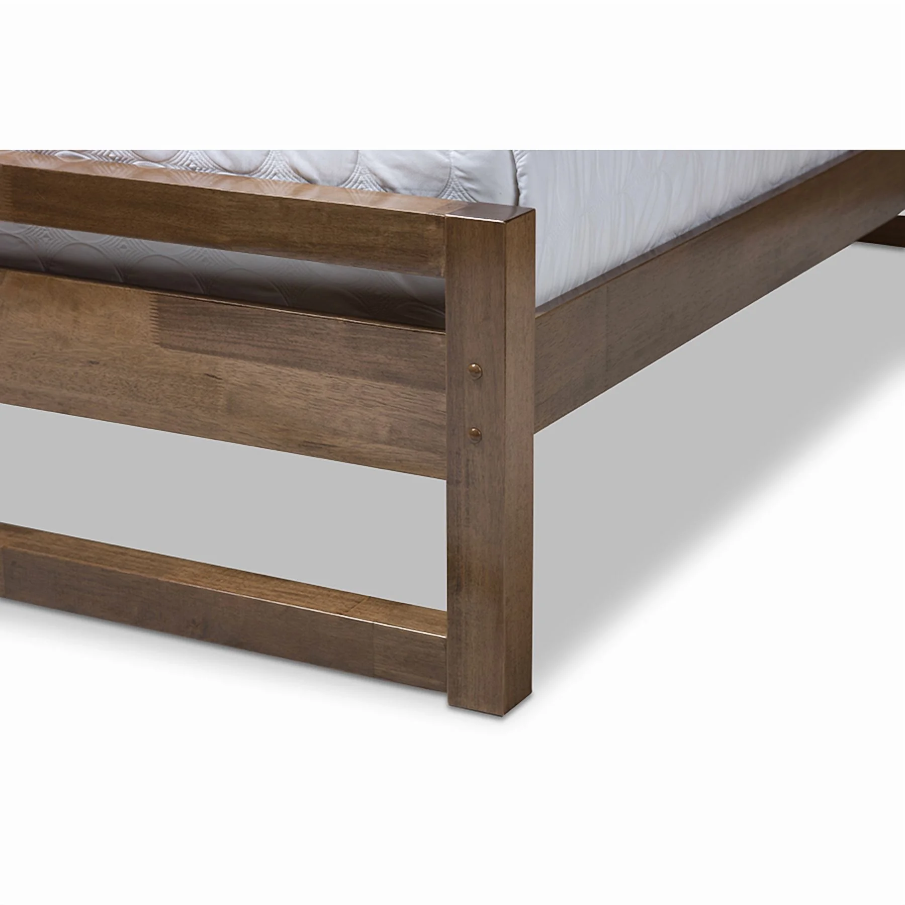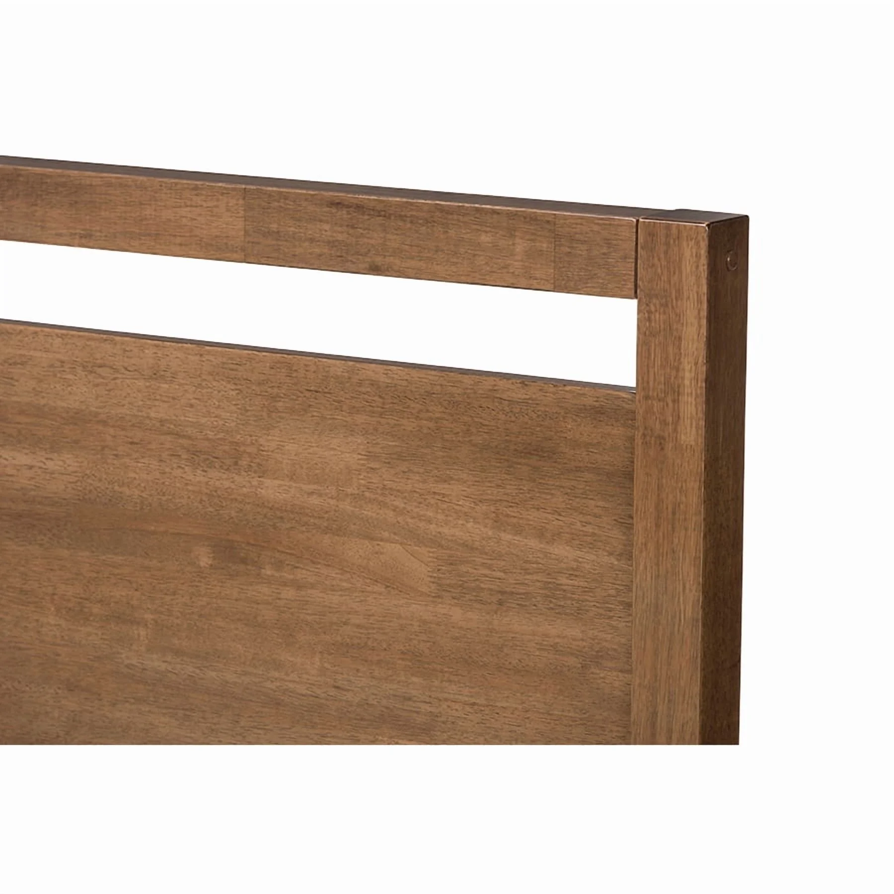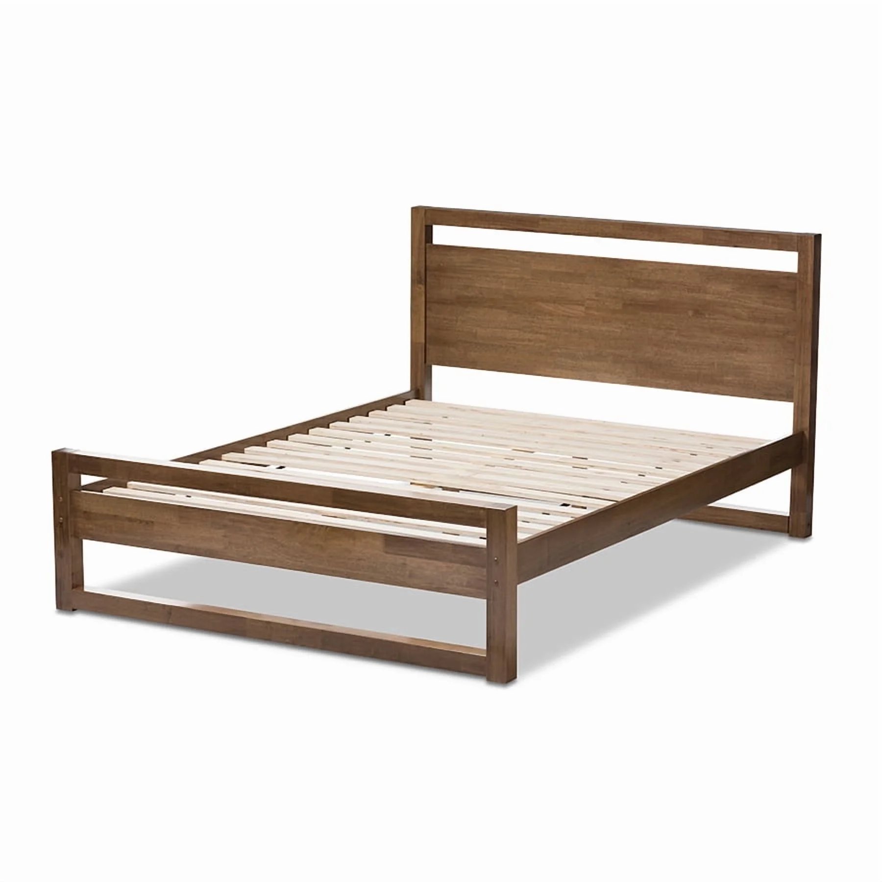 Baxton Studio Torino Mid-Century Modern Solid Walnut Wood Open Frame Style King Size Platform Bed Clean and simple details define the Torino platform bed. The Torino bed offers a minimalist design with solid construction that will enhance any room. The headboard and frame feature a crisp profile with open space elements that create a casual and breezy feel in your bedroom. Constructed of solid rubberwood frame, the platform bed is finished in walnut for a modern Scandinavian inspired Styling. The Torino platform bed is designed for use with a mattress only, which is supported with slat system, eliminating the need for a box spring. Available in full, queen and king sizes, this platform bed is made in Malaysia. Assembly required. Specifications: Mid-century platform bed Walnut finishing Open framing on headboard and footboard Solid rubberwood on headboard and footboard Mattress not included Made in Malaysia Assembly required