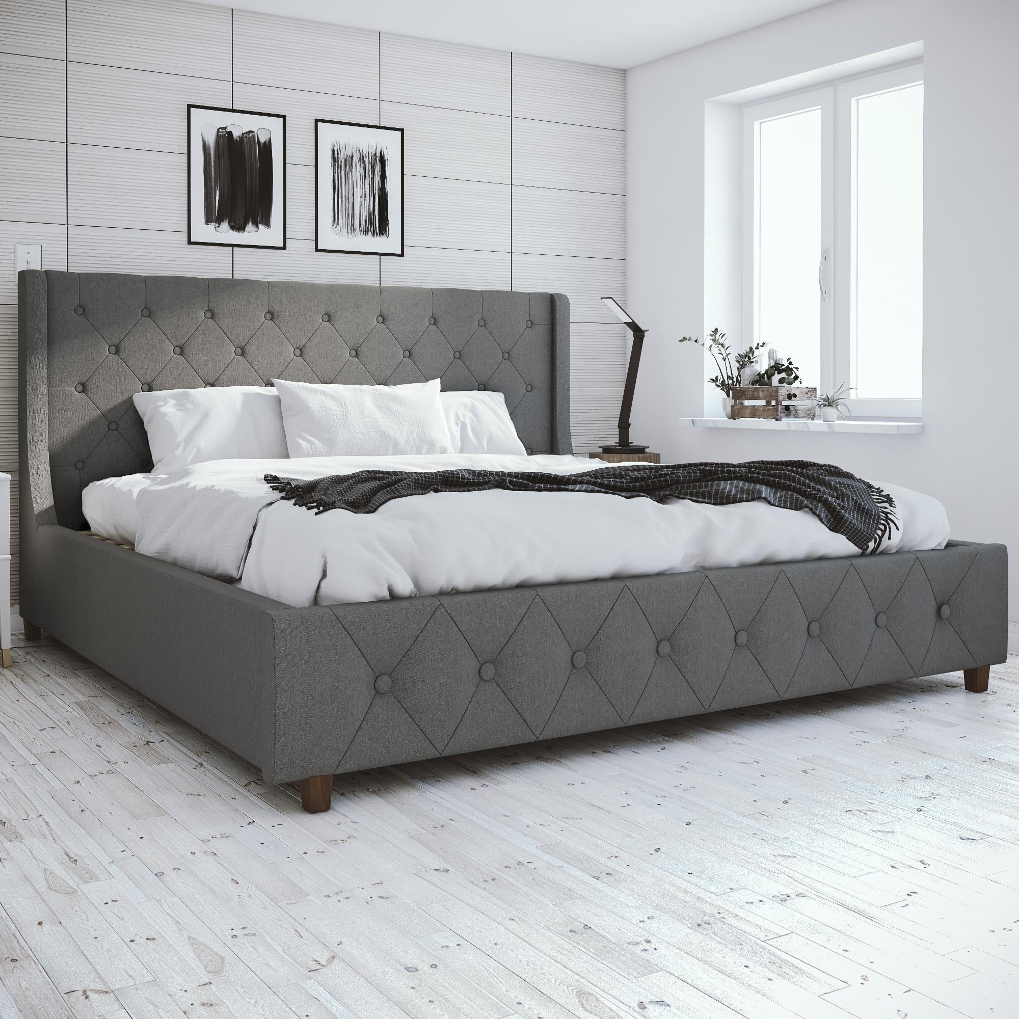Mid-century platform bed Walnut finishing Open framing on headboard and footboard Solid rubberwood on headboard and footboard Mattress not included Made in Malaysia Assembly required