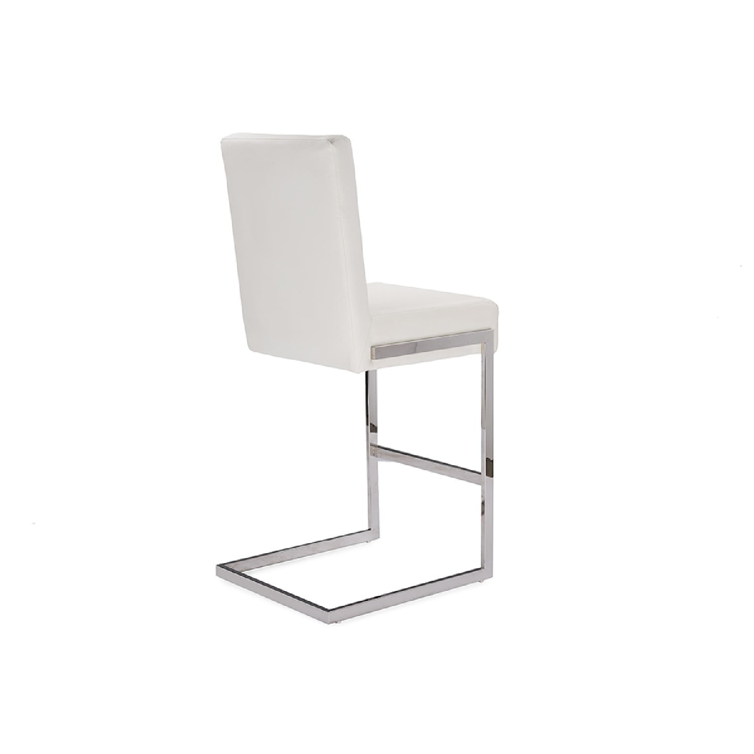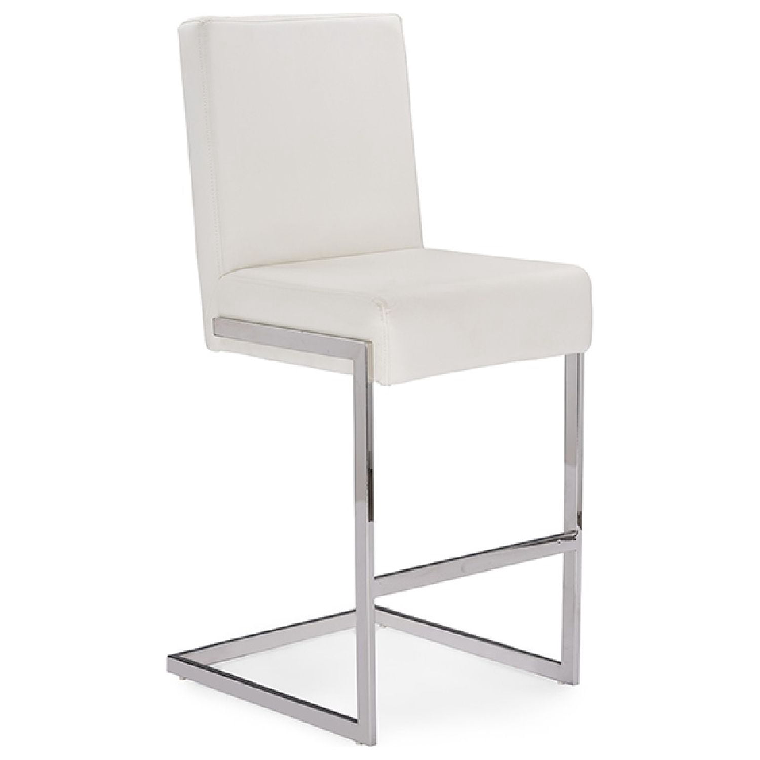 Modern and contemporary upholstered Barstool Clean lines and geometric design High-polished stainless steel sled base frame Faux Leather to complete the look Plush foam filled ultra thick cushion