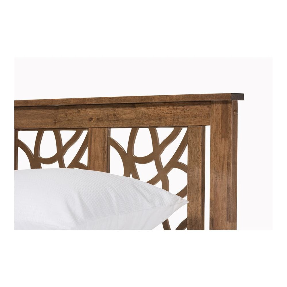 Modern platform bed Tree branches inspired headboard Tapered legs Walnut brown wood finishing Self-assembly required Made in Malaysia