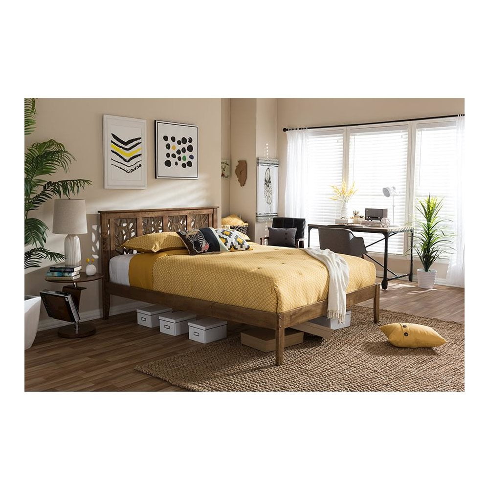 Trina Contemporary Tree Branch Inspired Walnut Wood King Size Platform Bed The Trina queen size platform bed is a showstopper centerpiece! The intricate headboard panel features a branchlike design with the innermost pieces made of brown polyresin to match the outer bedframe. This platform bed includes slats for support, which eliminate the need for a box spring. We use eco-friendly solid rubberwood and poplar for the bedframe, which is finished with a walnut stain. The Trina Bed is flat-packed, made in Malaysia, and requires assembly. Modern platform bed Tree branches inspired headboard Tapered legs Walnut brown wood finishing Self-assembly required Made in Malaysia